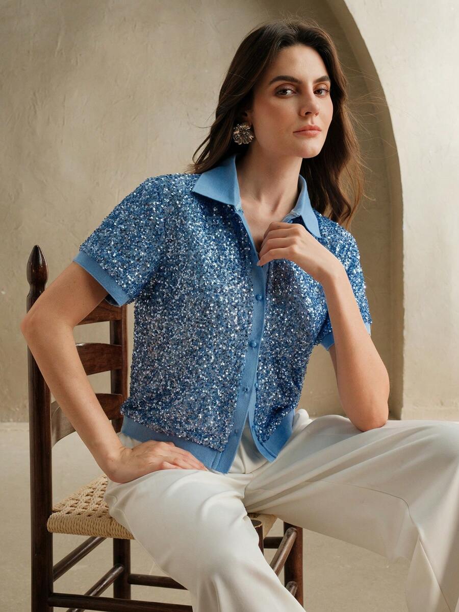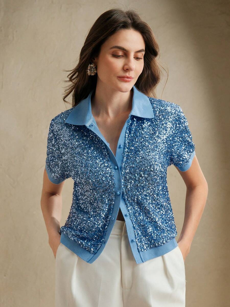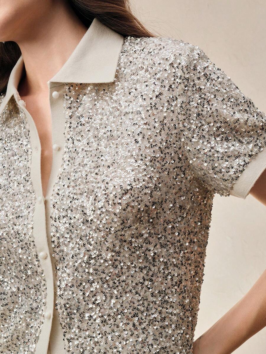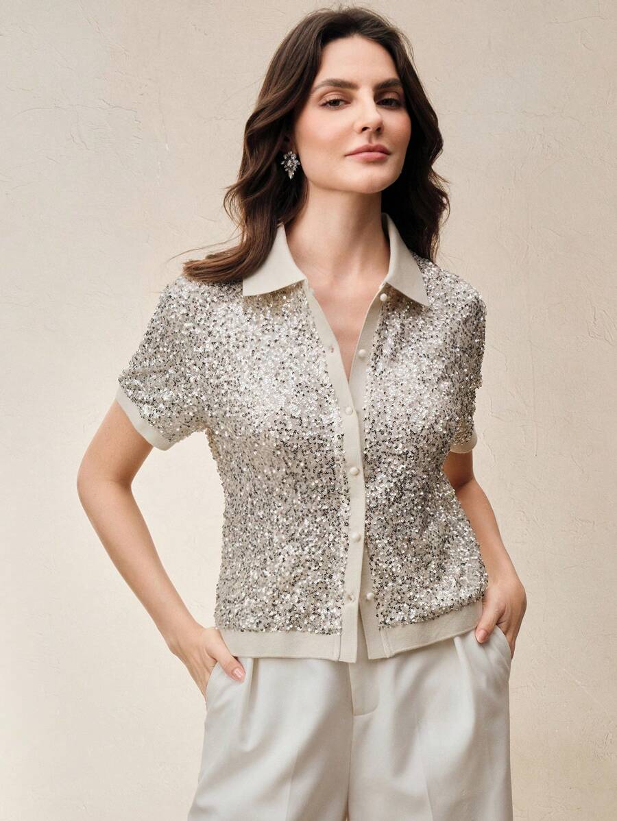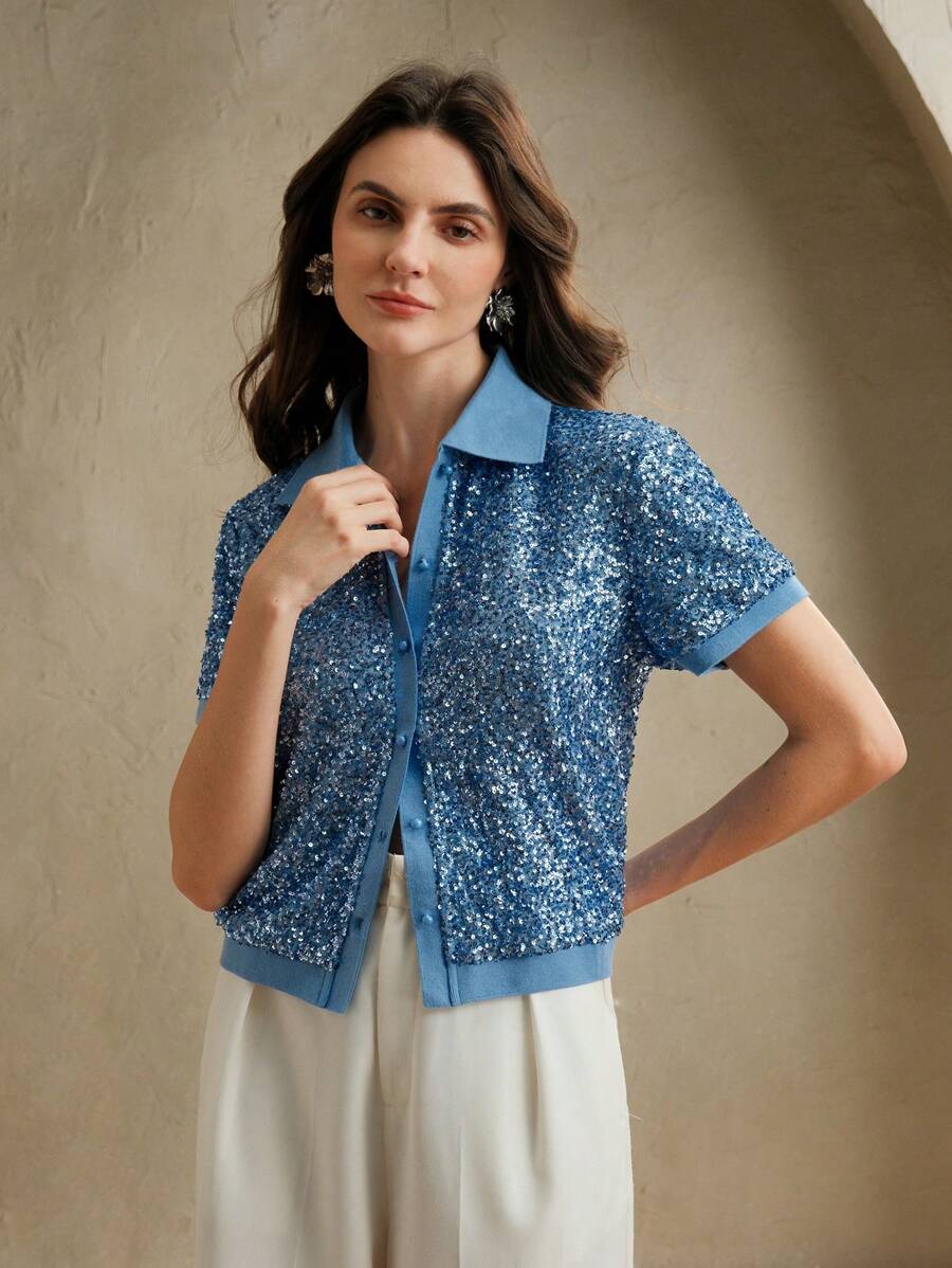 MIU Sparkly Sequin Polo Collar Short Sleeve Front Open Women T-Shirt, Holiday Party, Spring/Summer