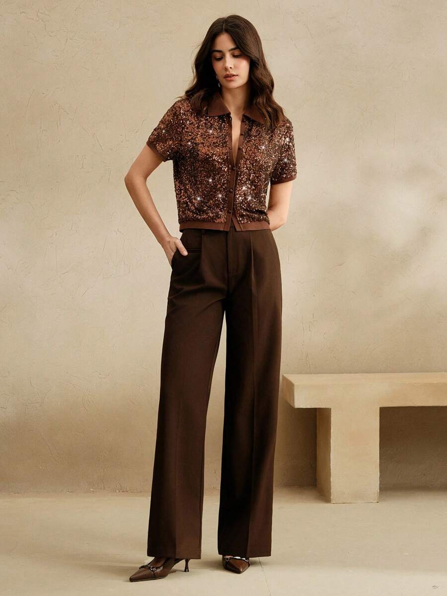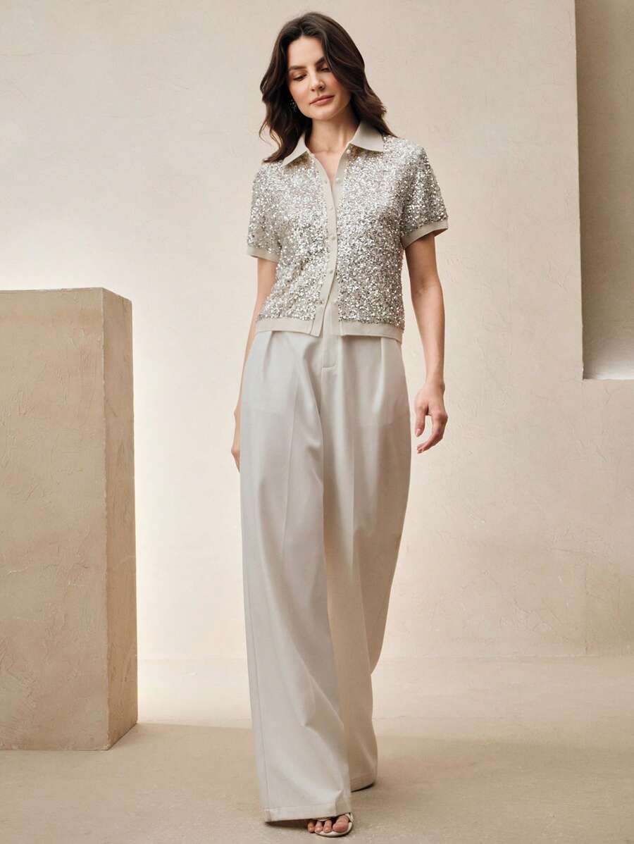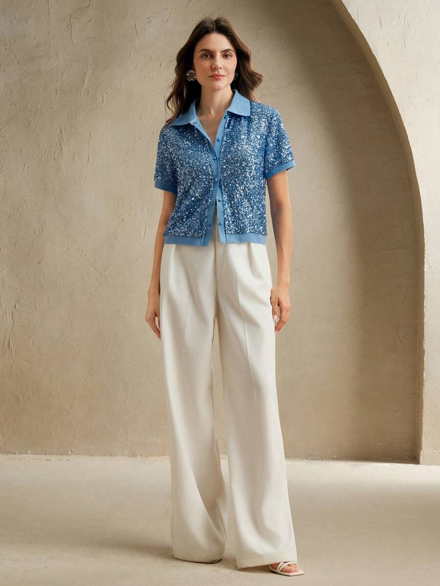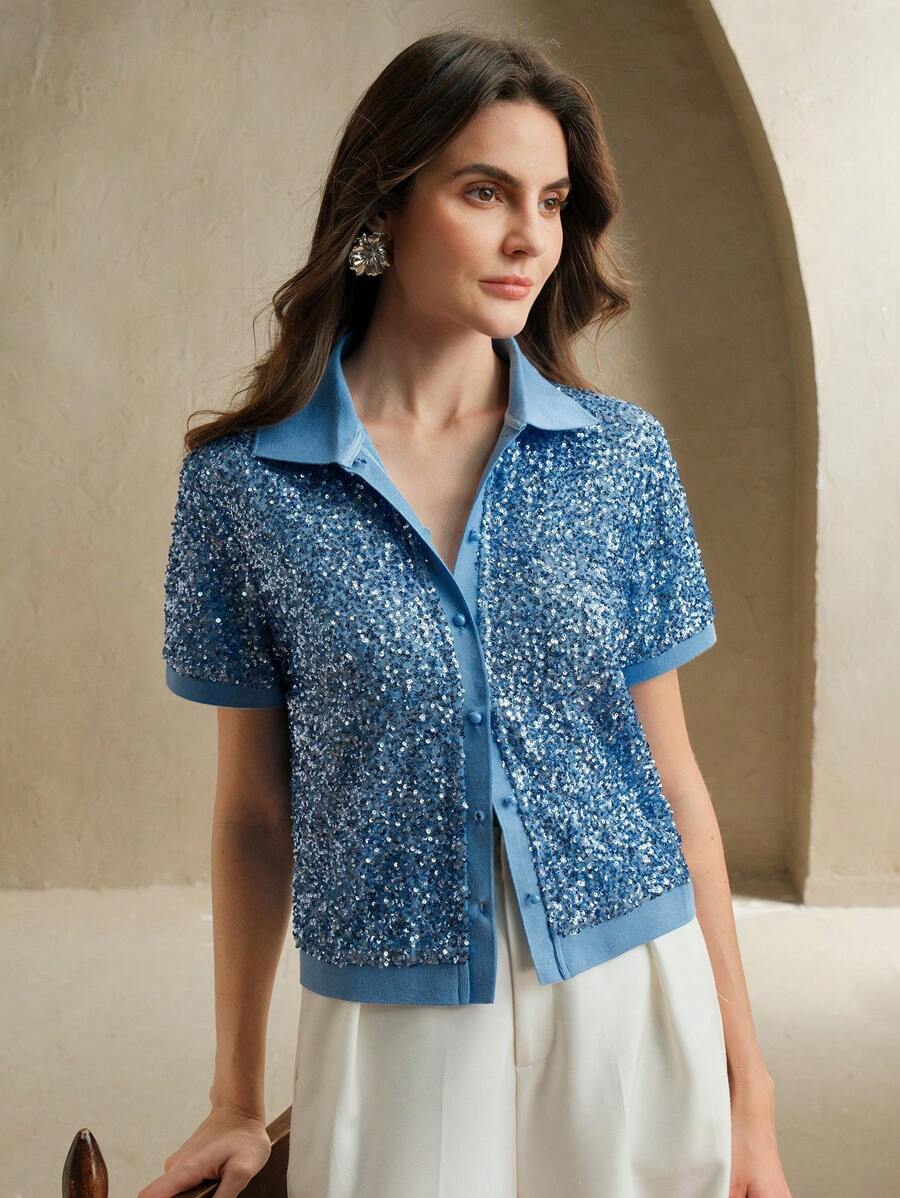 MIU Sparkly Sequin Polo Collar Short Sleeve Front Open Women T-Shirt, Holiday Party, Spring/Summer