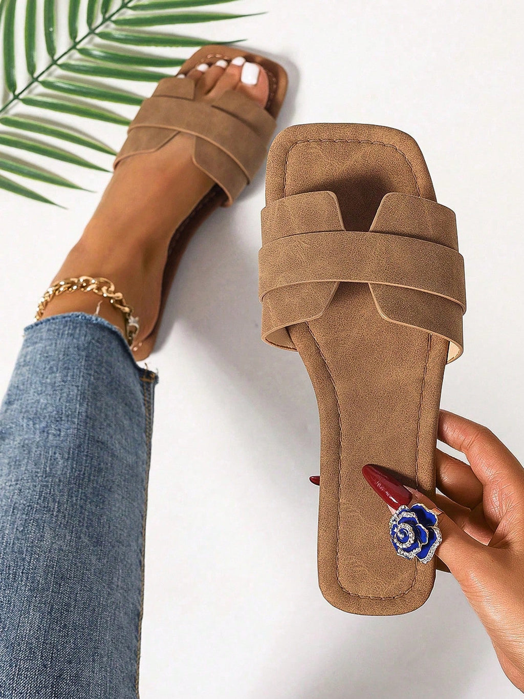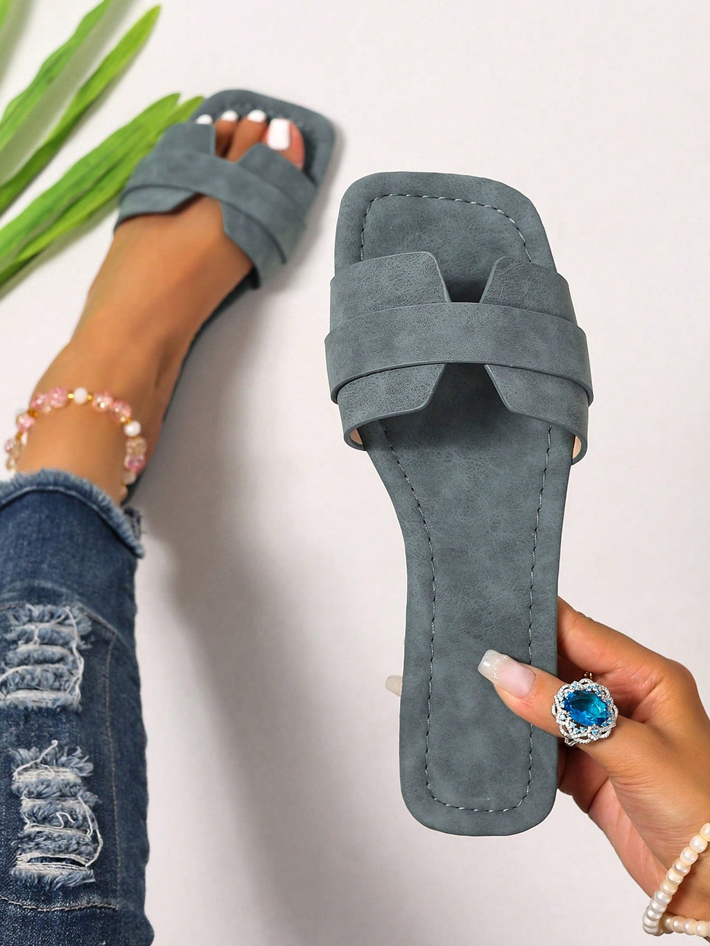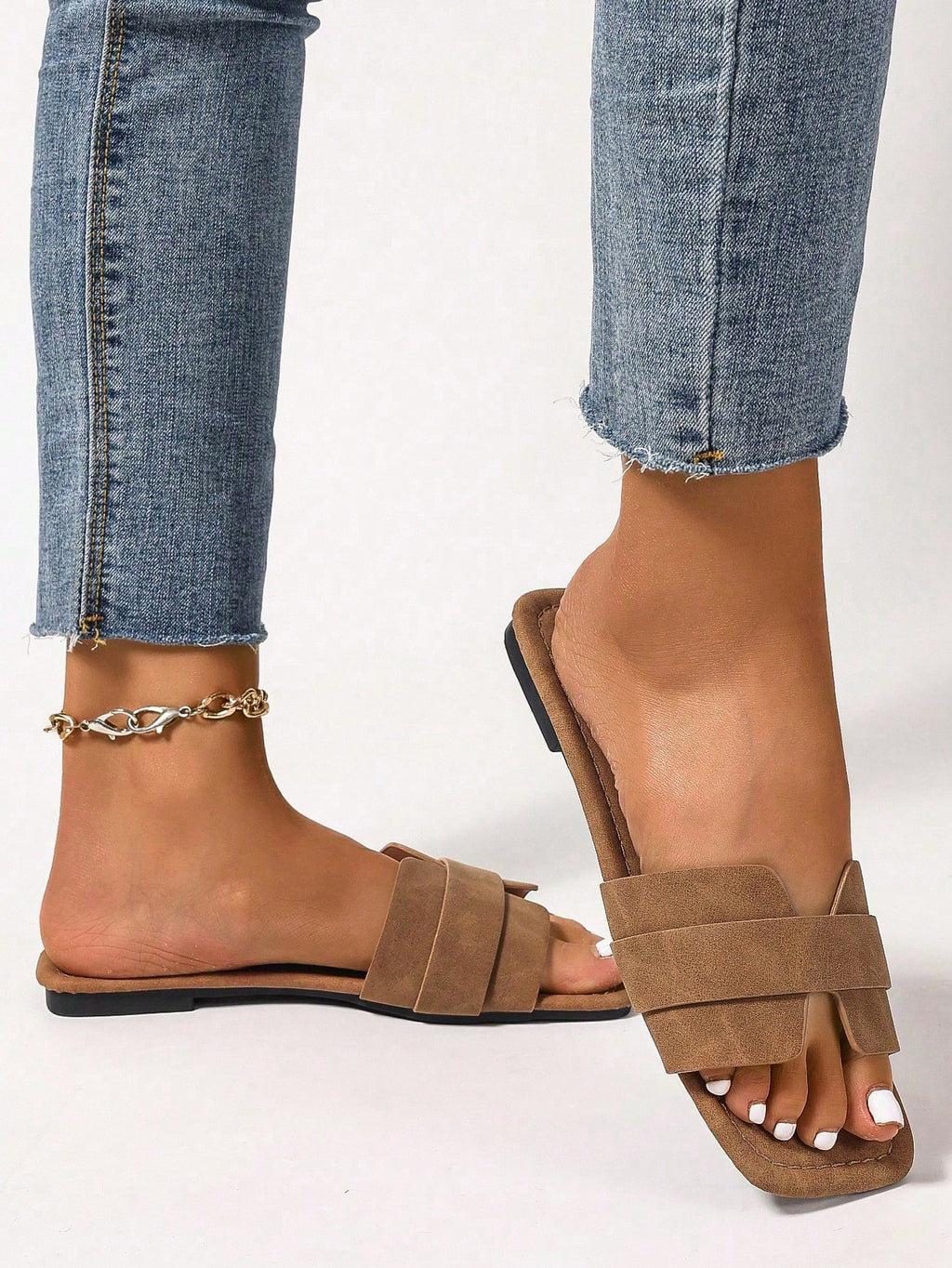 MIU Spring/Summer New Fashion Casual Strap Slip-On Sandals, Women Comfortable Flat Slide Sandals, Elegant Beach Shoes, Spring/Autumn Ladies Minimalist Open Toe Slippers