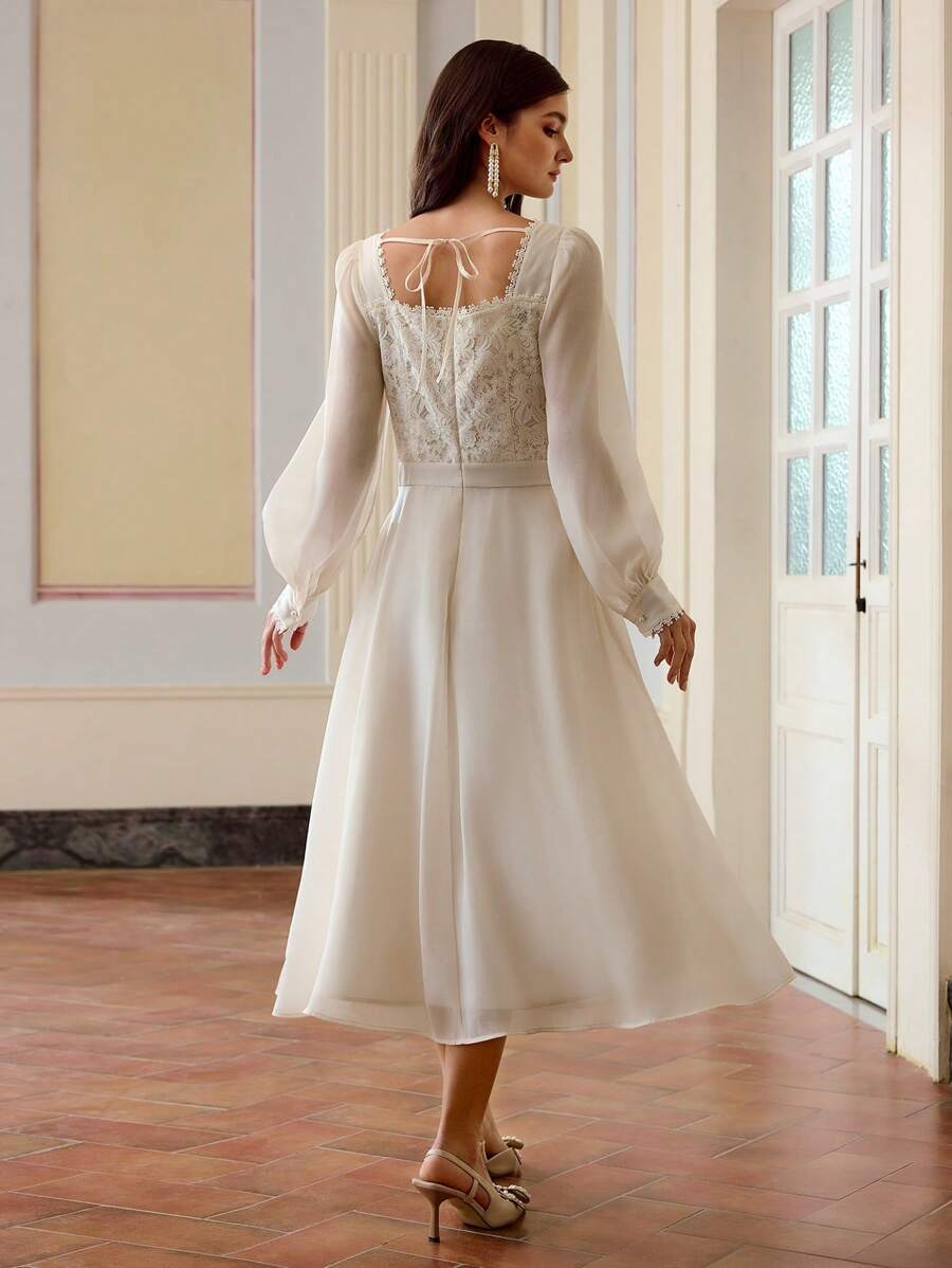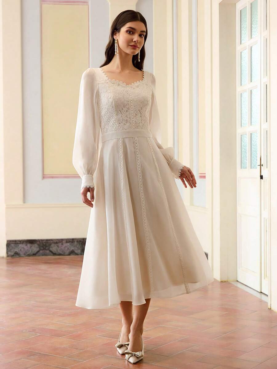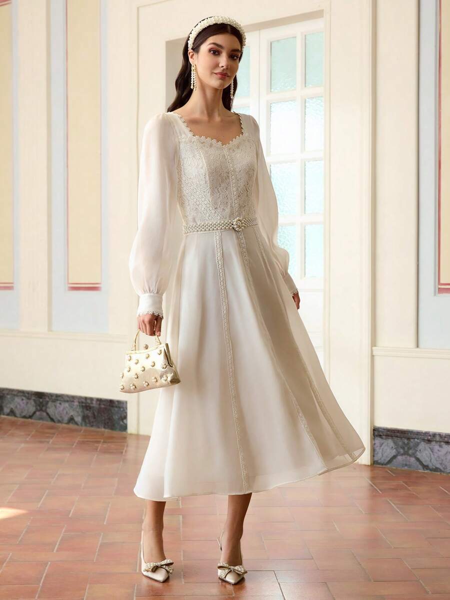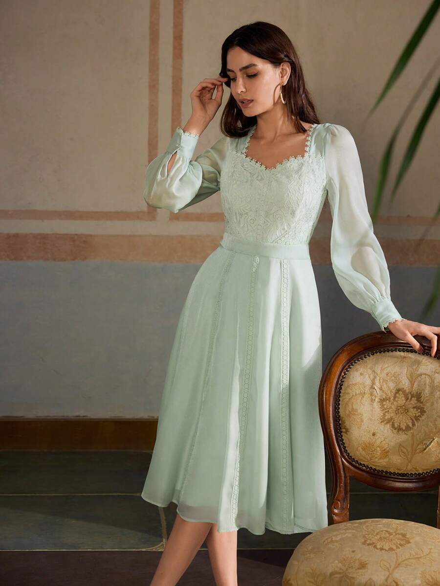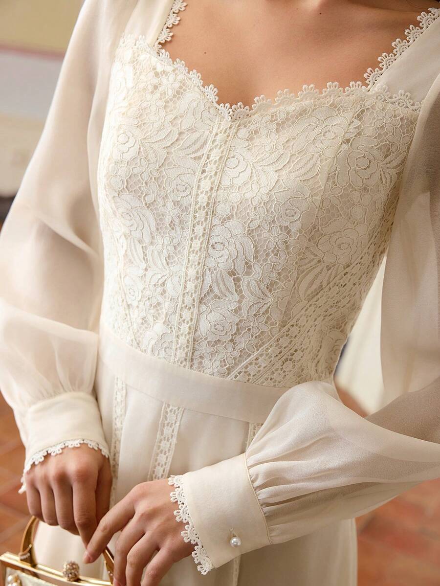 MIU Square Neck Puff Sleeve Lace Patchwork Flared Dress