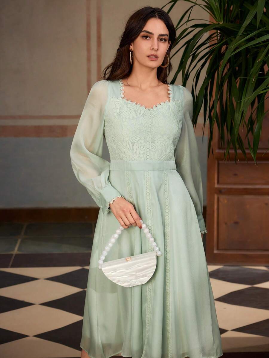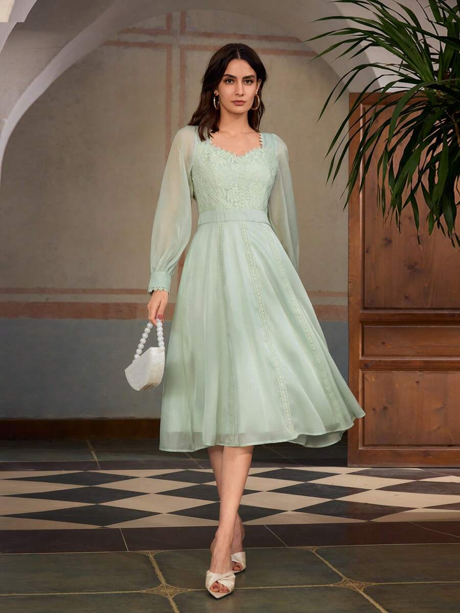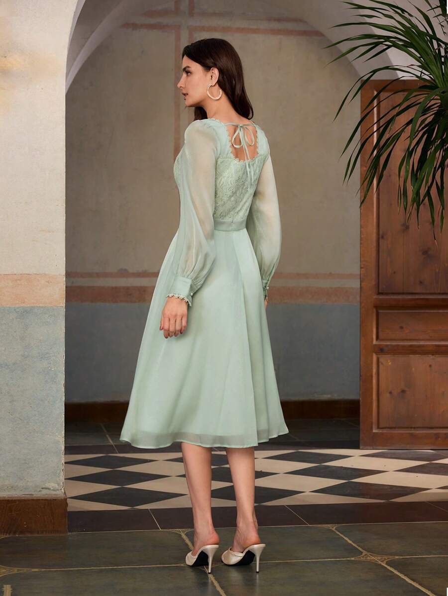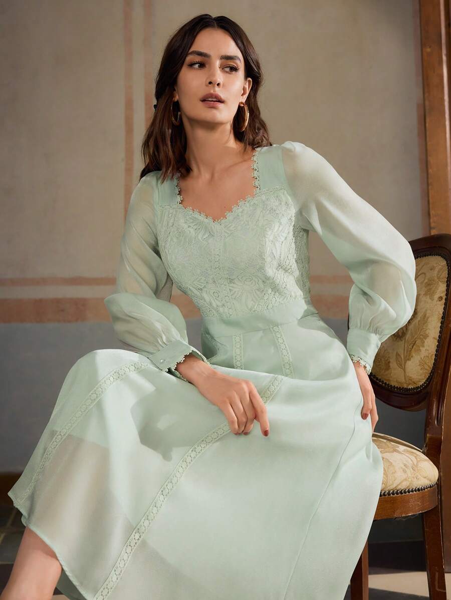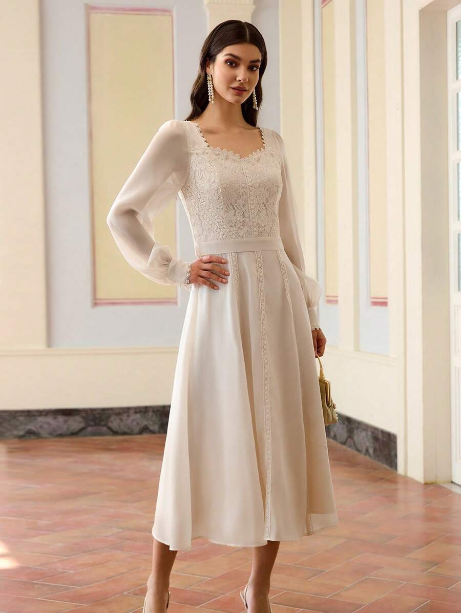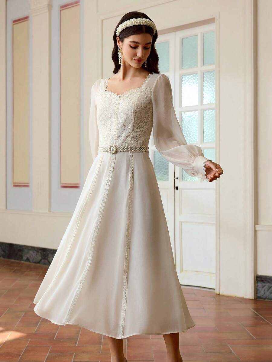 MIU Square Neck Puff Sleeve Lace Patchwork Flared Dress