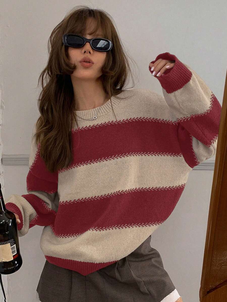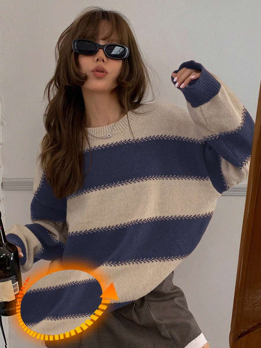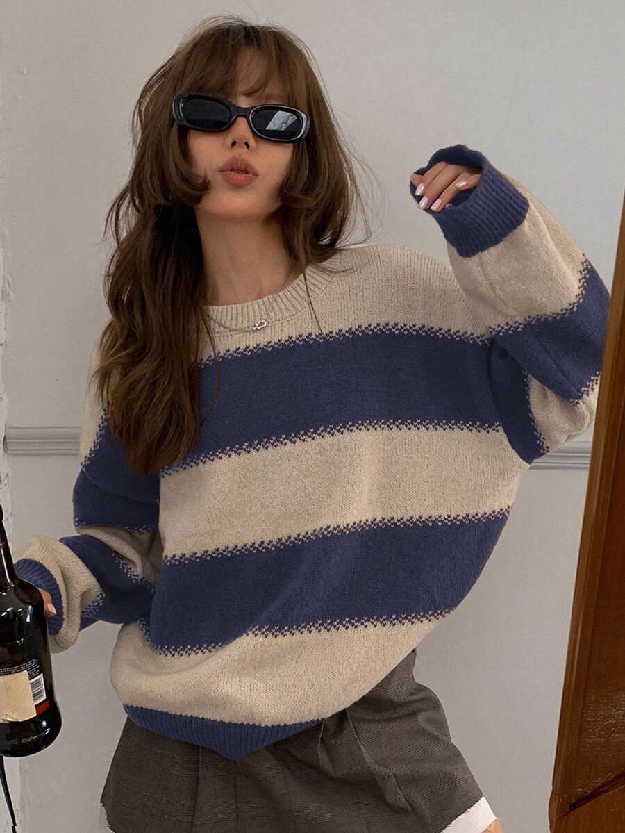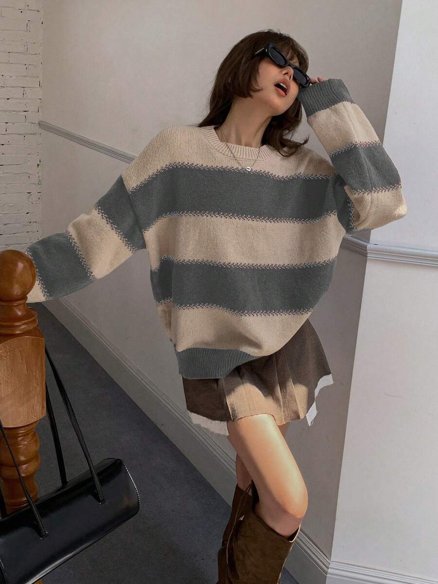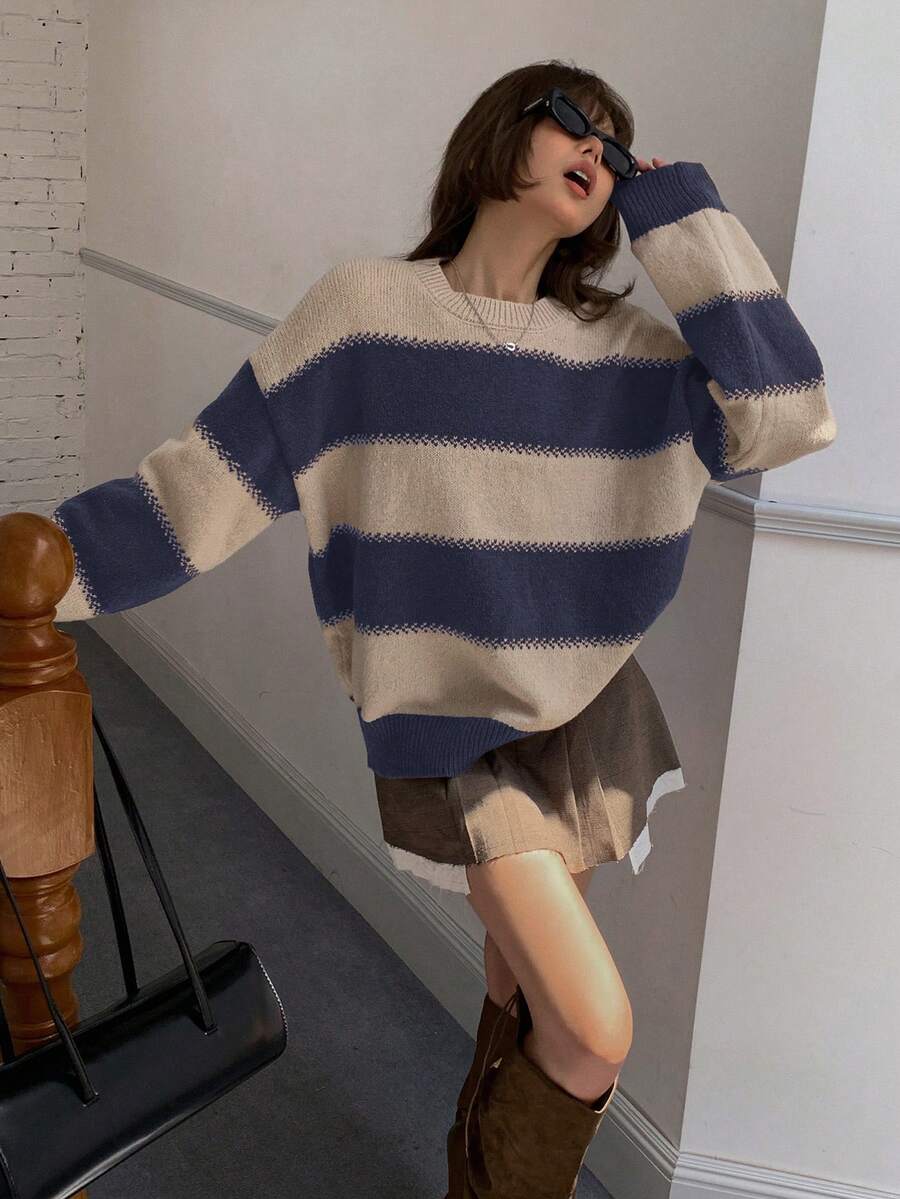 MIU Striped Loose Fit Crew Neck Women Sweater, Long Sleeve,Fall Women Clothes