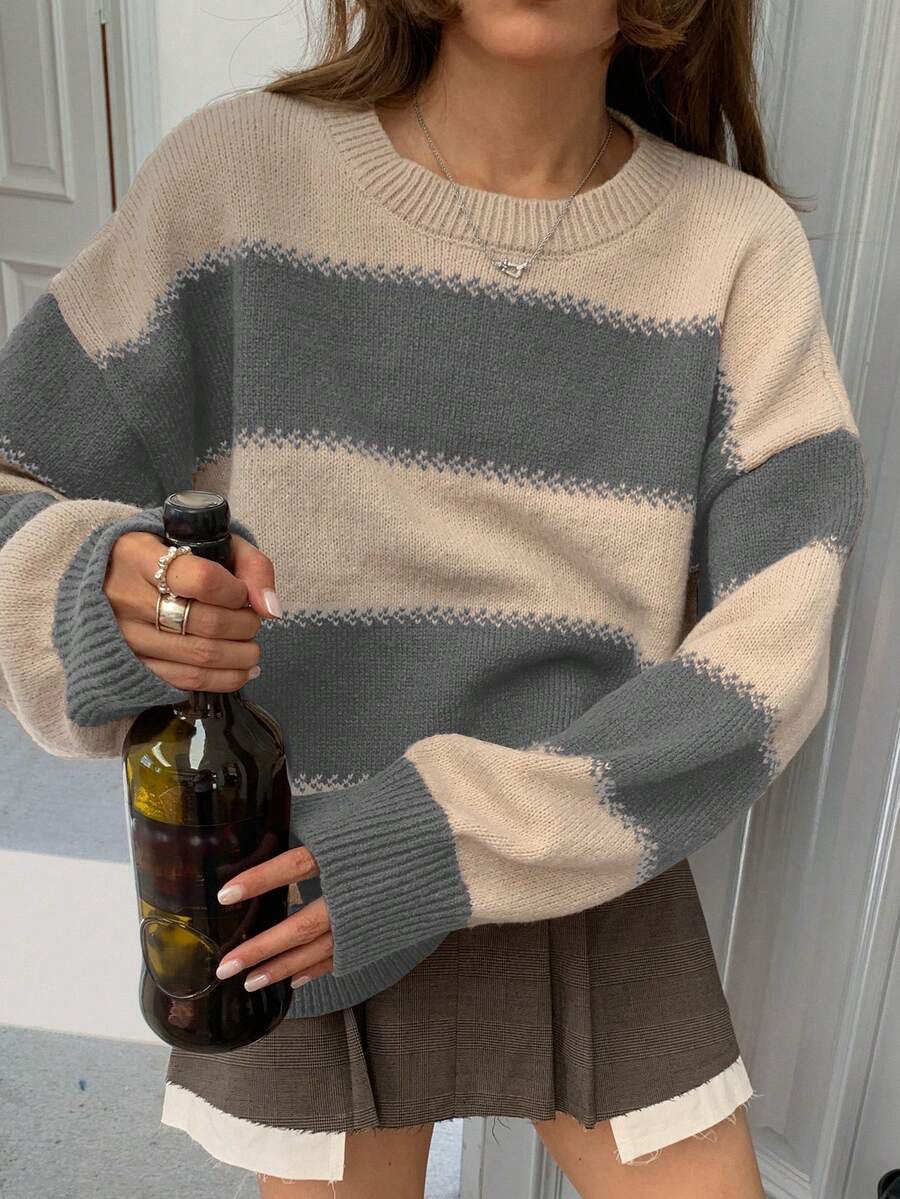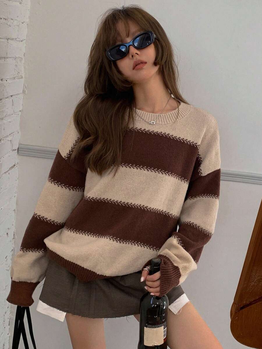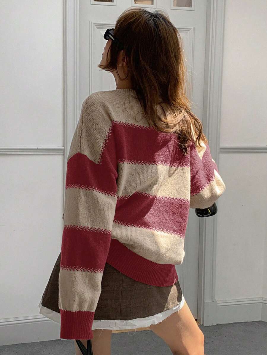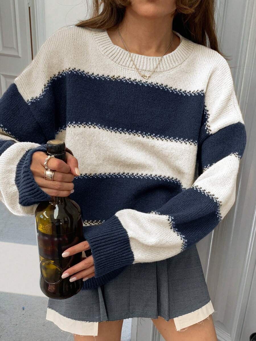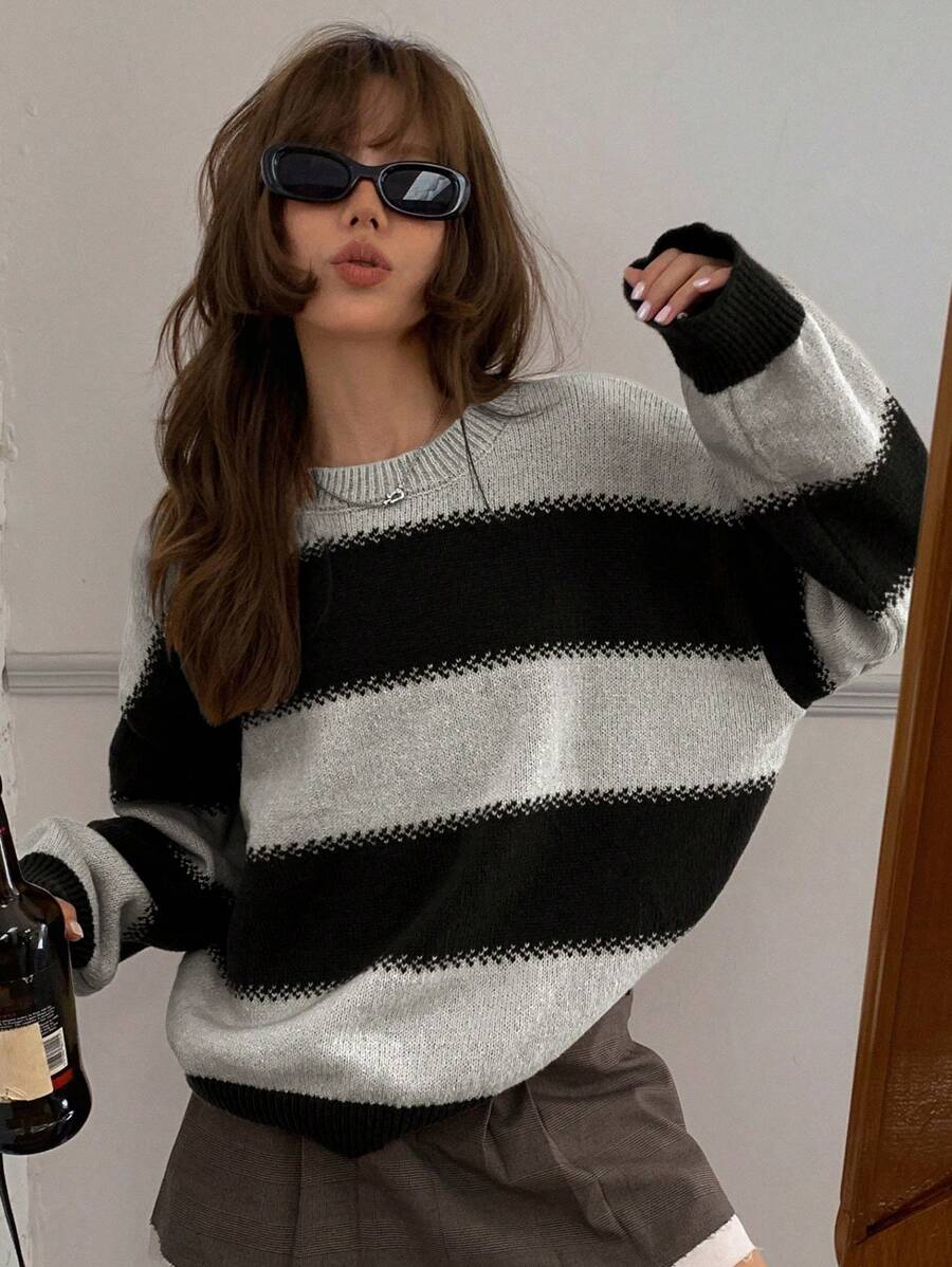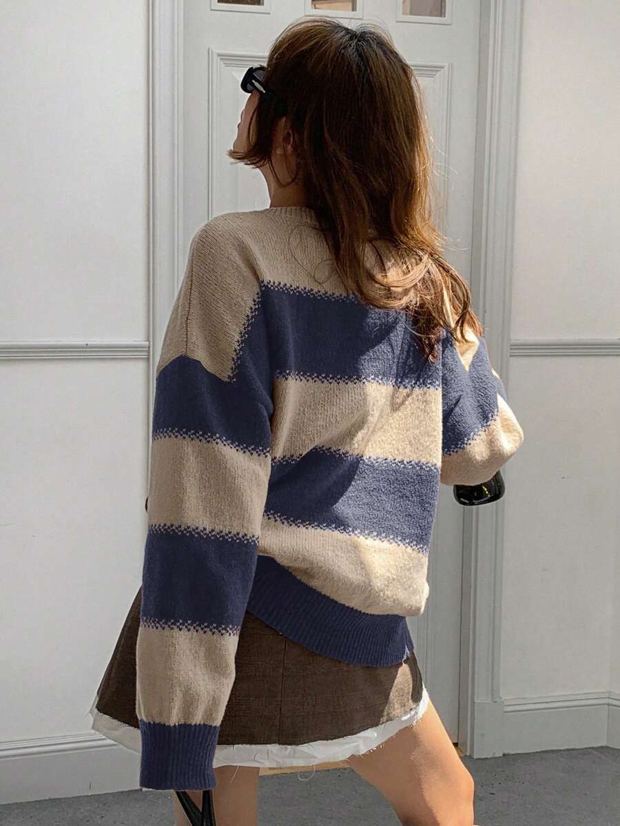 MIU Striped Loose Fit Crew Neck Women Sweater, Long Sleeve,Fall Women Clothes