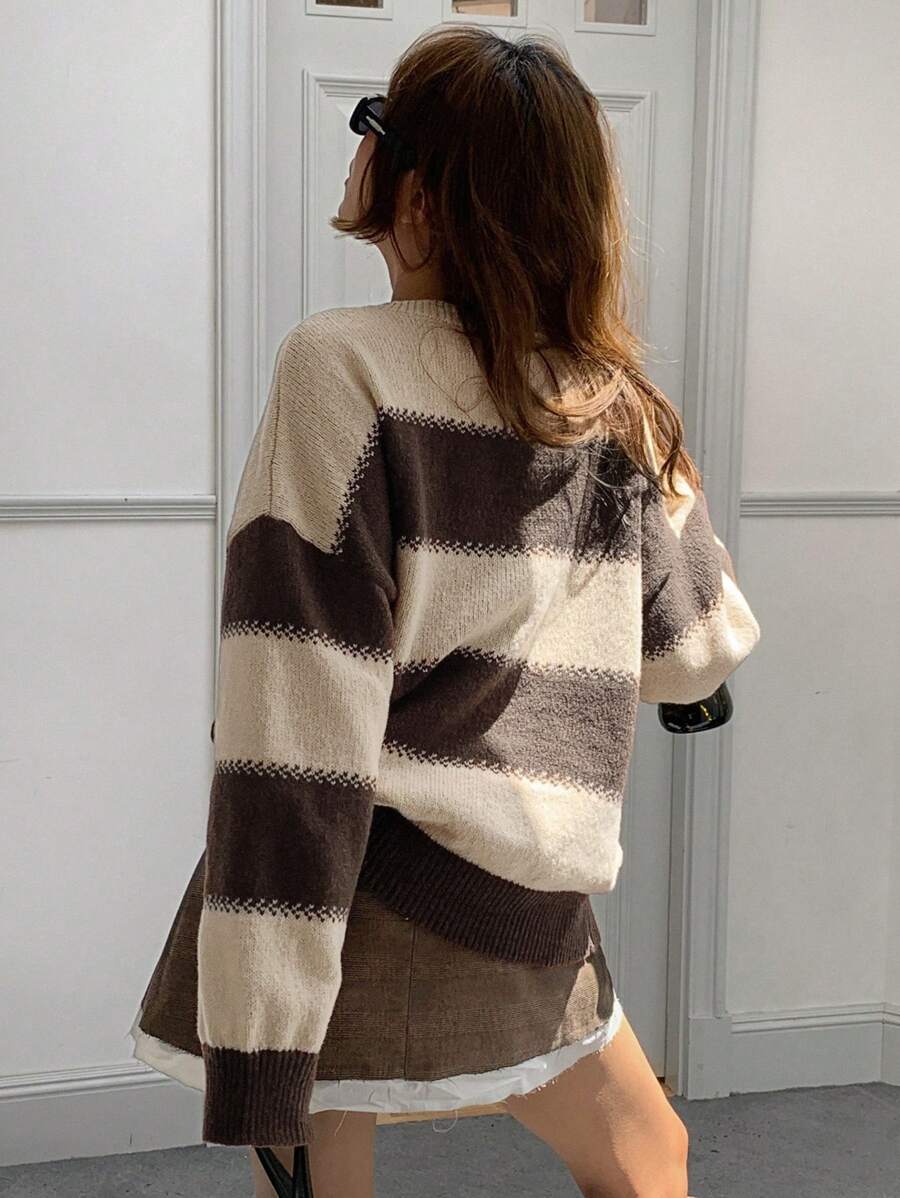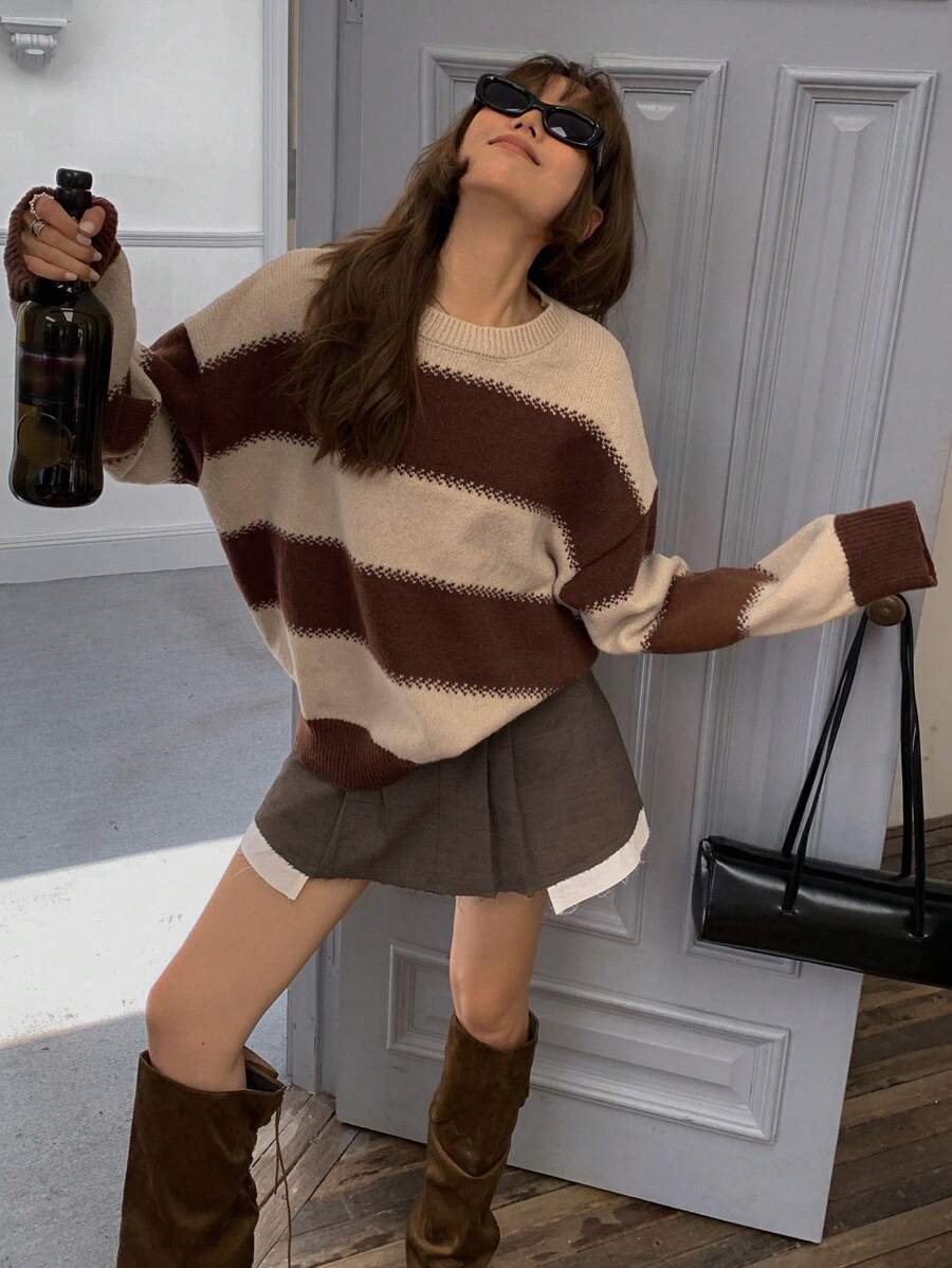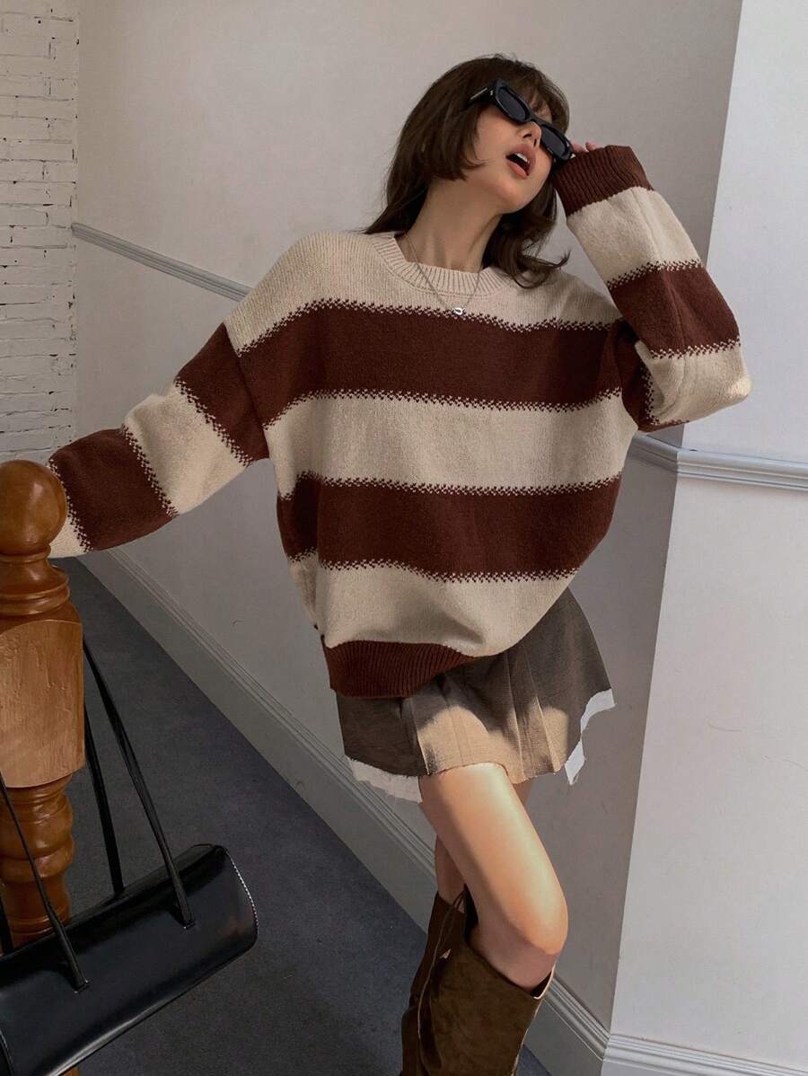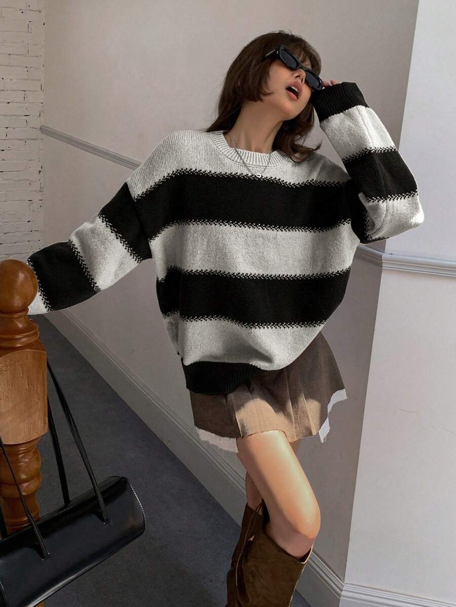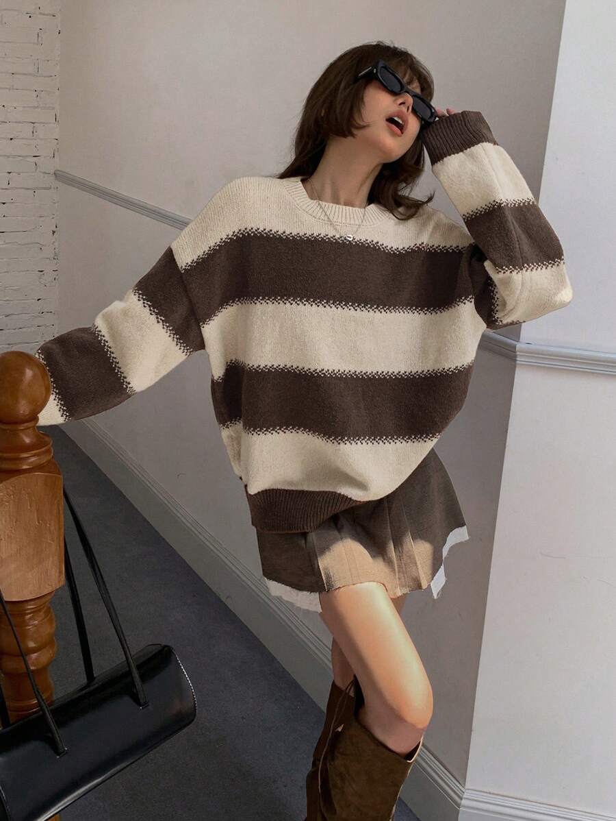 MIU Striped Loose Fit Crew Neck Women Sweater, Long Sleeve,Fall Women Clothes