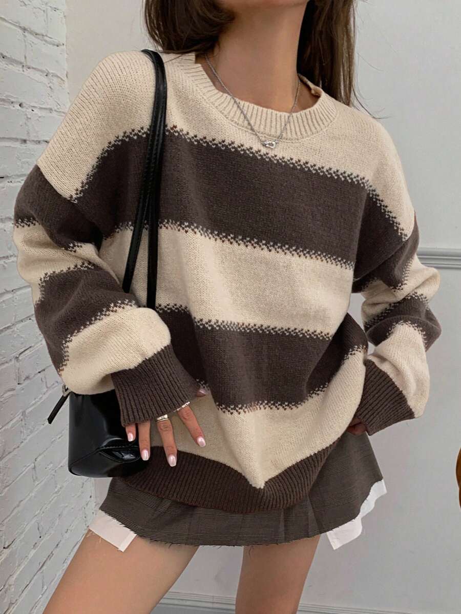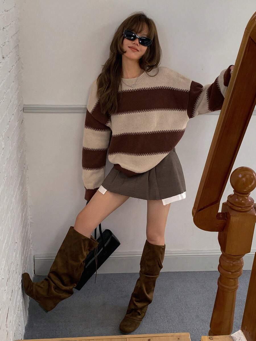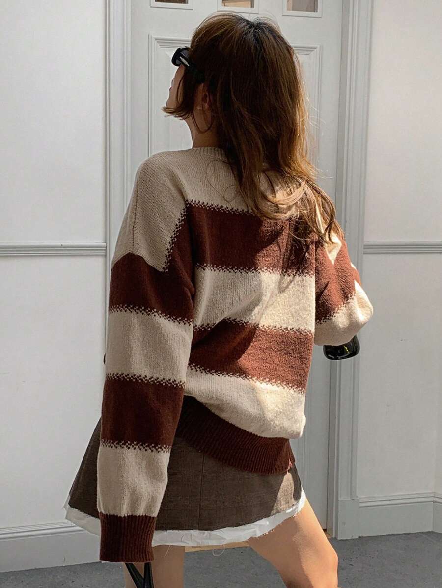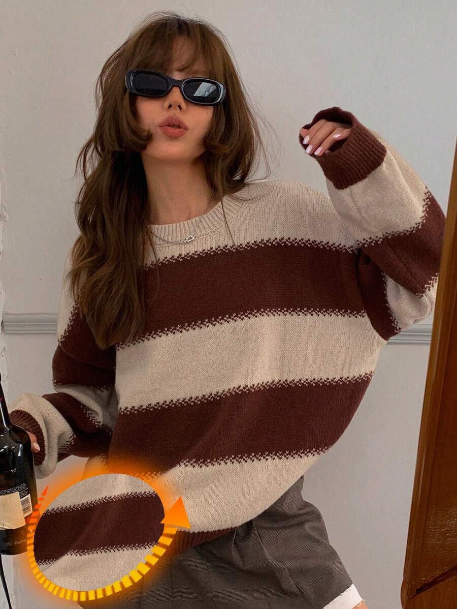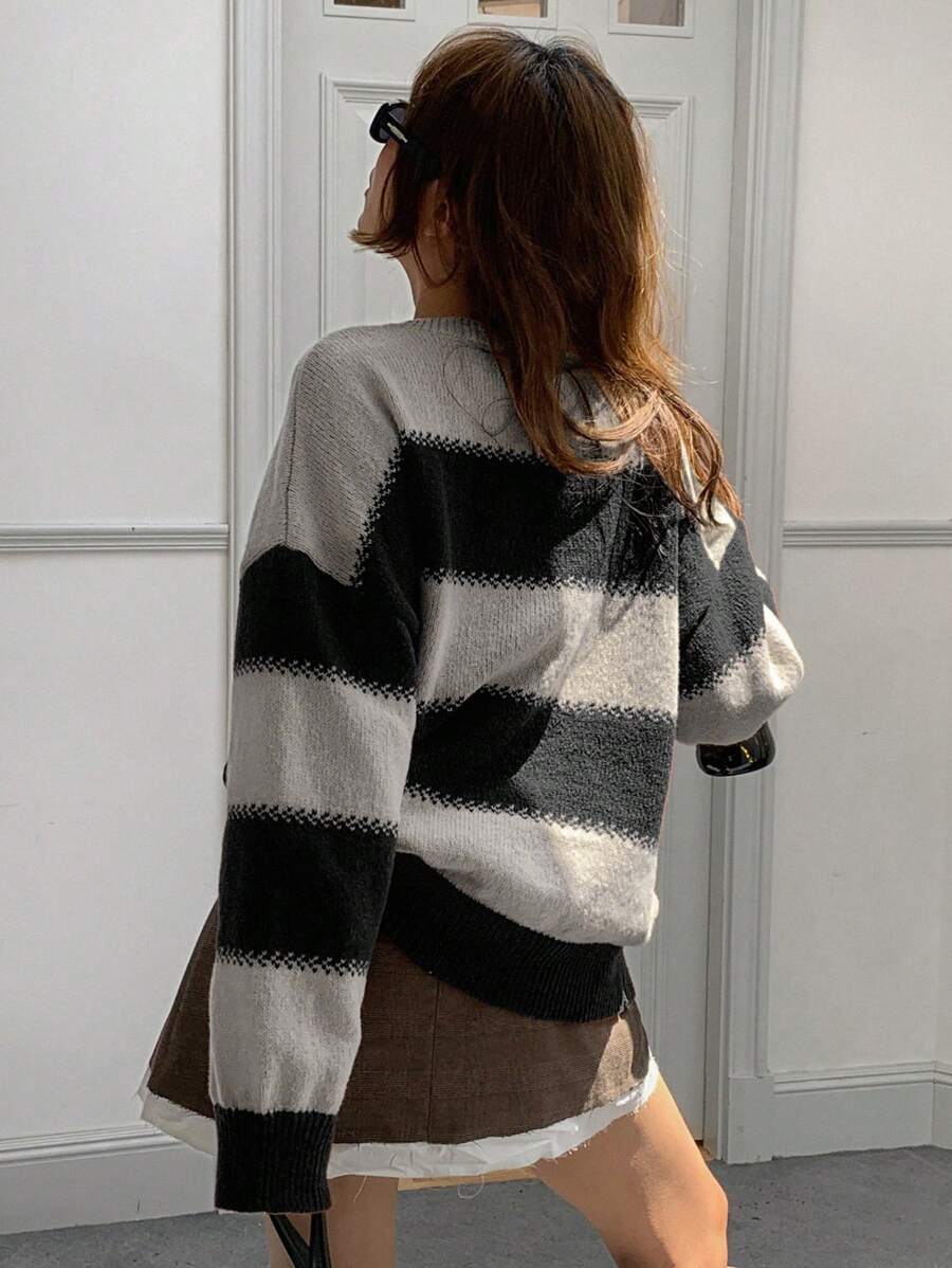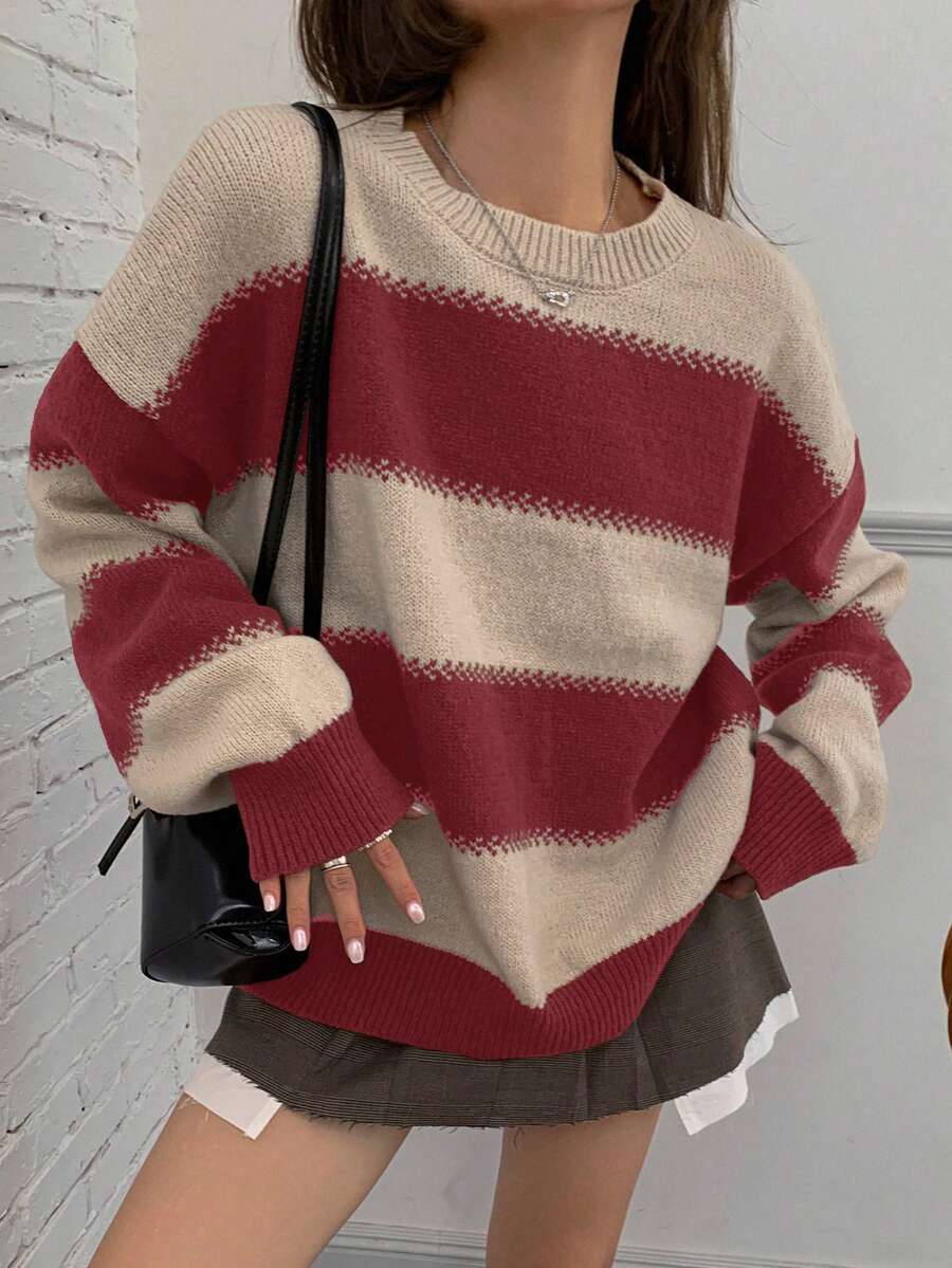 MIU Striped Loose Fit Crew Neck Women Sweater, Long Sleeve,Fall Women Clothes