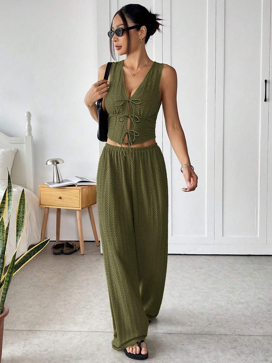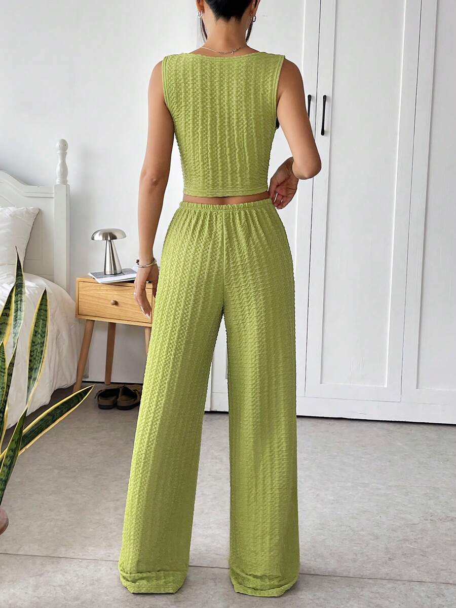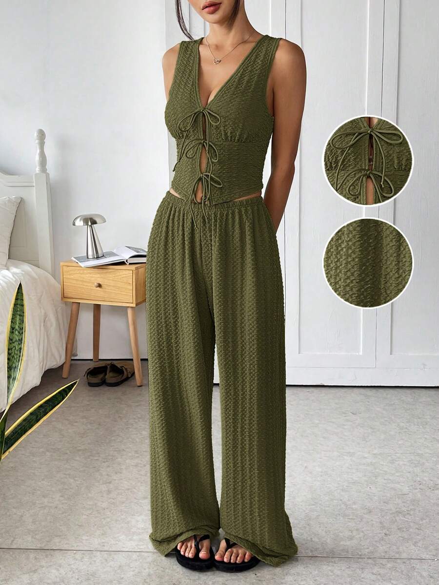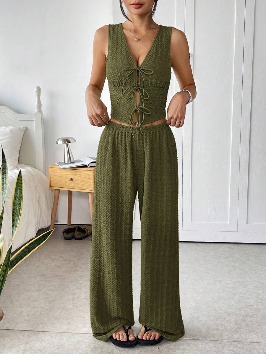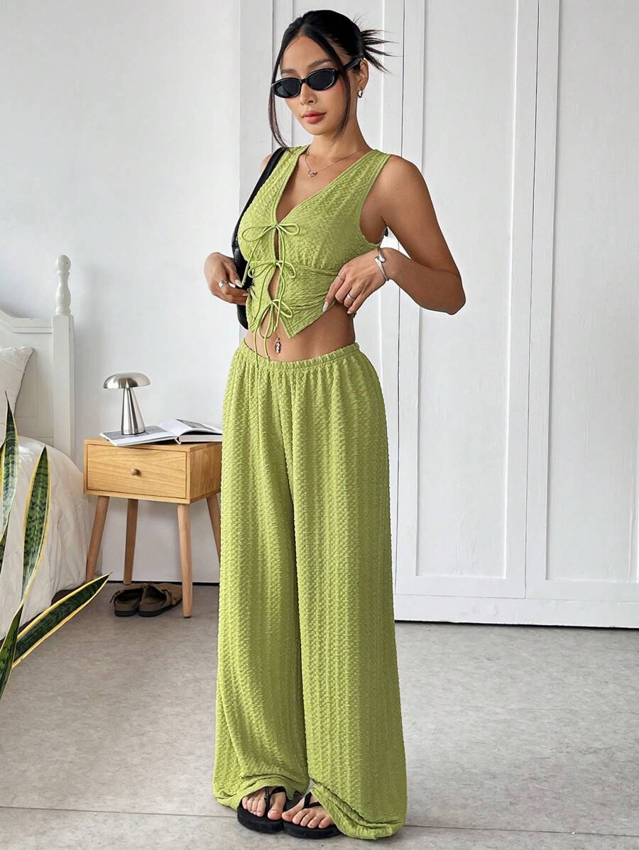 MIU Summer Green Textured Knit Tie Halter Neck Top And Pants Set