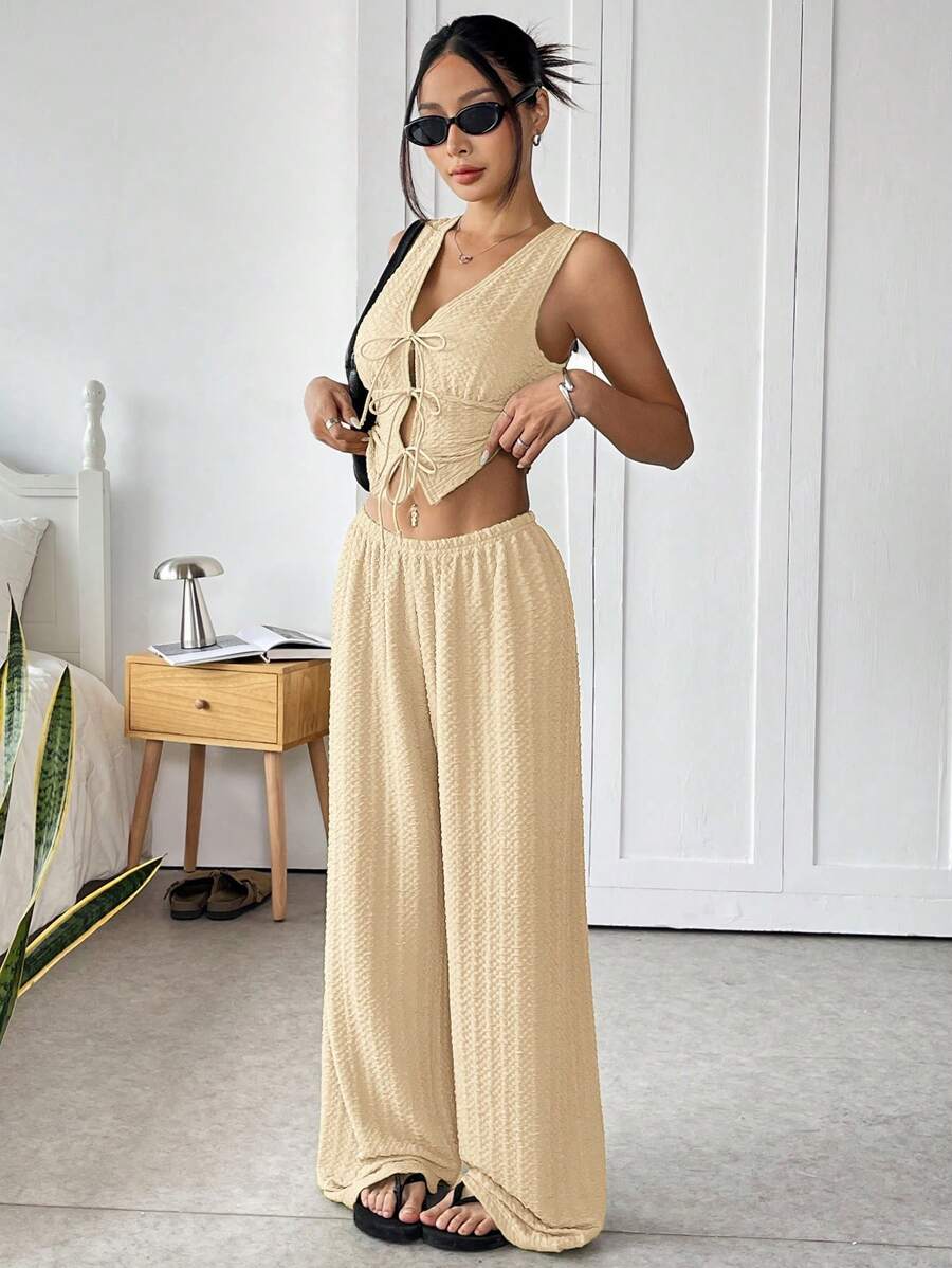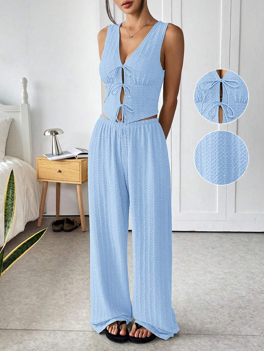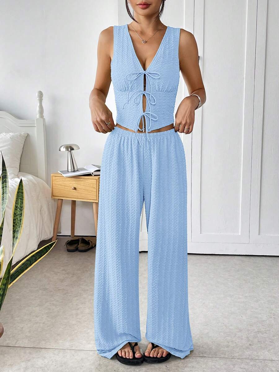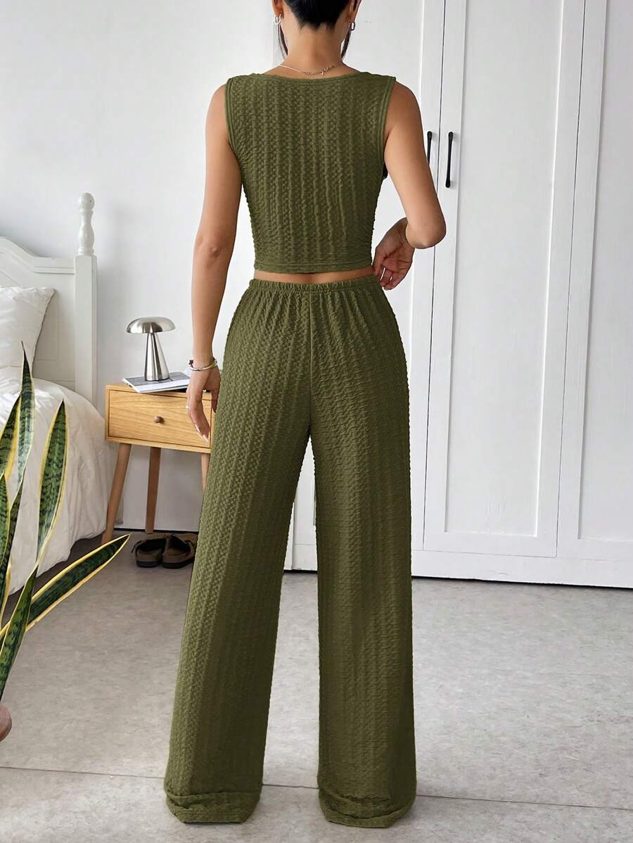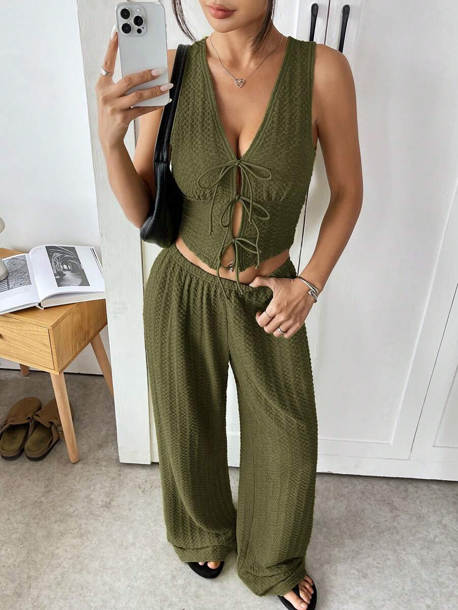 MIU Summer Green Textured Knit Tie Halter Neck Top And Pants Set