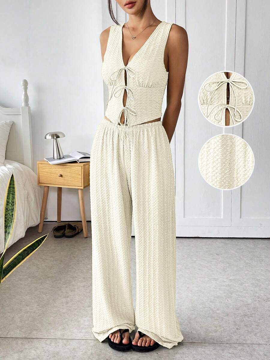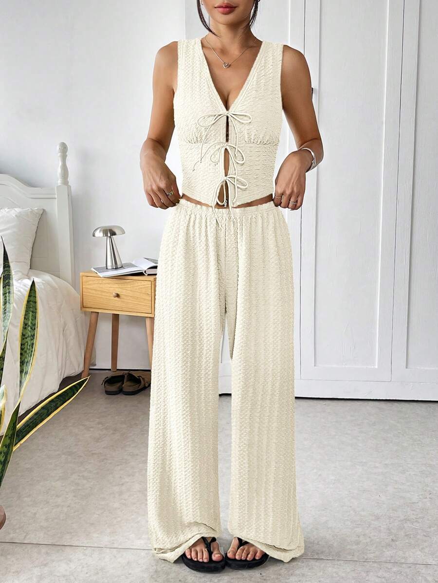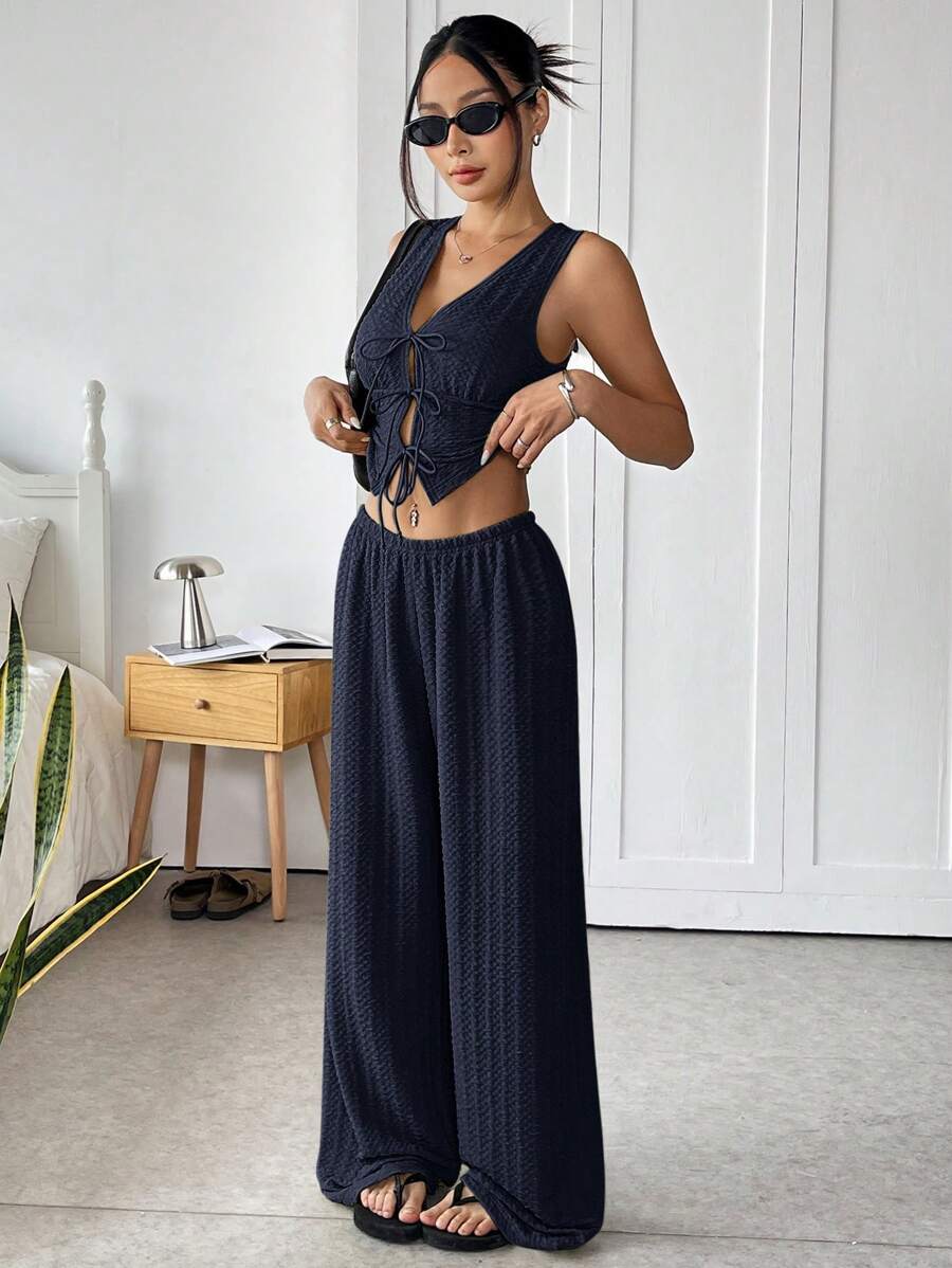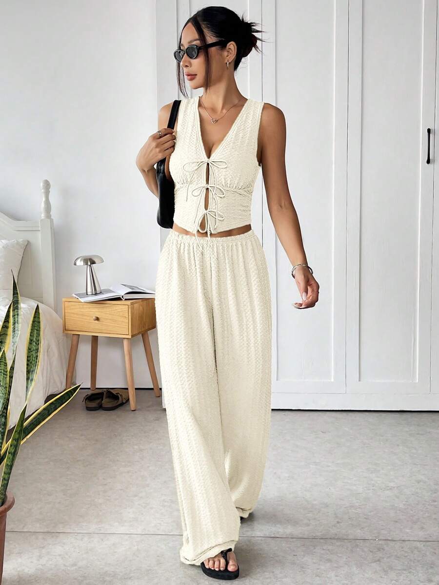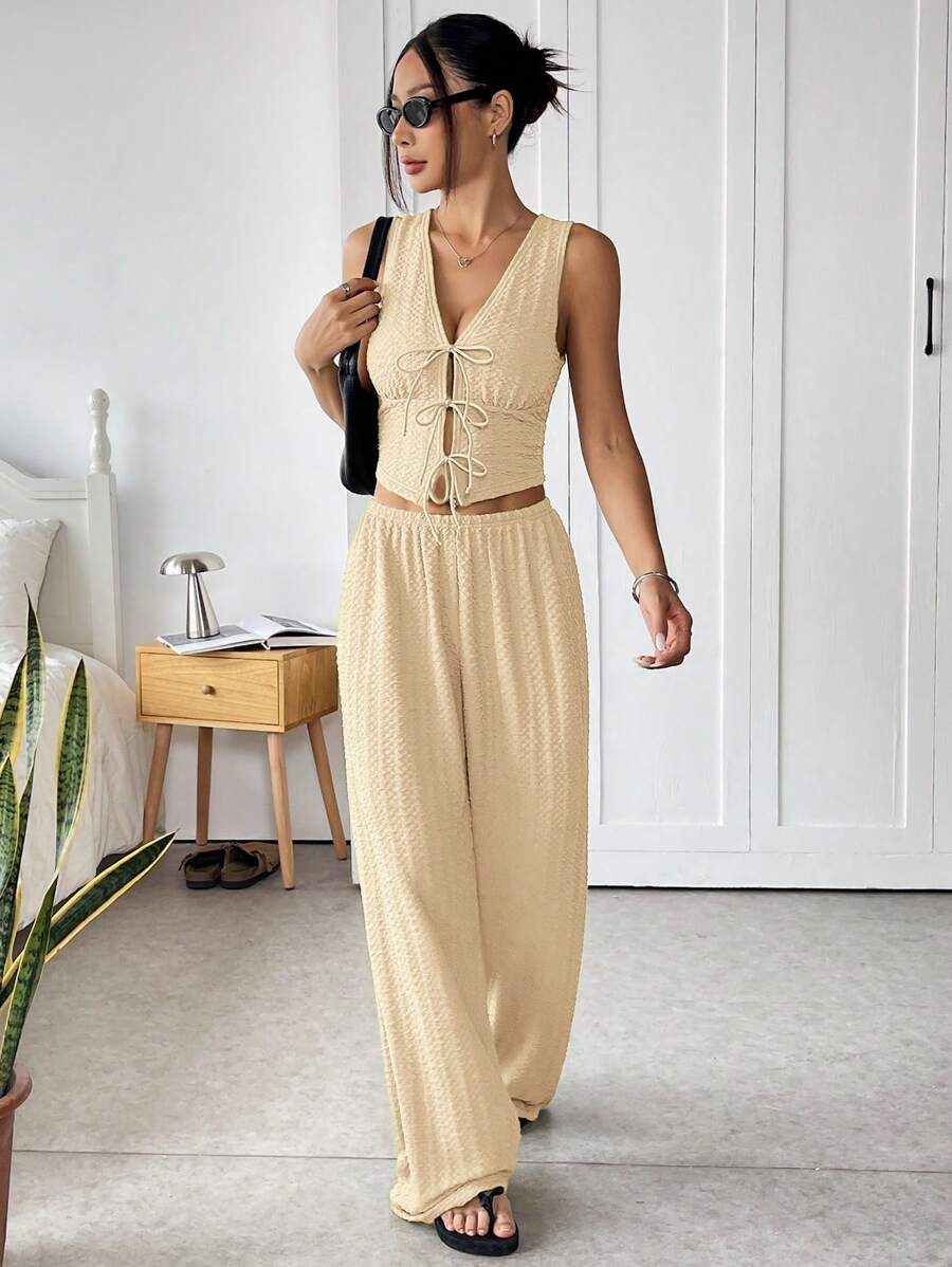 MIU Summer Green Textured Knit Tie Halter Neck Top And Pants Set