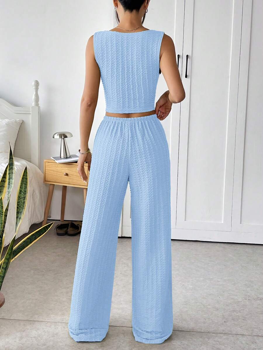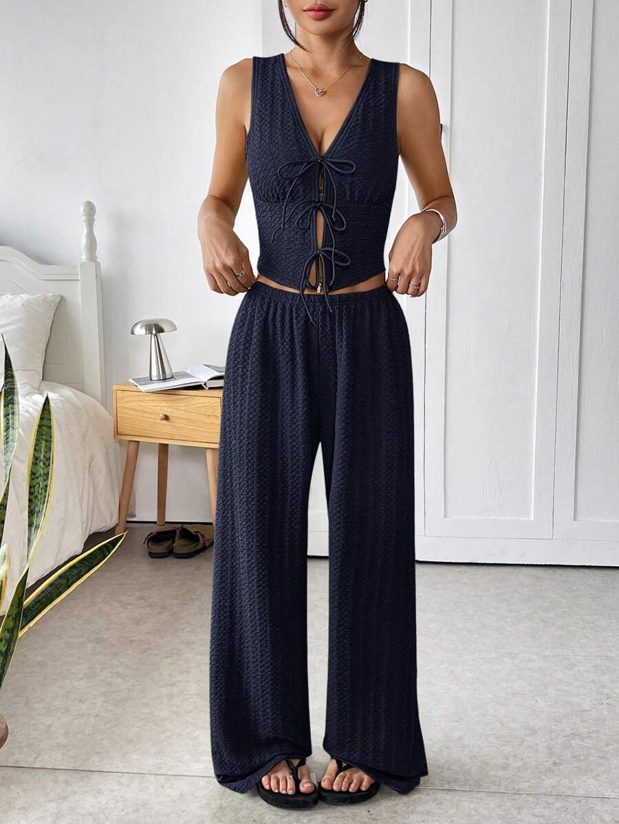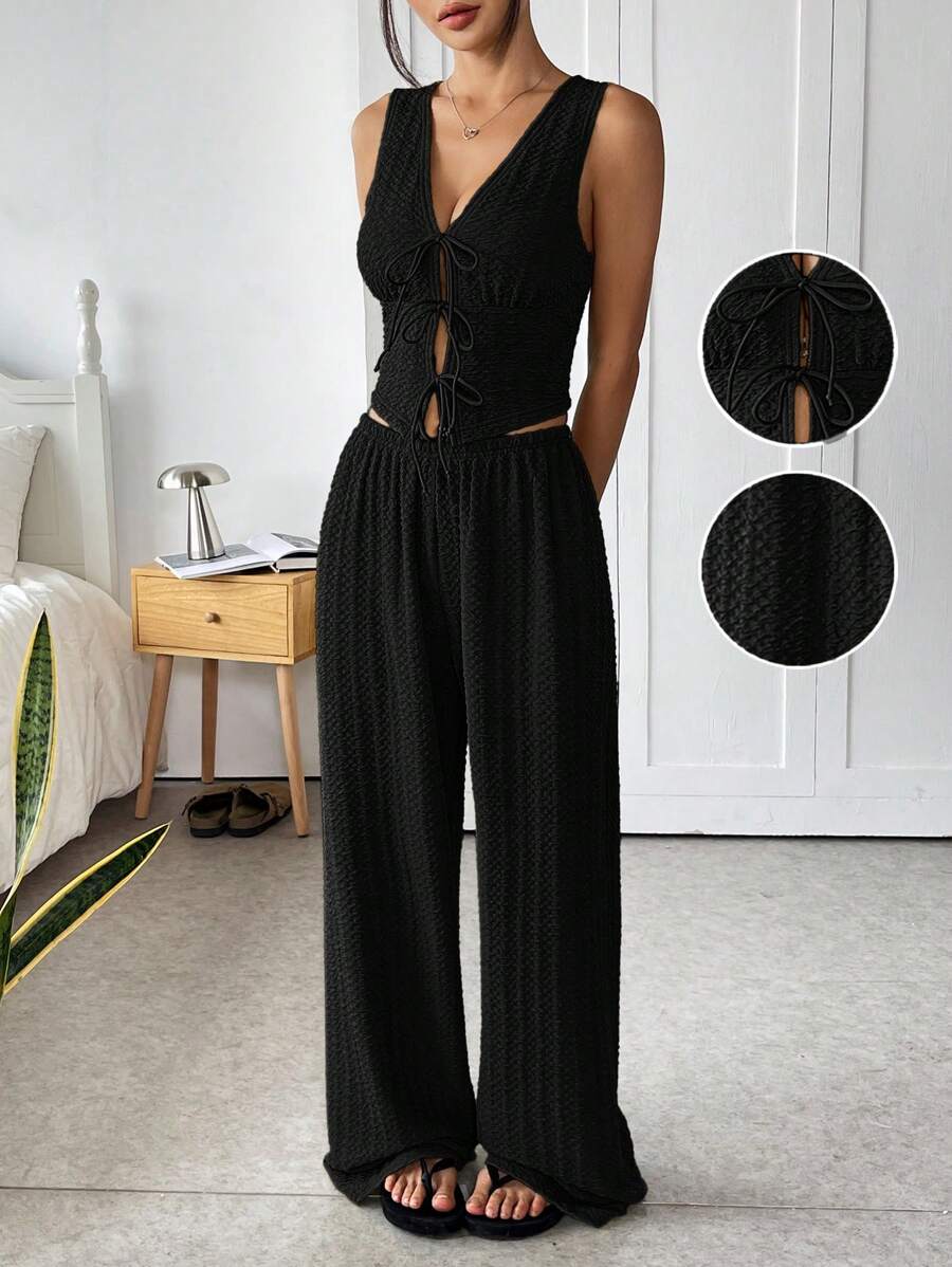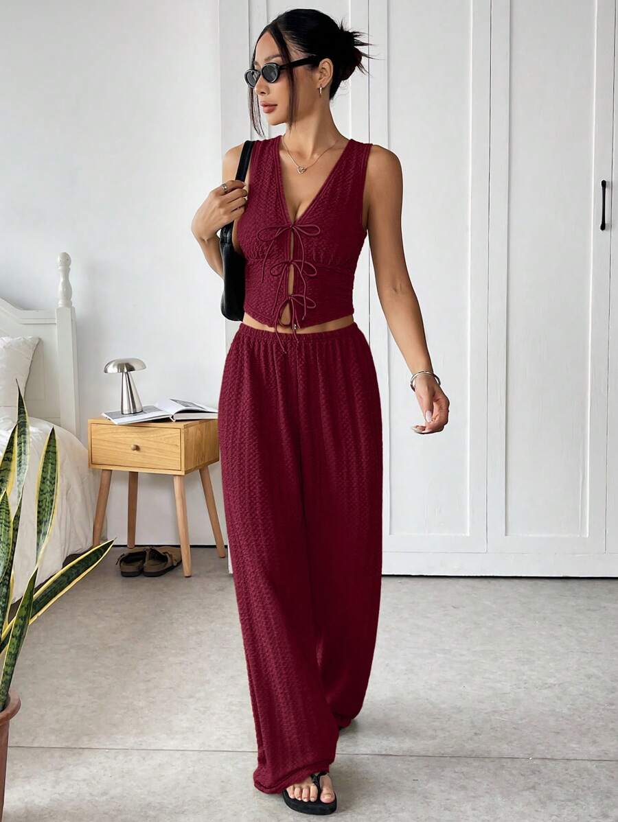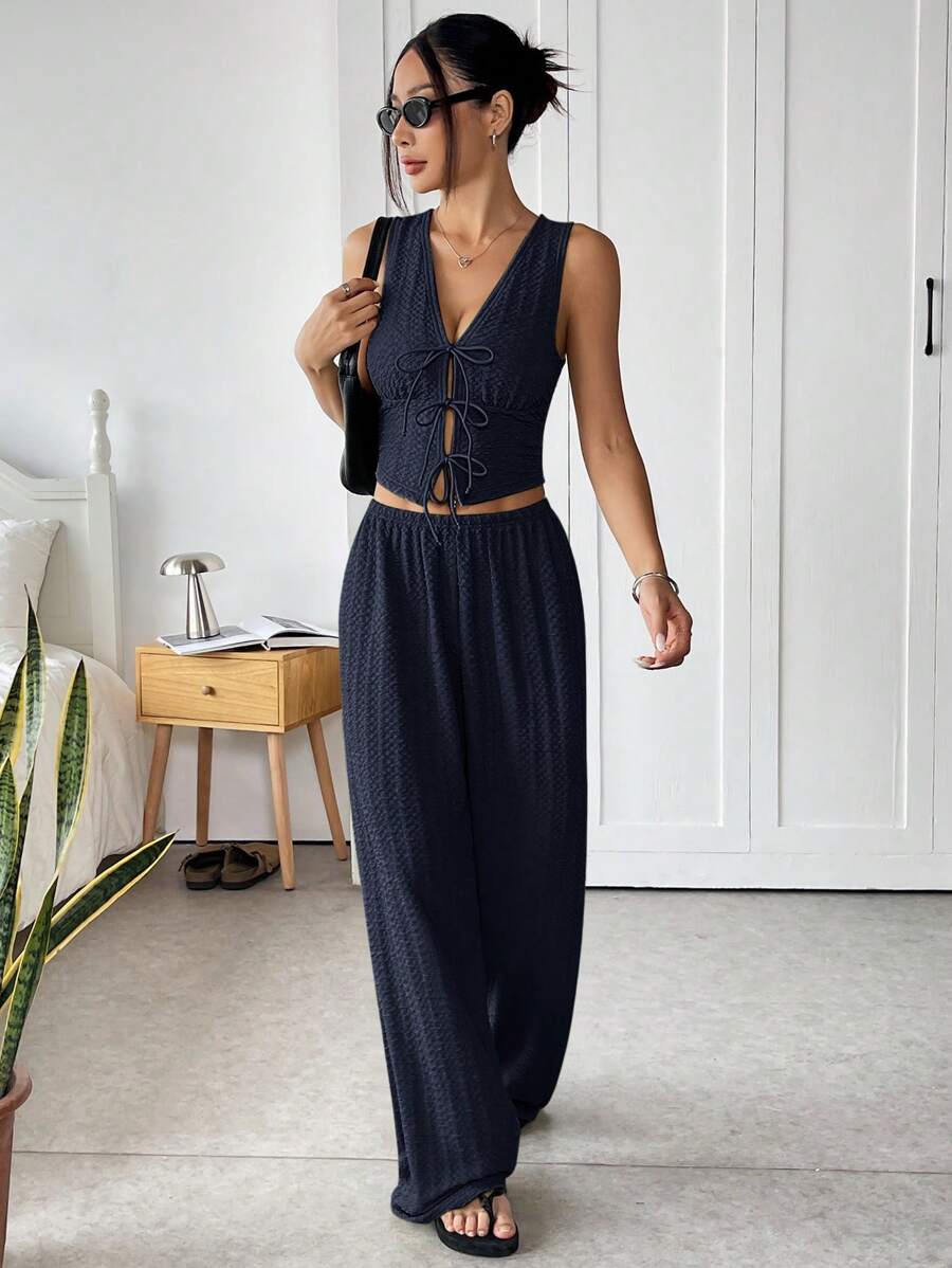 MIU Summer Green Textured Knit Tie Halter Neck Top And Pants Set
