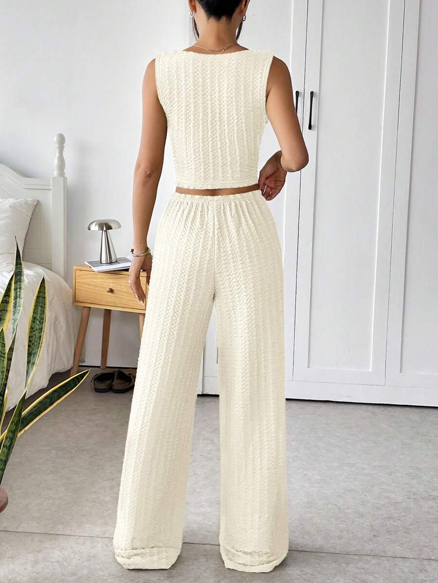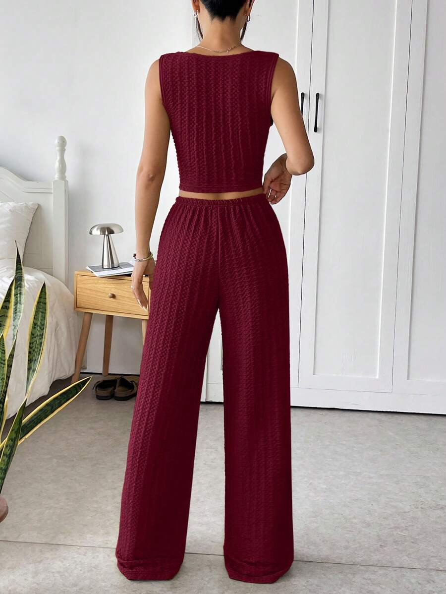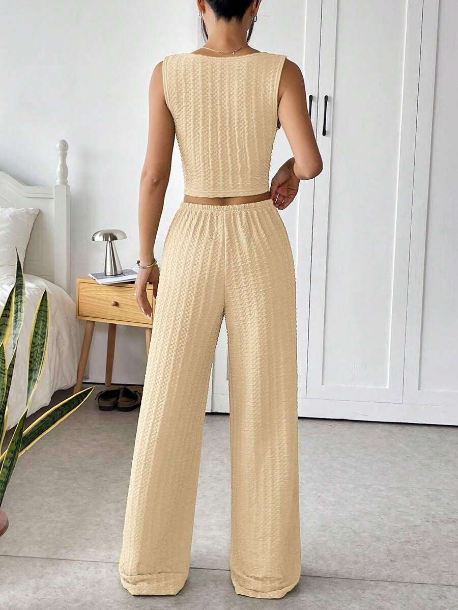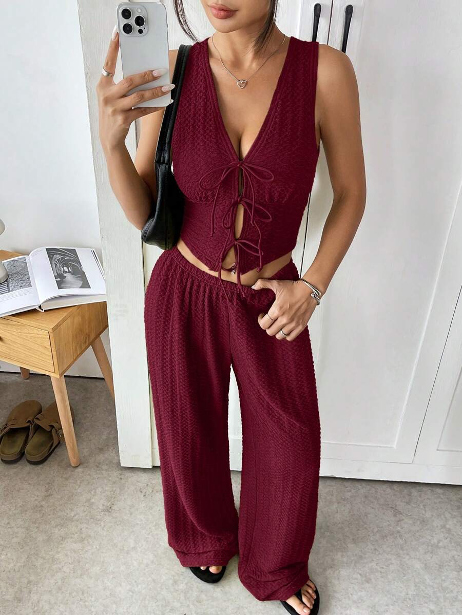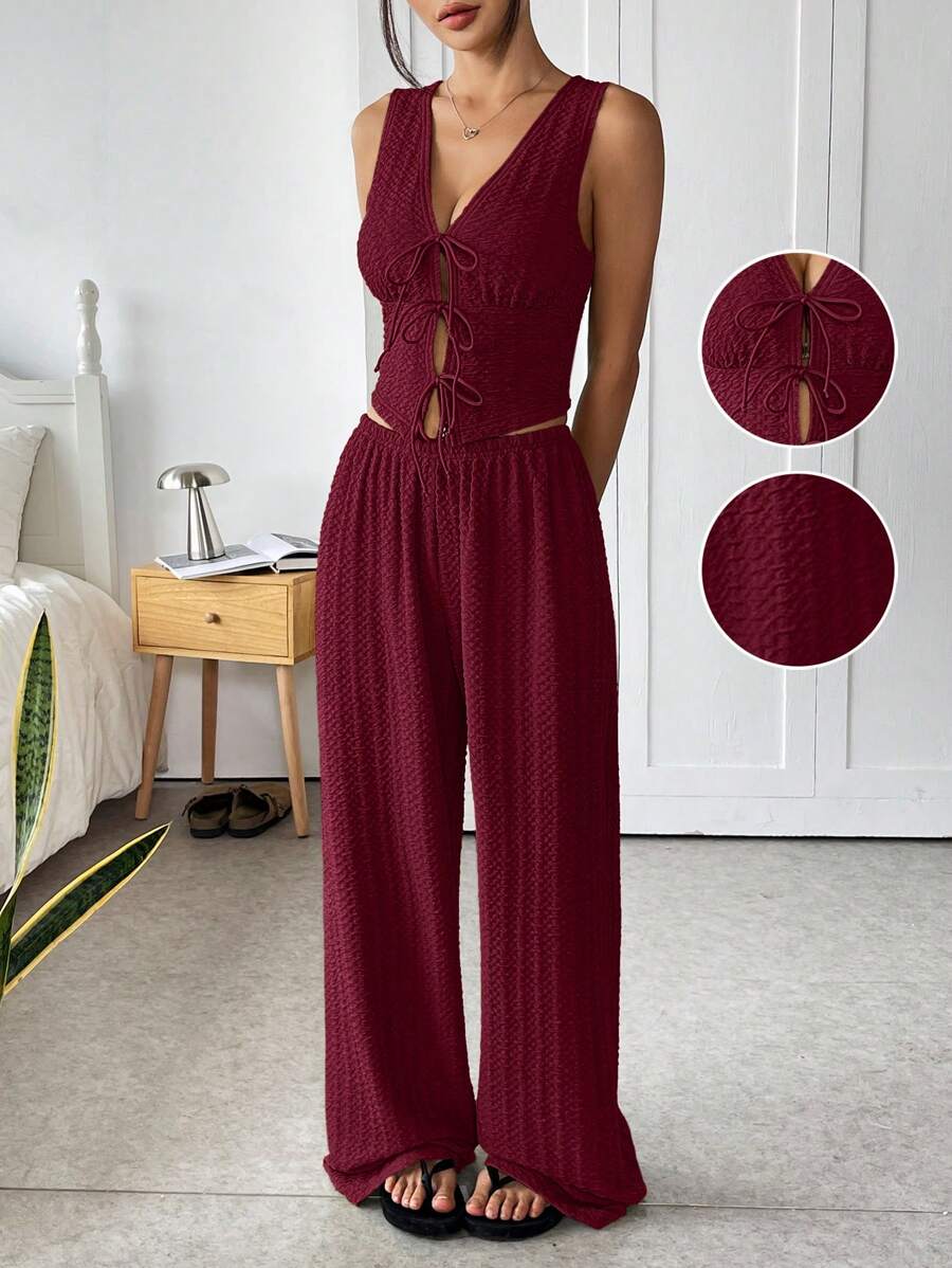 MIU Summer Green Textured Knit Tie Halter Neck Top And Pants Set