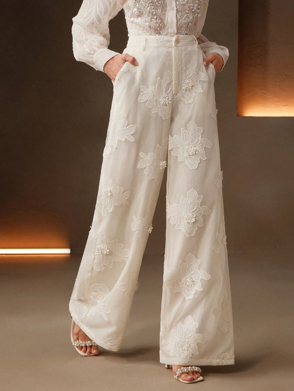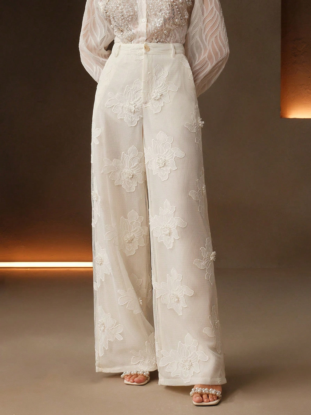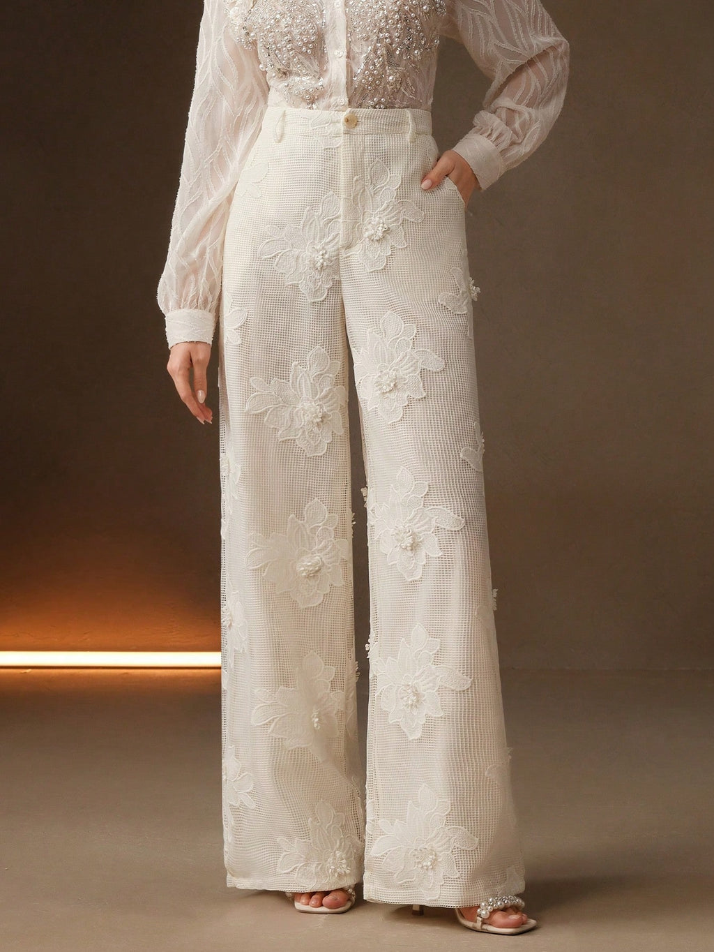 MIU Summer New Design Mesh Net Embroidered Straight Wide Leg Women Long Pants, Suit Pants