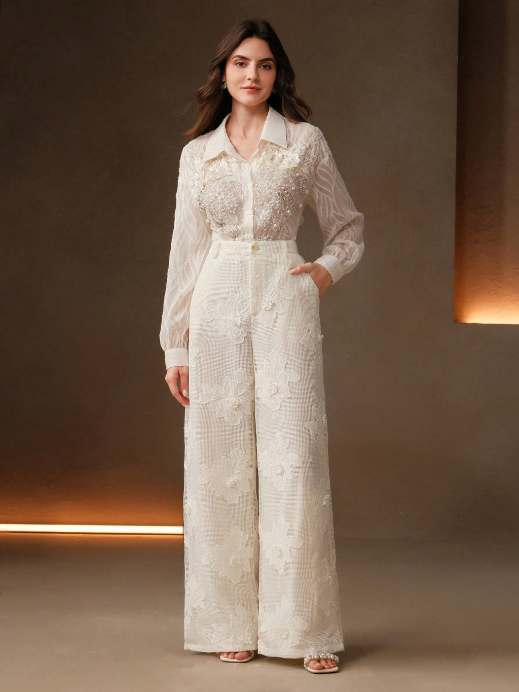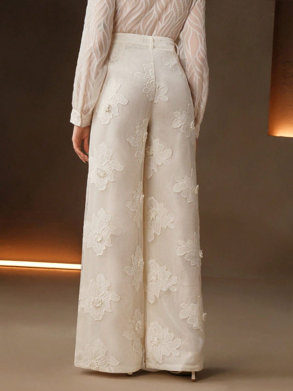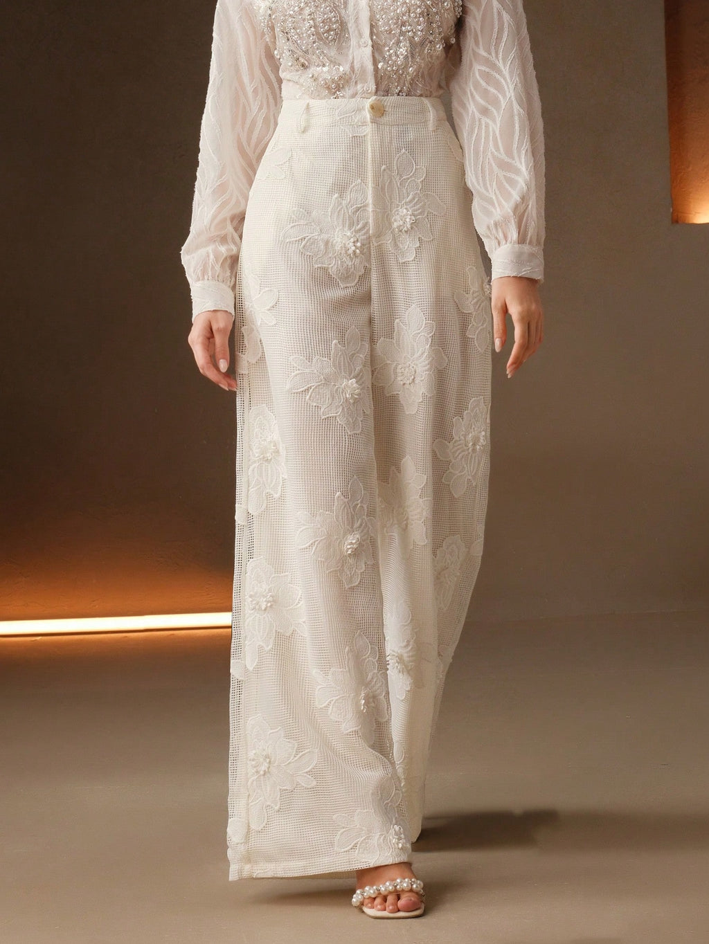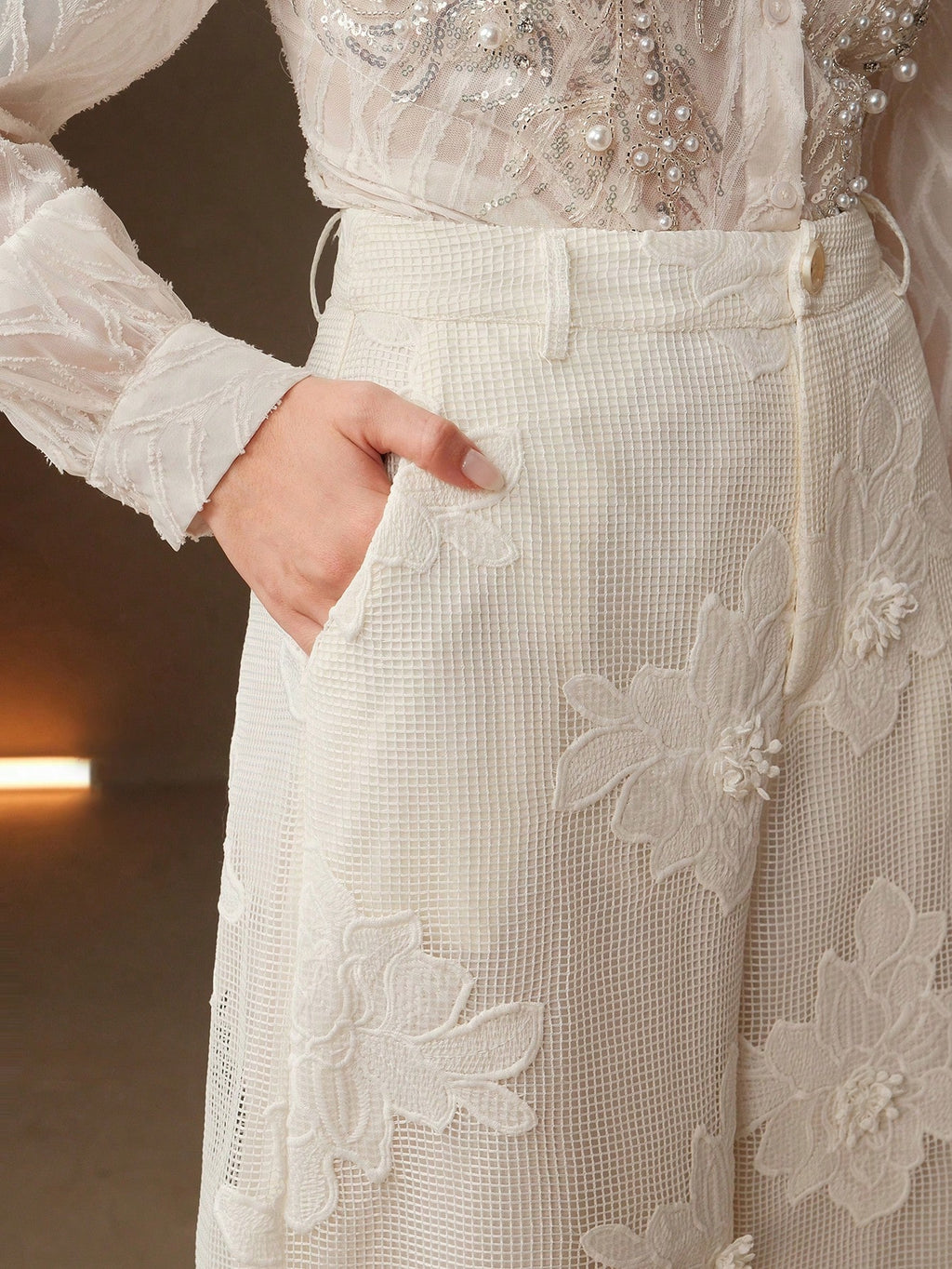 MIU Summer New Design Mesh Net Embroidered Straight Wide Leg Women Long Pants, Suit Pants