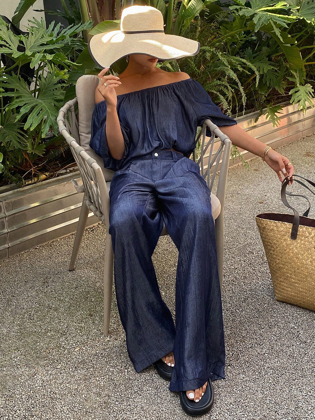 MIU Summer Vacation Linen Faux Raw Color Denim Off Shoulder Casual Outfits Set