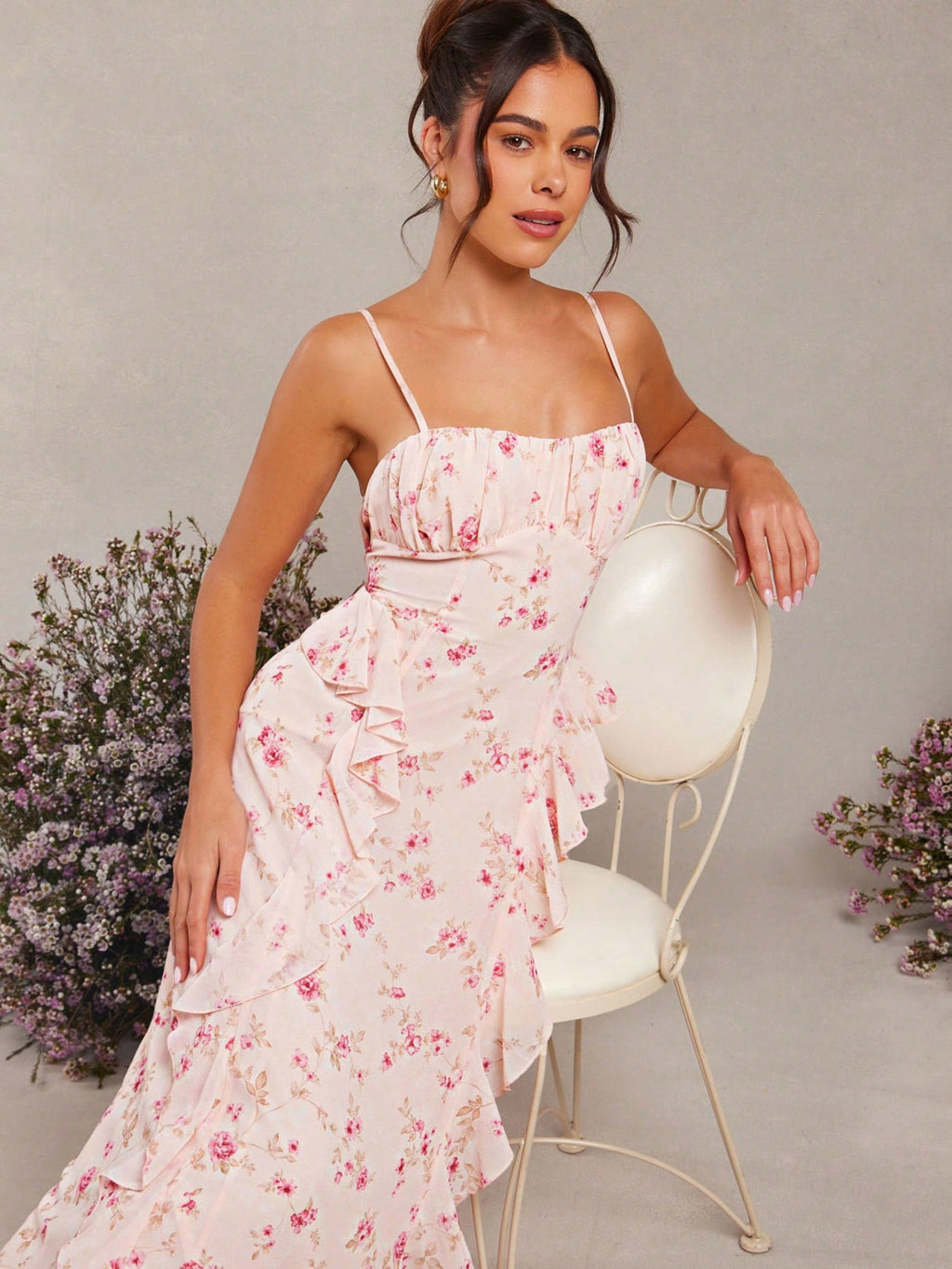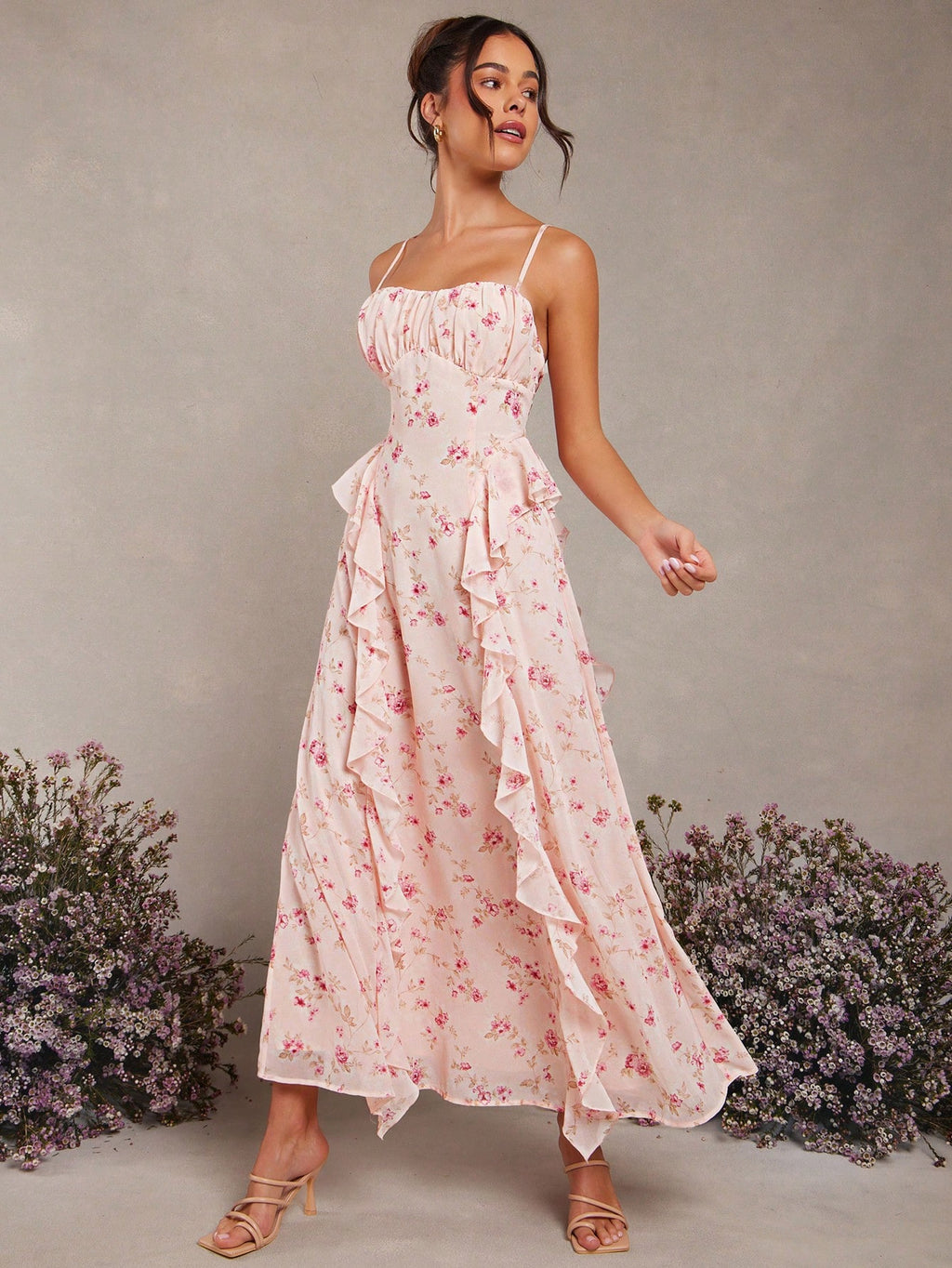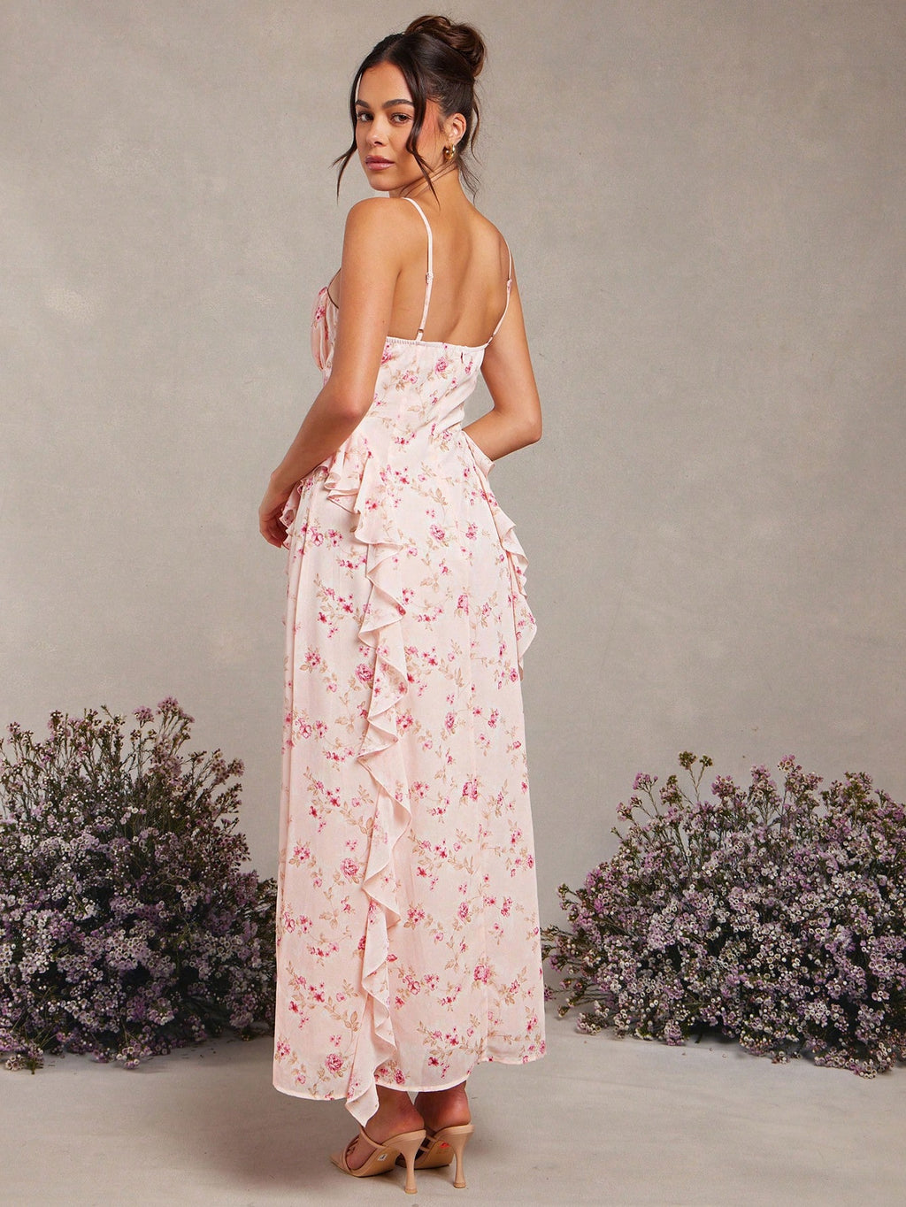 MIU Summer Women Outfit, Women Clothes, Pink Floral Printed Bustier Maxi Dress With Ruffle Detail, Women Dresses, Summer Women Outfit, Summer Women Dresses, Elegant Women Dresses, Spring Women Dresses, , Formal Women Dress, Wedding, Long Dress
