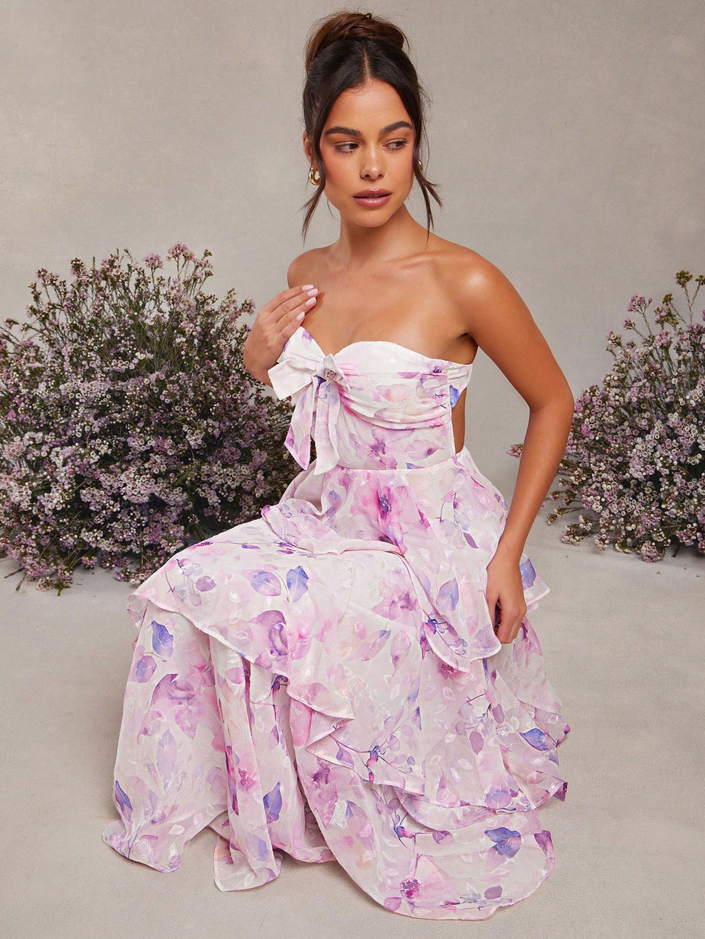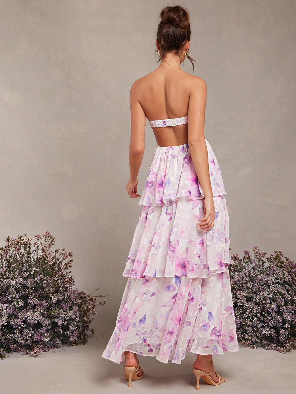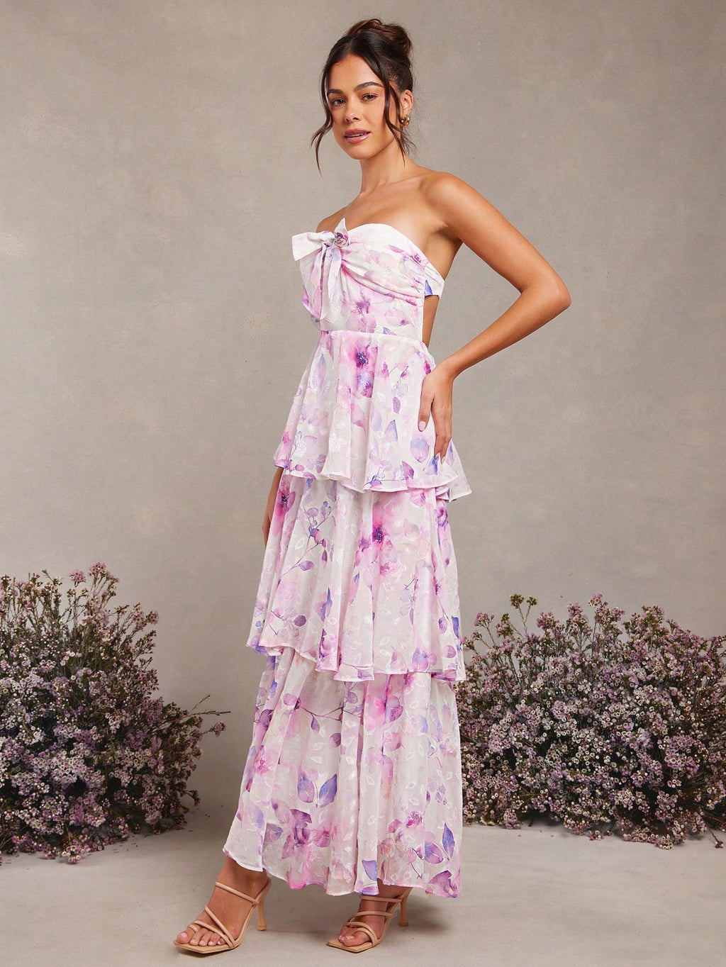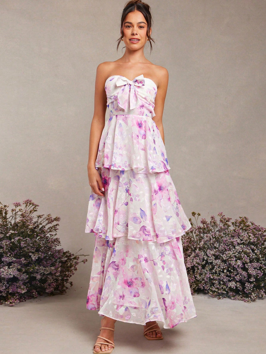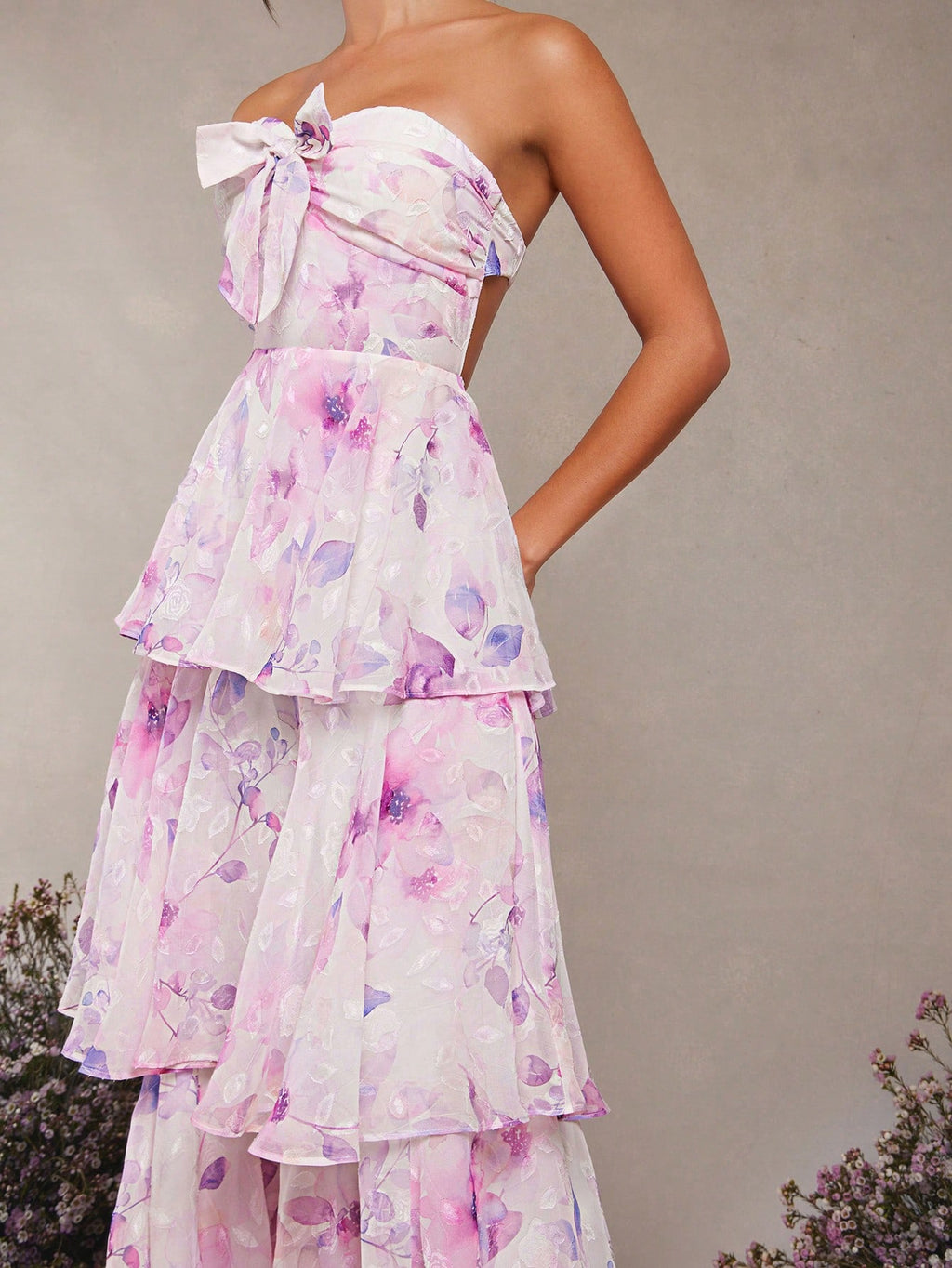 MIU Summer Women Outfit, Women Clothes, Women's White And Purple Floral Print Bow Decor Ruffle Hem Bandeau Backless Maxi Dress, Women Dresses, Summer Women Dresses, Summer Women Outfit, Elegant Women Outfit, Weddig, Long Dress