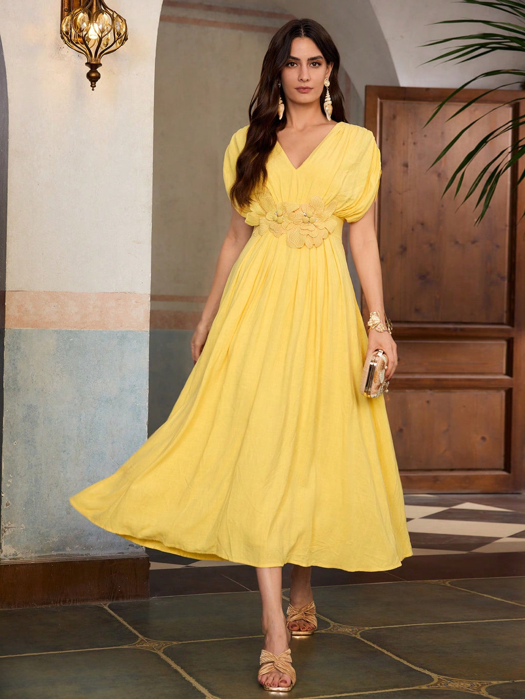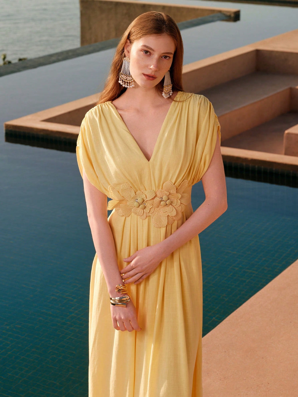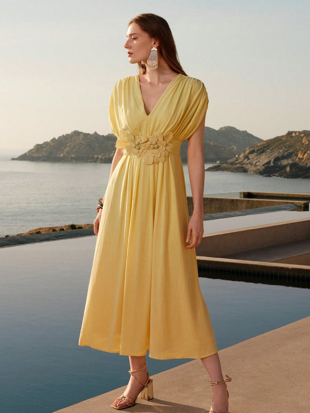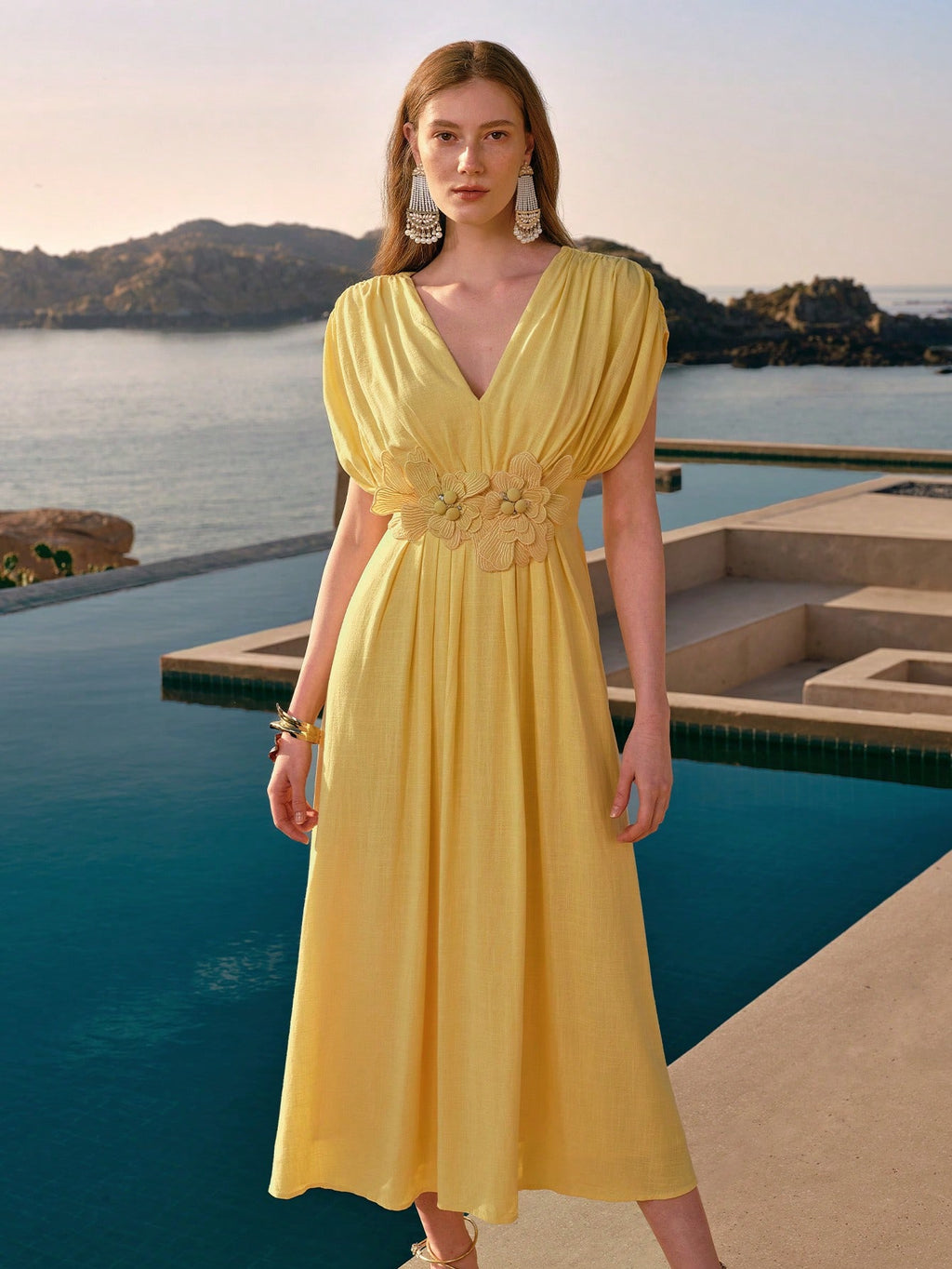 MIU V-Neck 3D Floral Short Sleeve Dress, Vacation Style, Spring/Summer