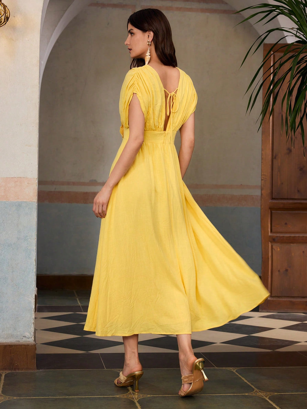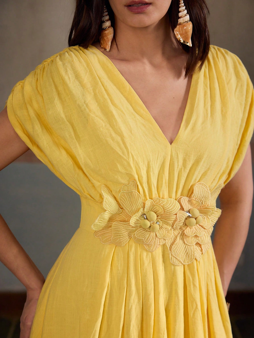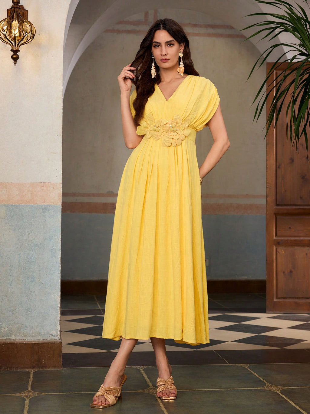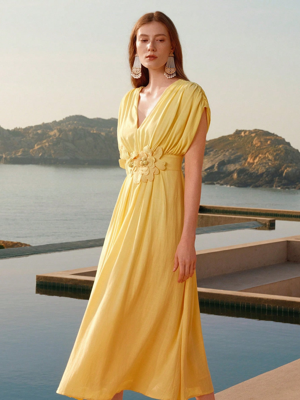 MIU V-Neck 3D Floral Short Sleeve Dress, Vacation Style, Spring/Summer