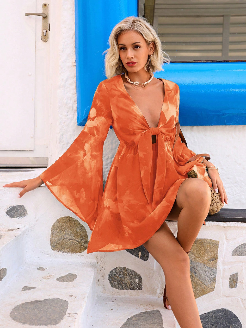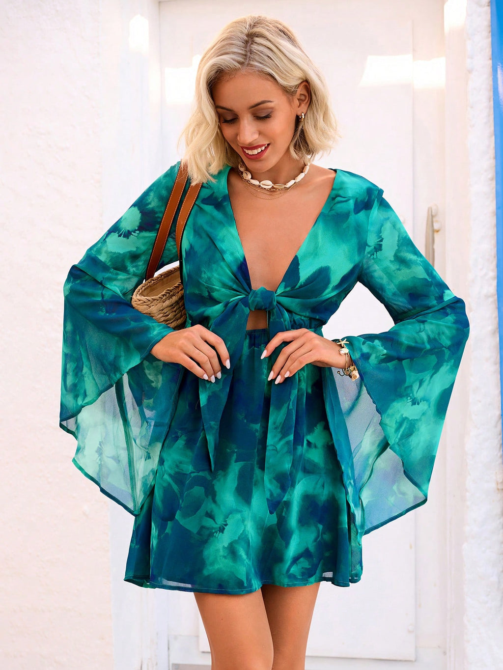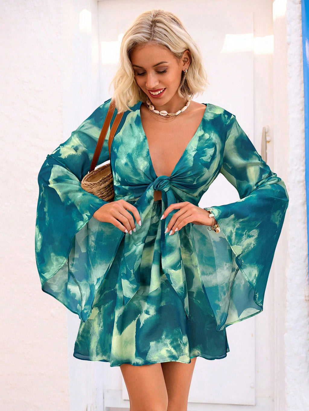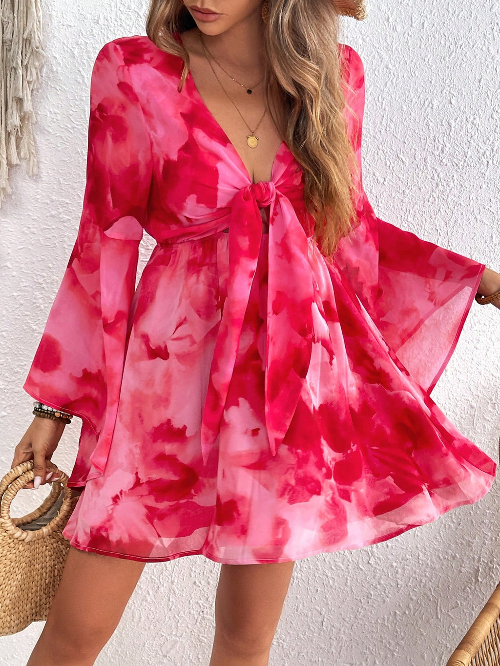 MIU Vacation Woven Chiffon Sfumato Pattern Printed V-Neck Front Collar Bow Flare Asymmetrical Long Sleeve Mini Sundress Summer Dress For Women, Dress To Impress 25 Styles