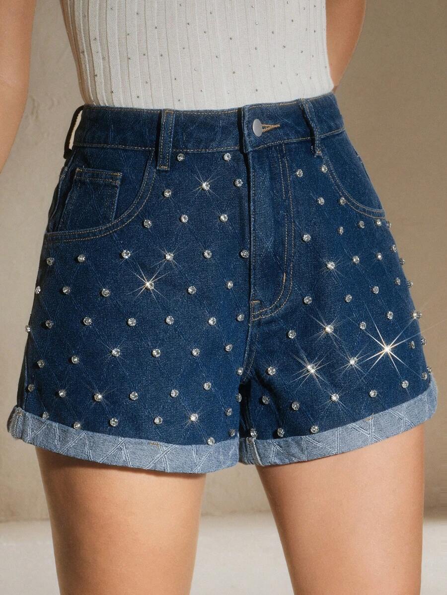 MIU Versatile Vintage Rhinestone Embellished Denim Skort, Suitable For Summer, Festival, Holiday, Beach Vacation, Elegant And Casual Wear