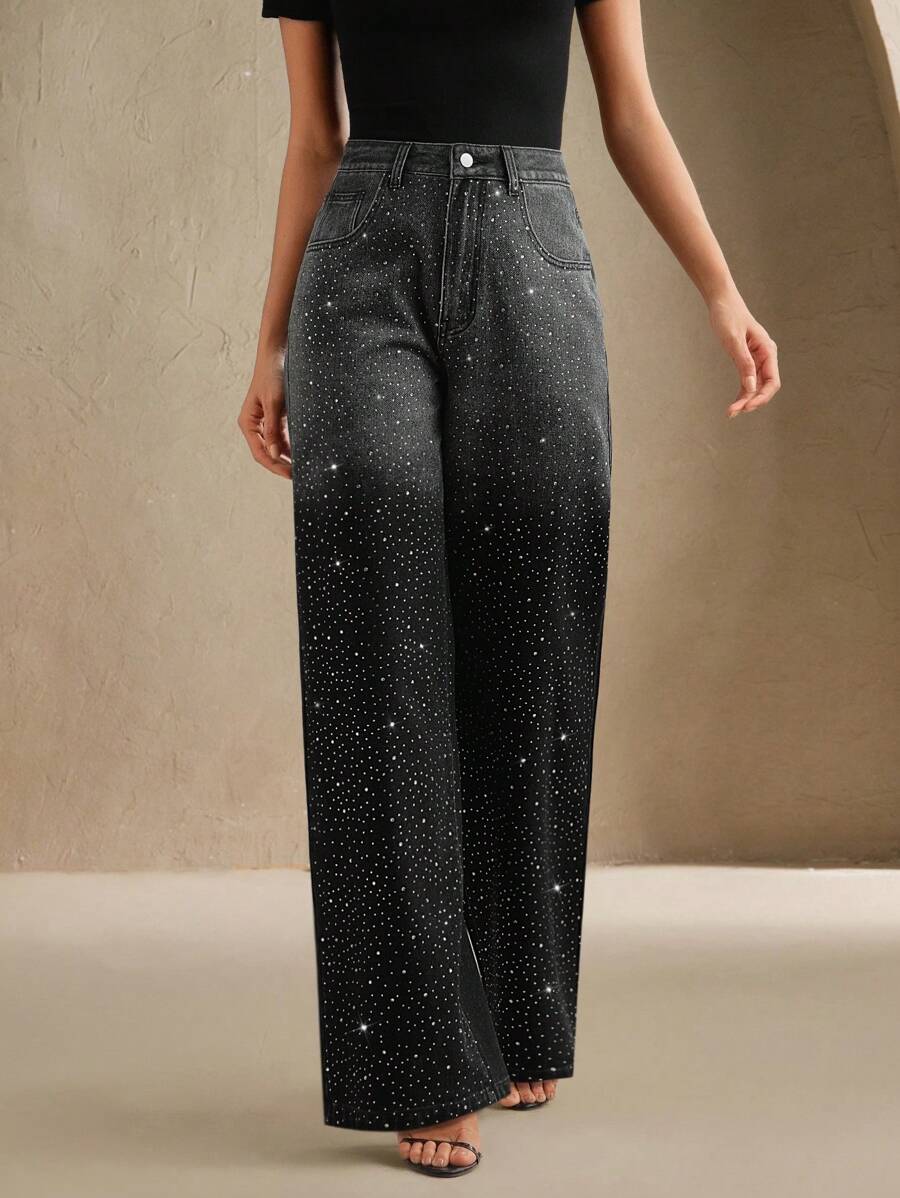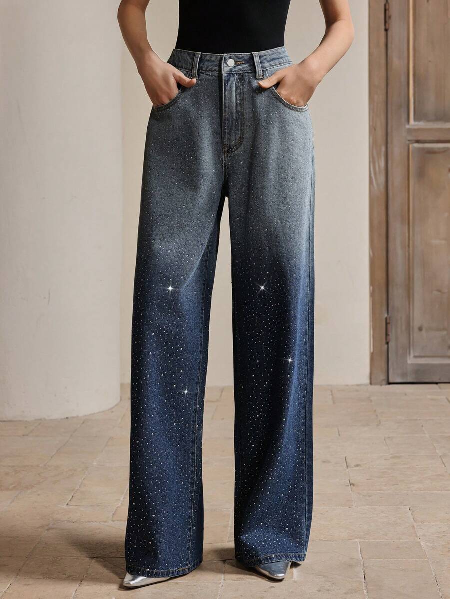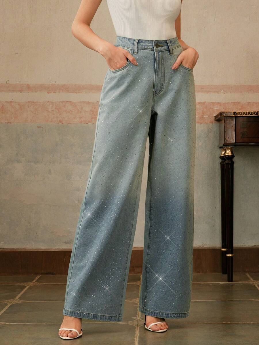 MIU Vintage Embellished Loose Flare Leg Jeans For Women, Elegant, Festival, Casual