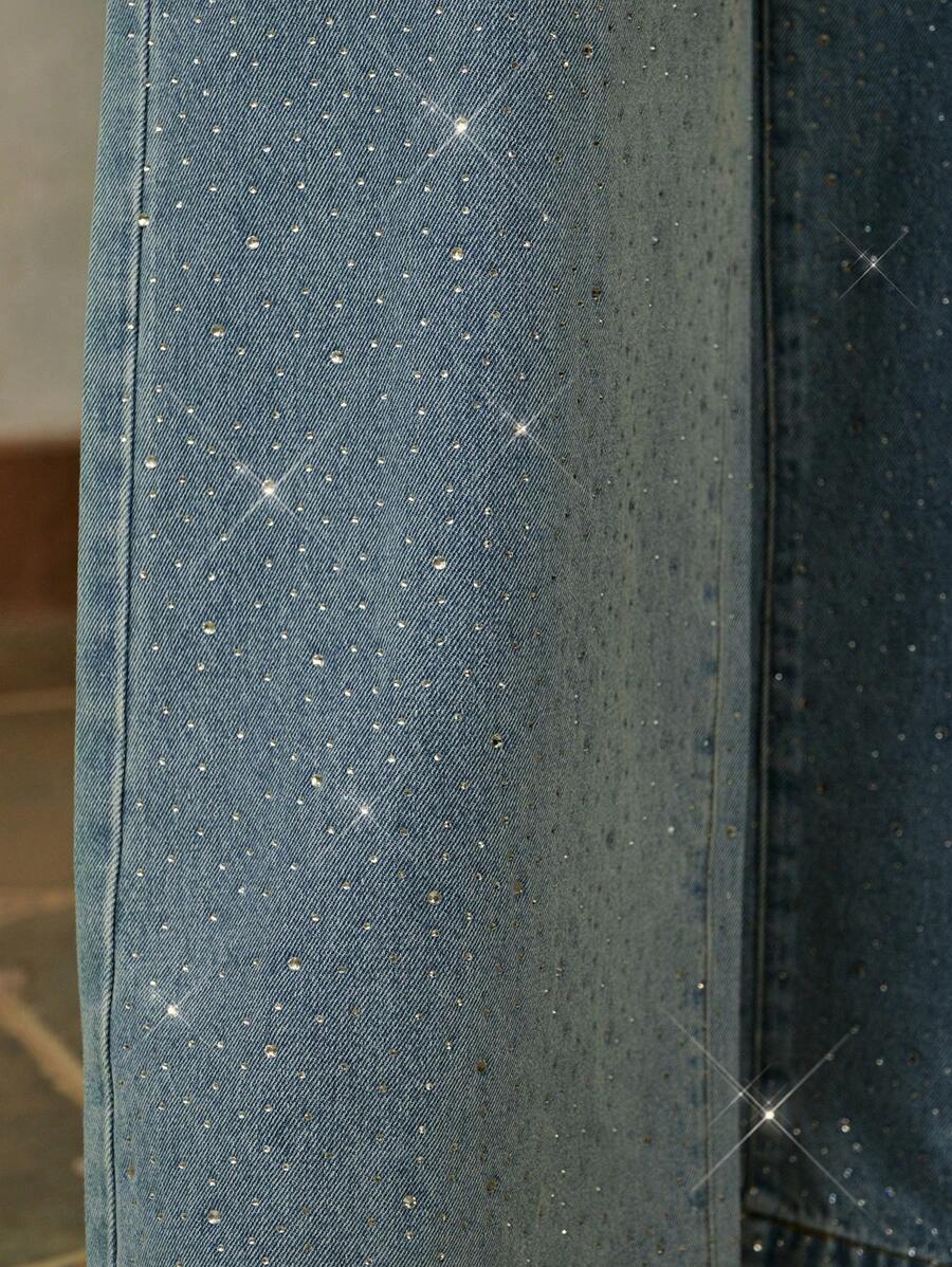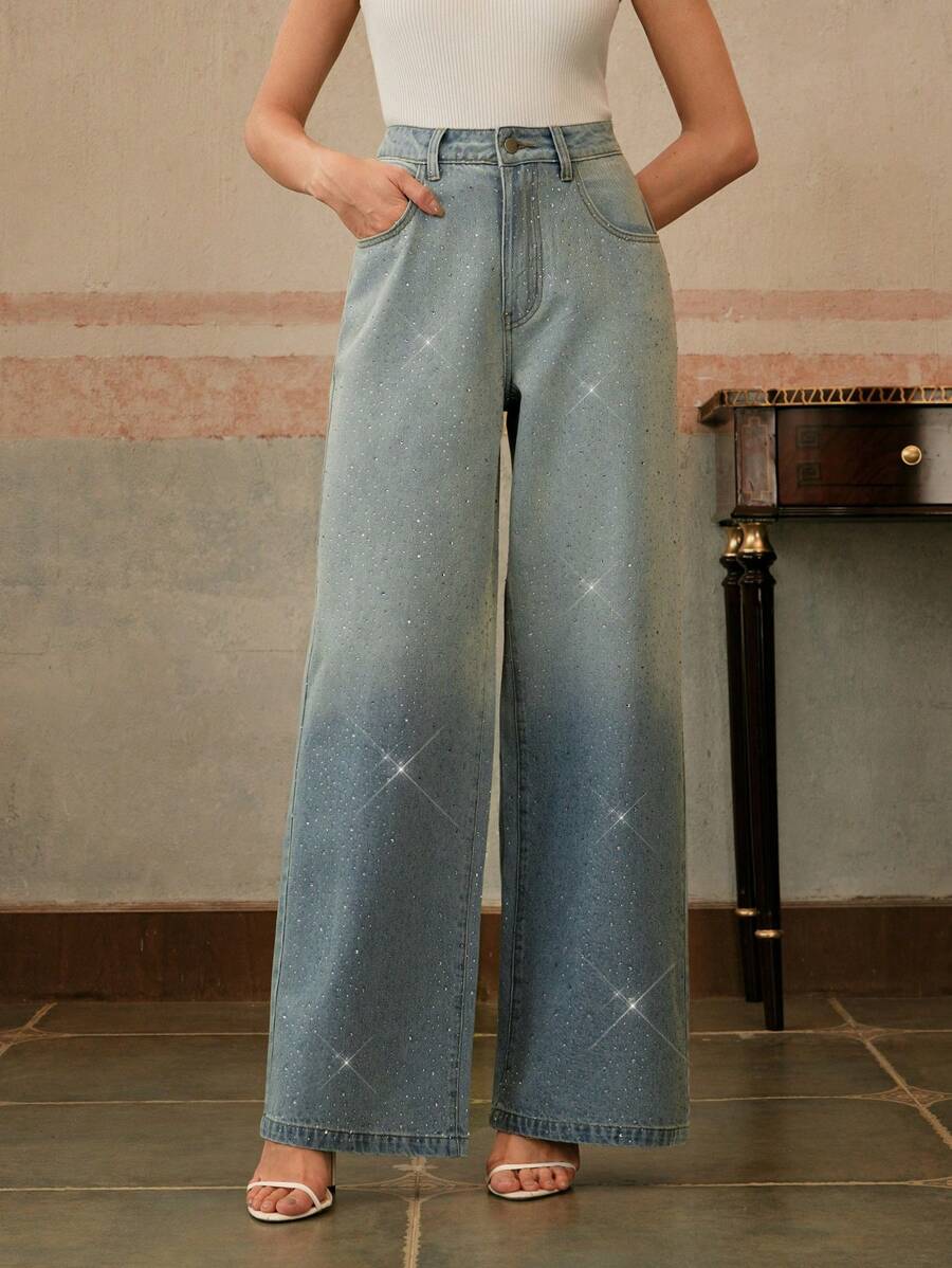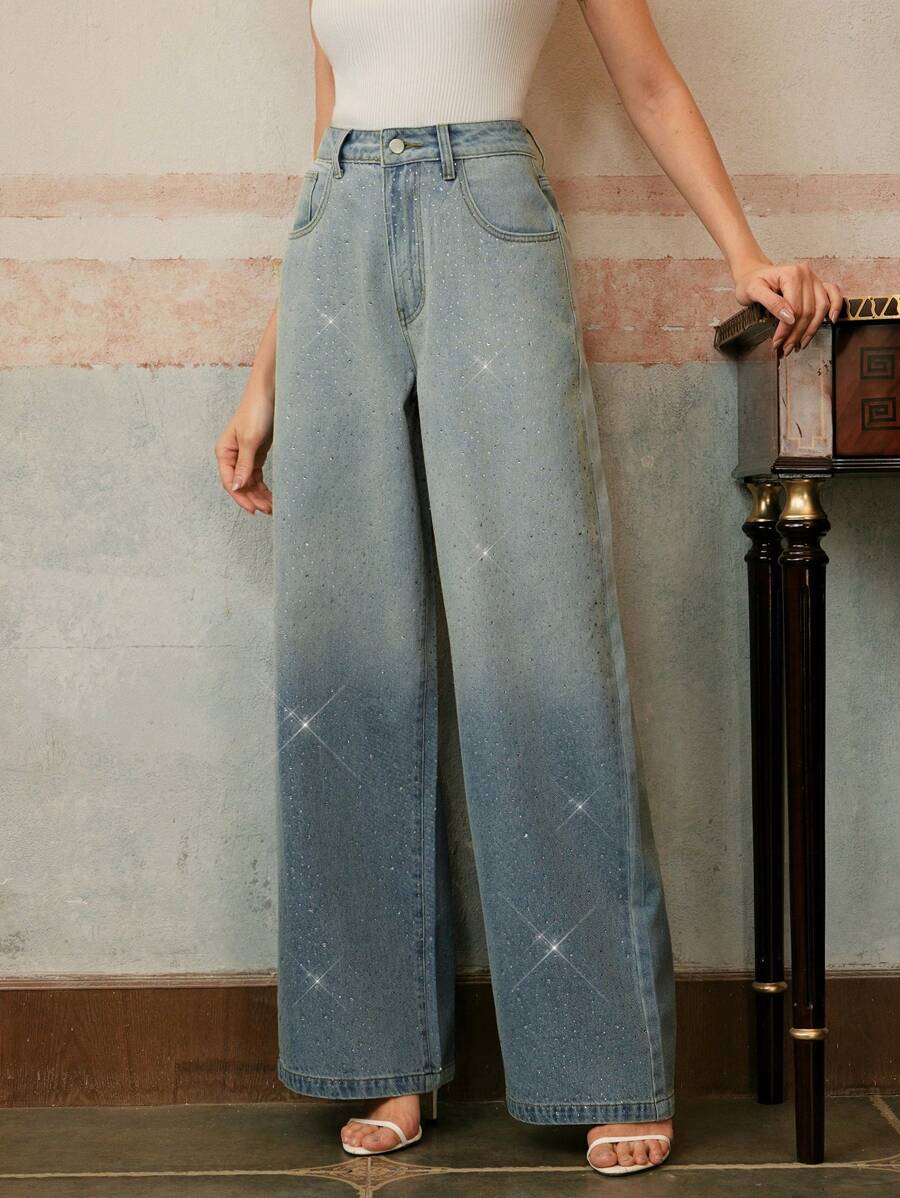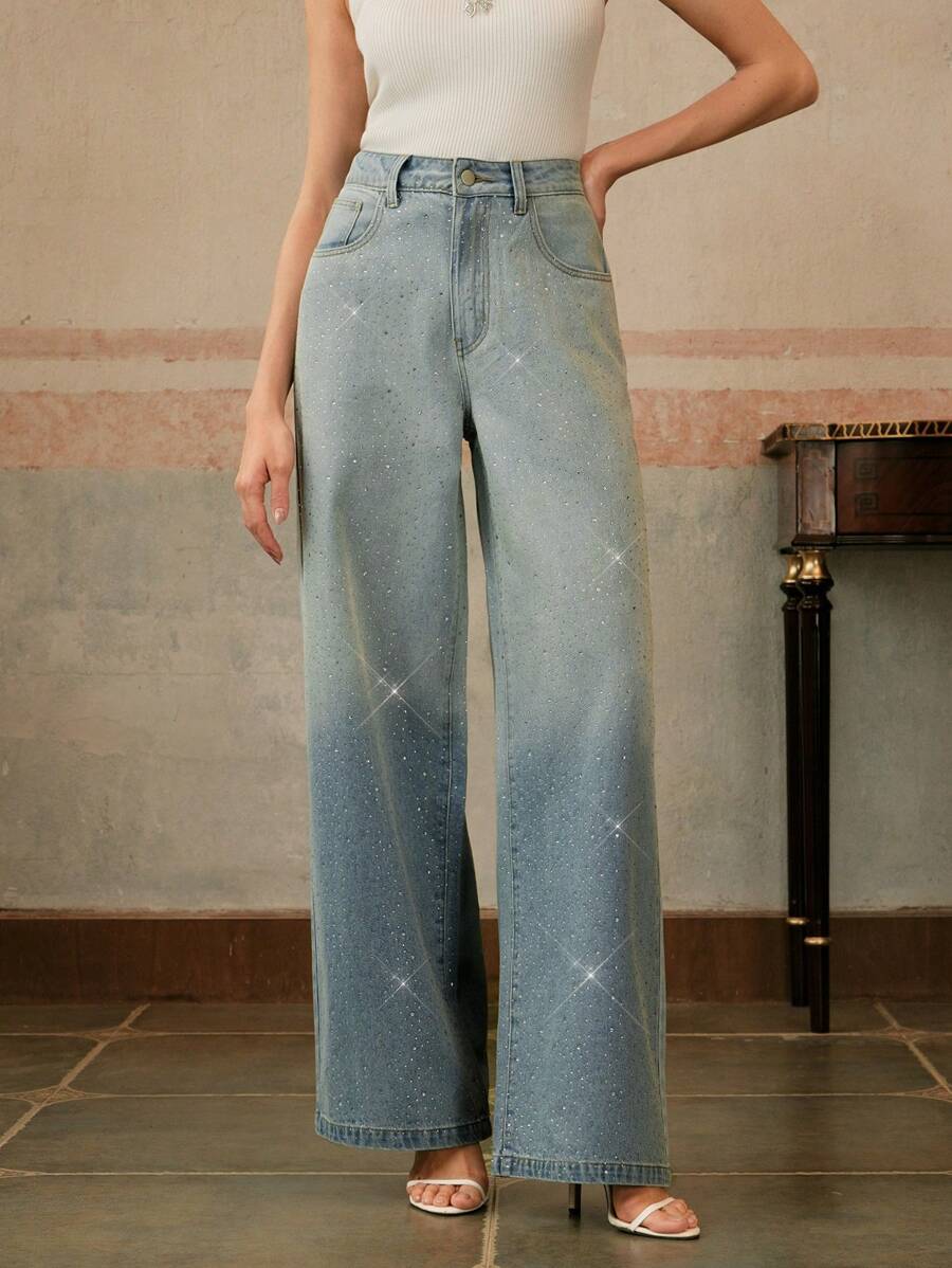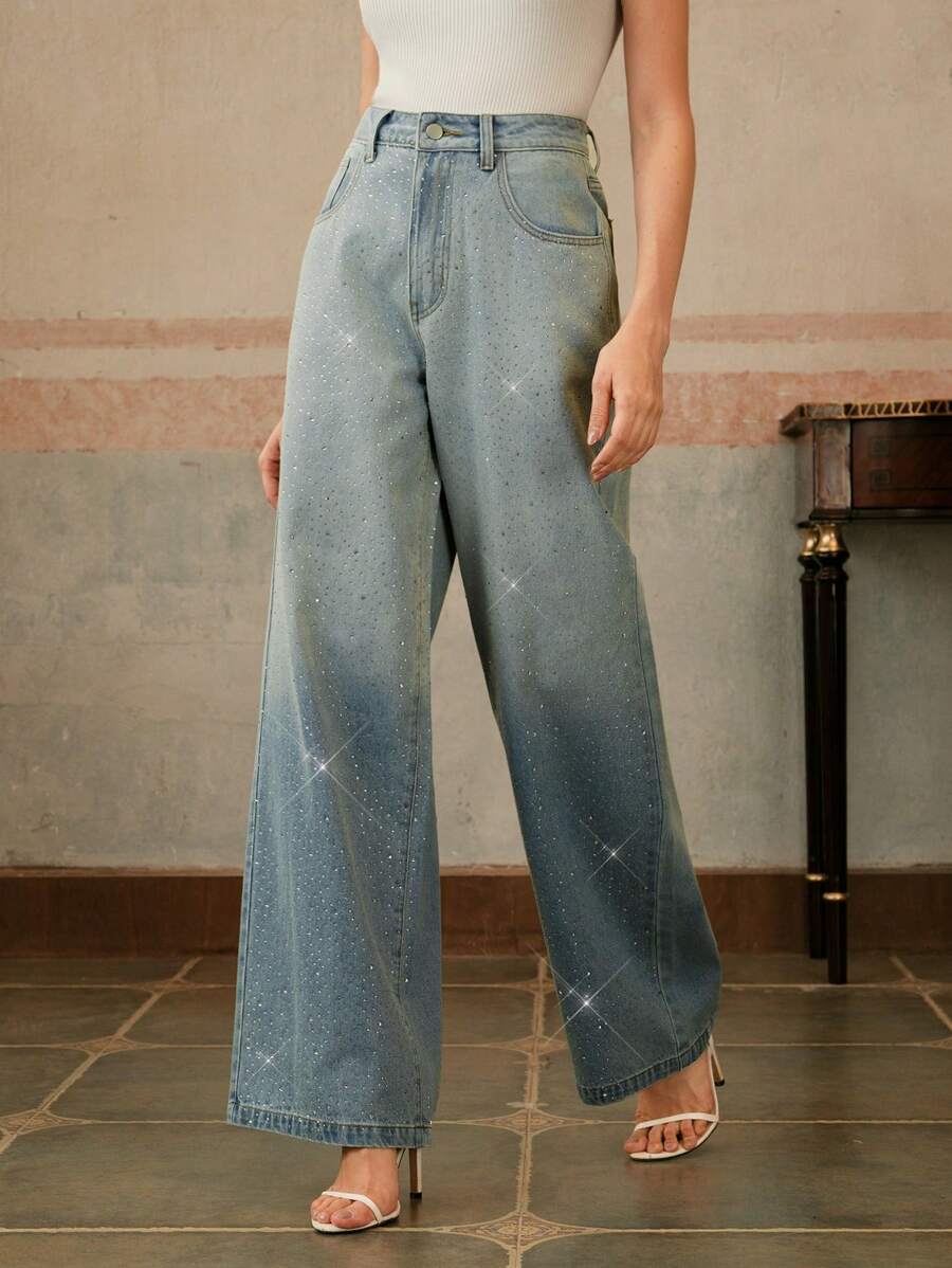 MIU Vintage Heavily Embellished Relaxed Wide-Leg Jeans For Women, Elegant, Festive, Casual