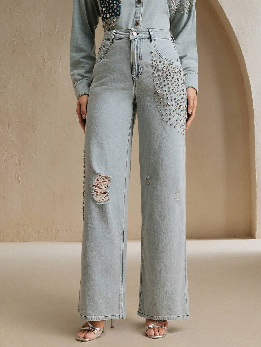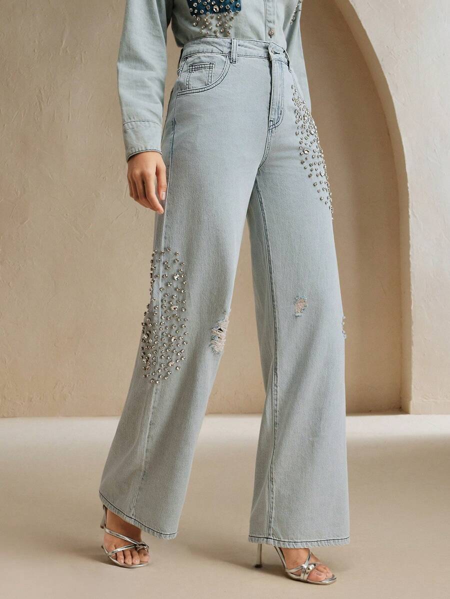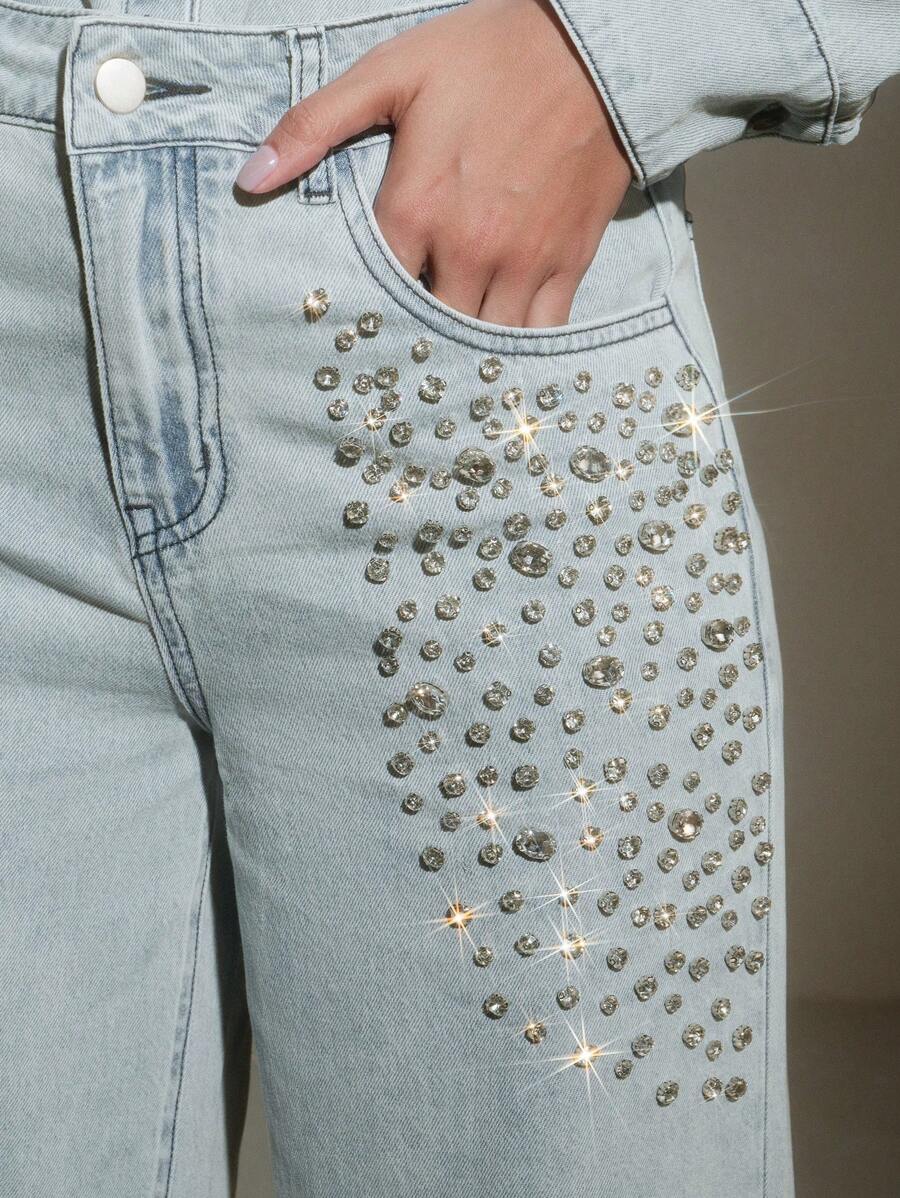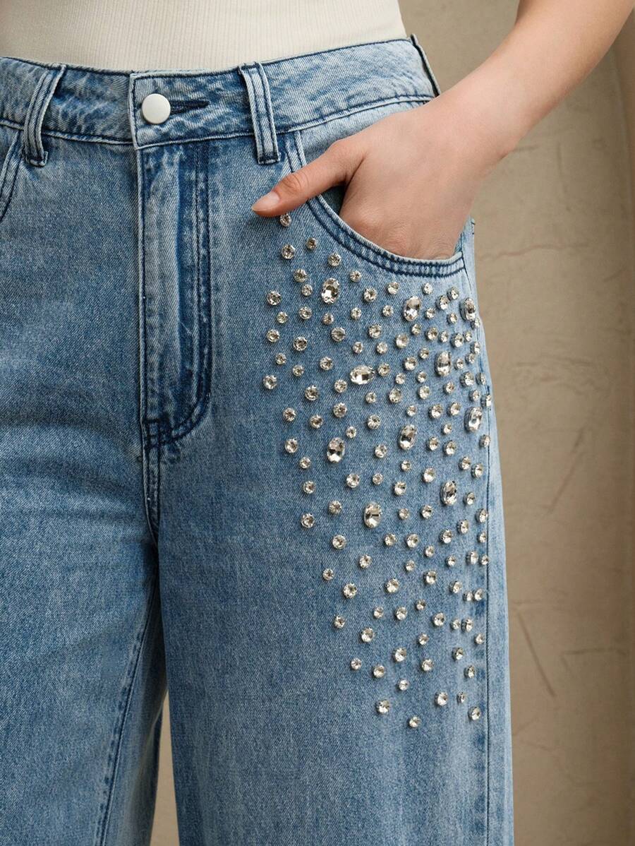 MIU Vintage Rhinestone Studded Straight-Leg Jeans For Women, Casual