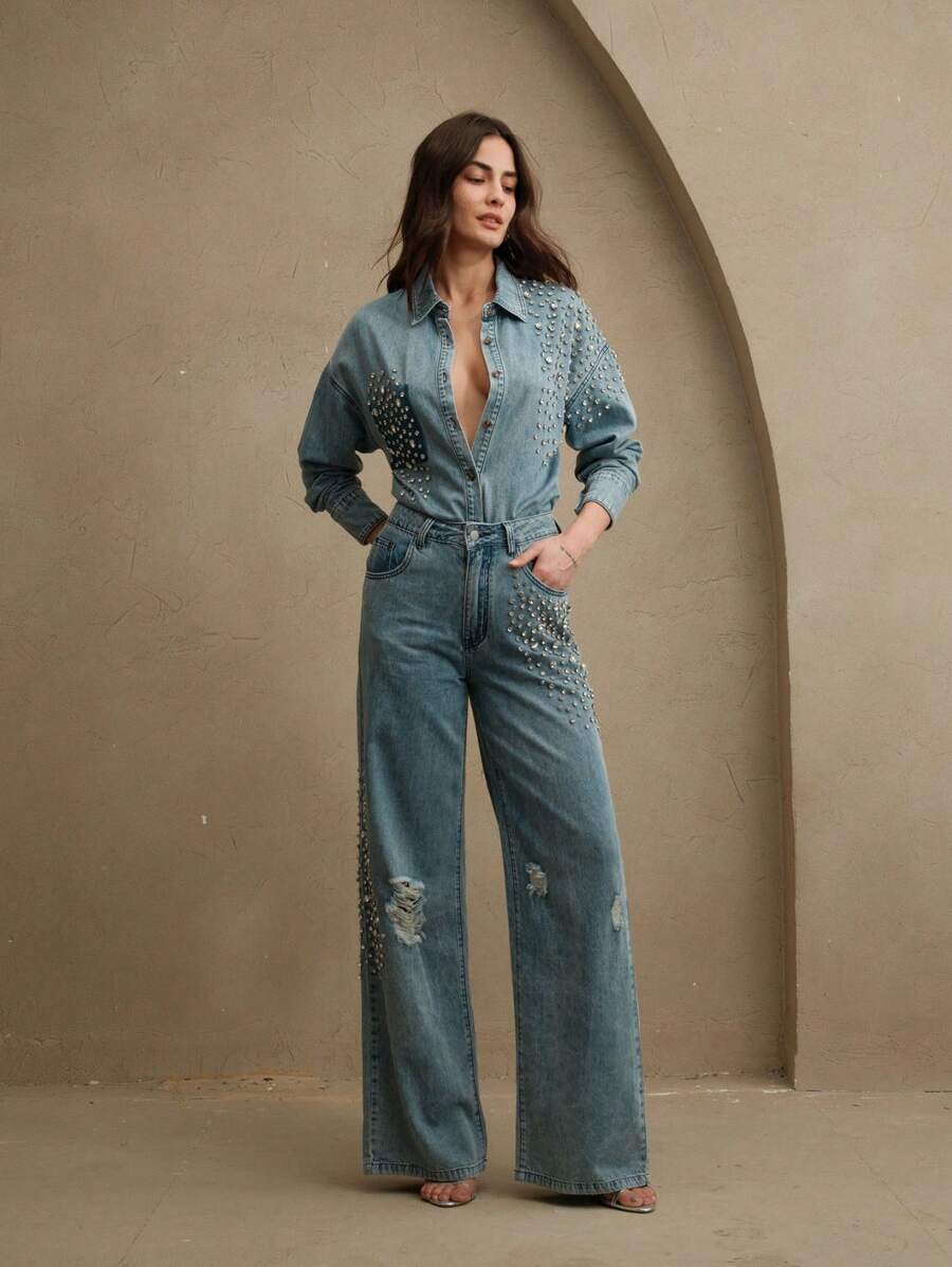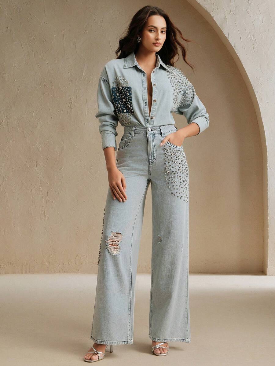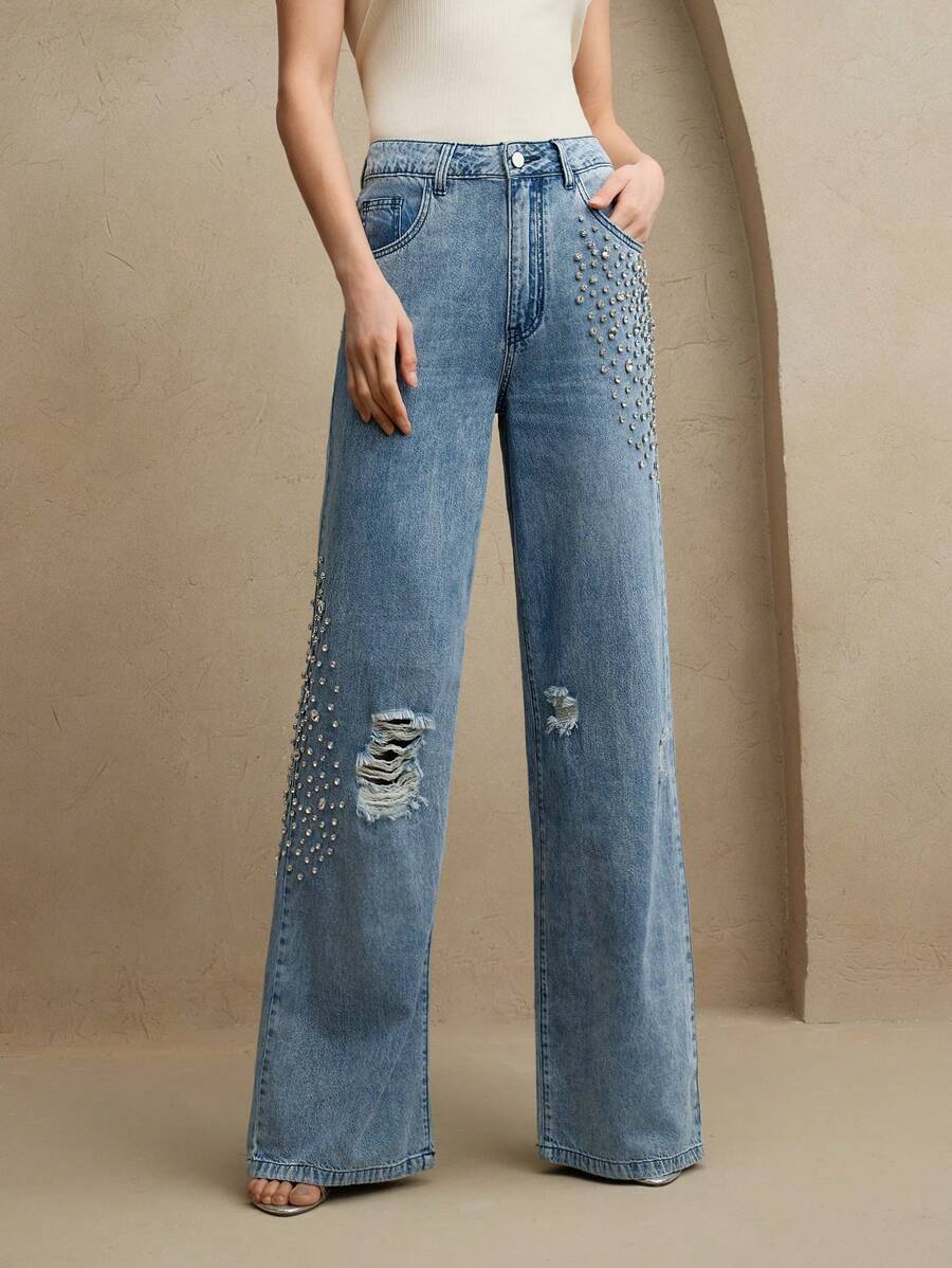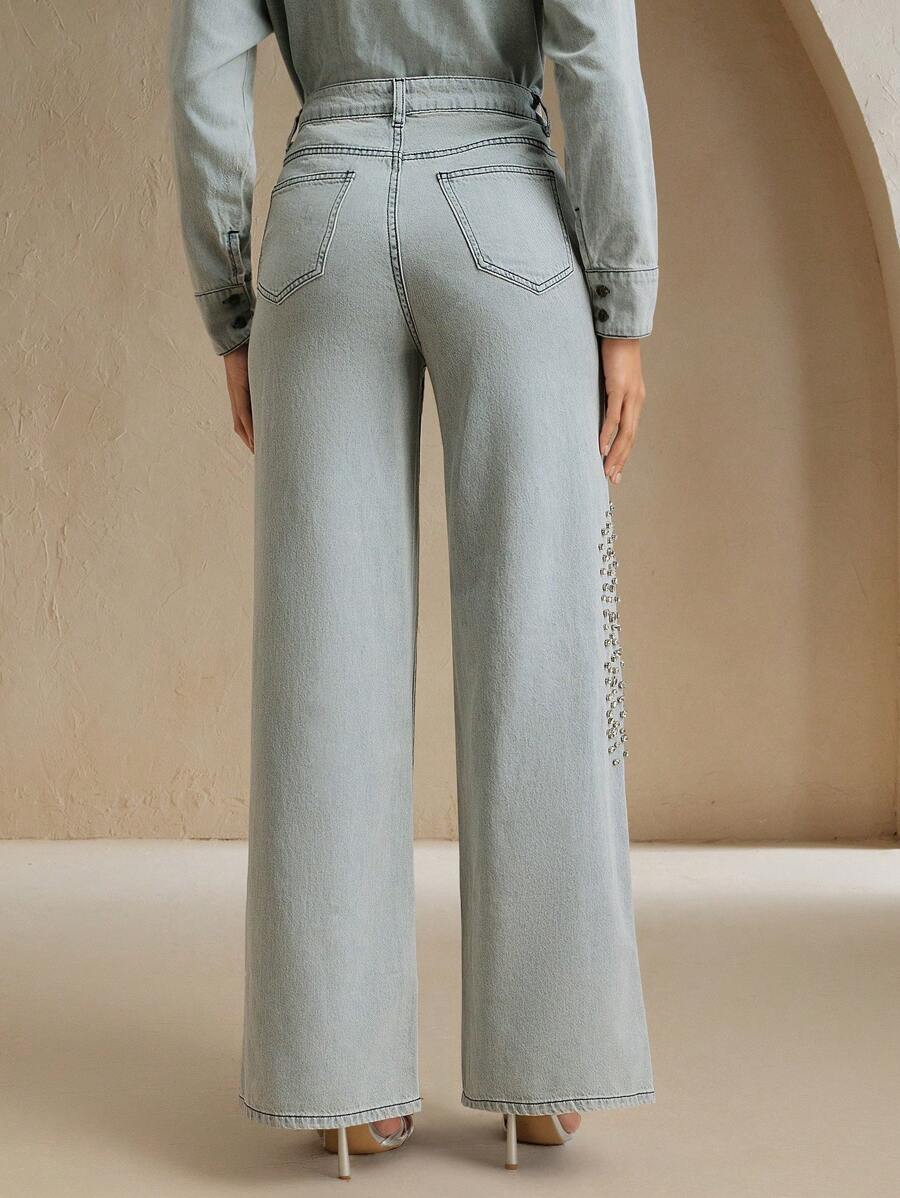MIU Vintage Rhinestone Studded Straight-Leg Jeans For Women, Casual