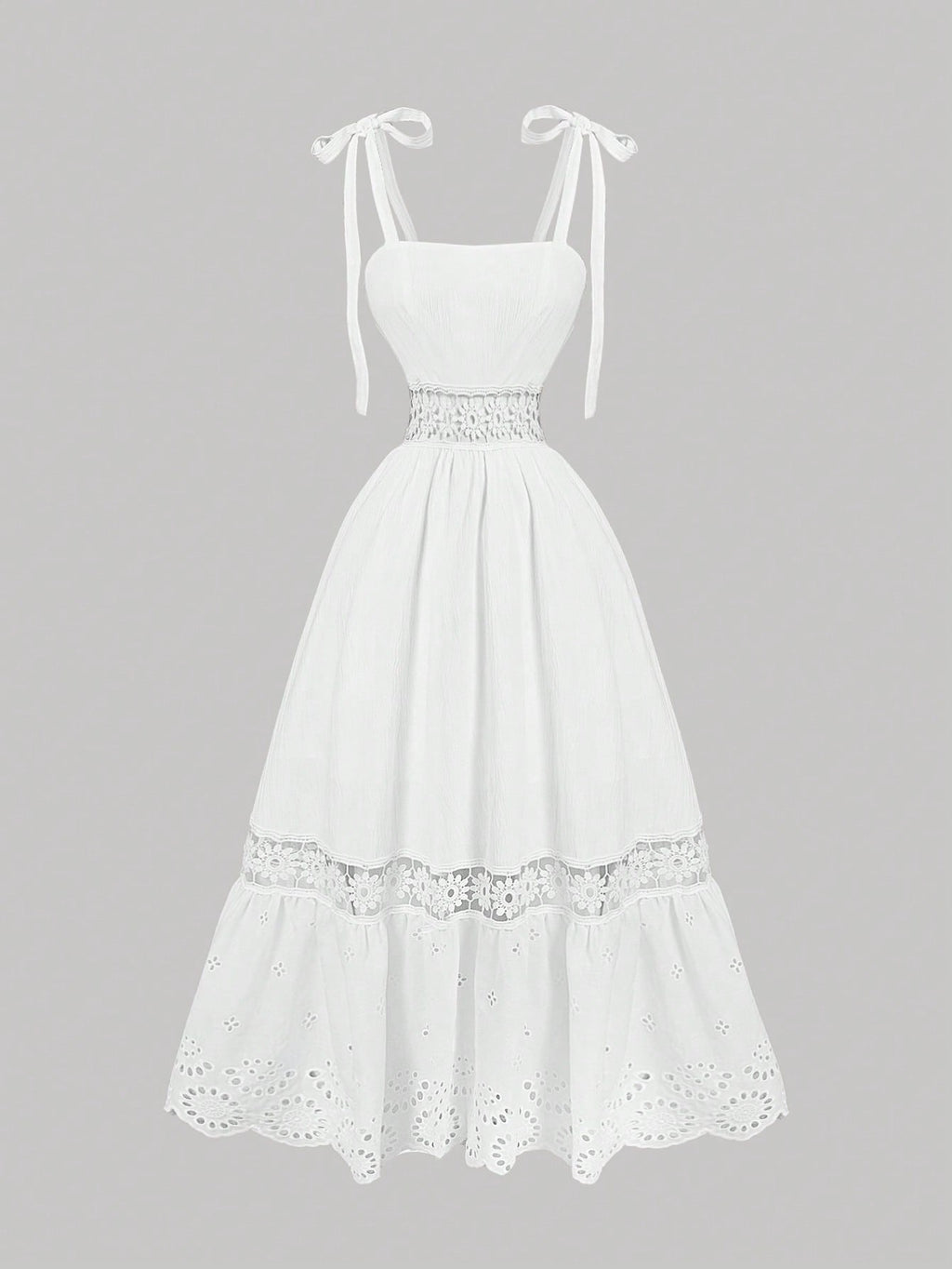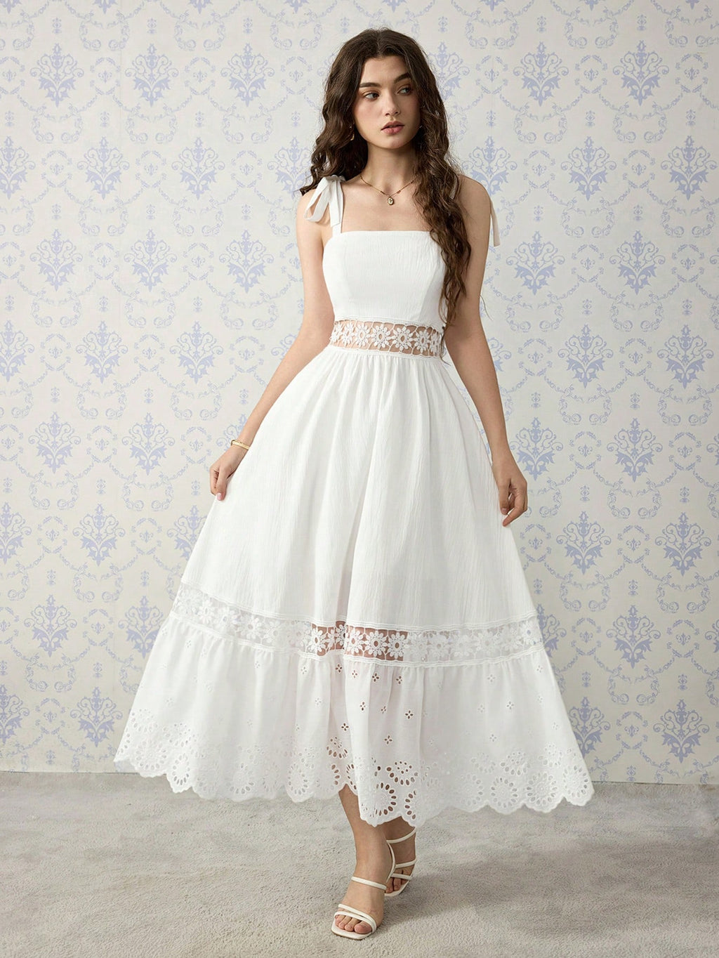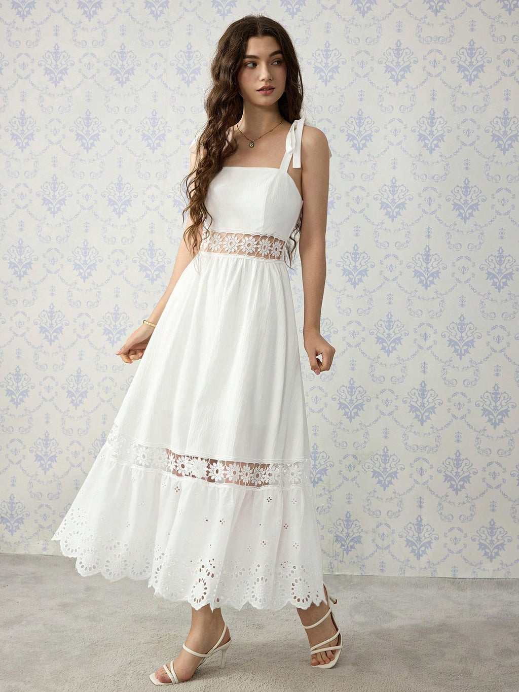 MIU White Hollow Embroidered Tie Bow Ruffle Hem Maxi Skirt, Boho Style, Western Vibe, Holiday, Picnic, Beach,Valentines Clothes,Vacation Outfits Woman,Summer Outfits For Women,Beach Outfits For Woman,Mardi Gras,Valentines Dress,Rave Outfits Festival