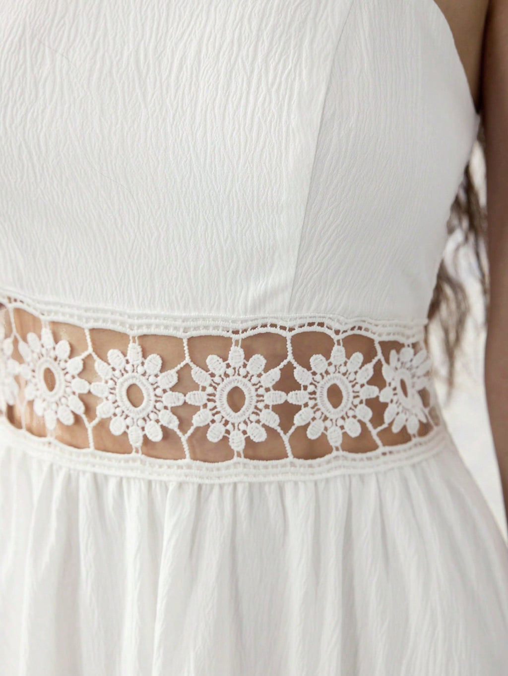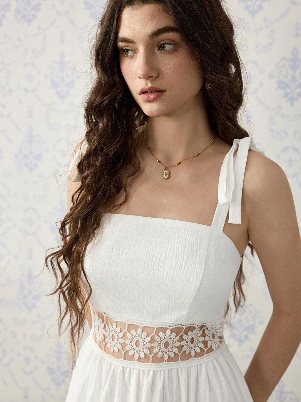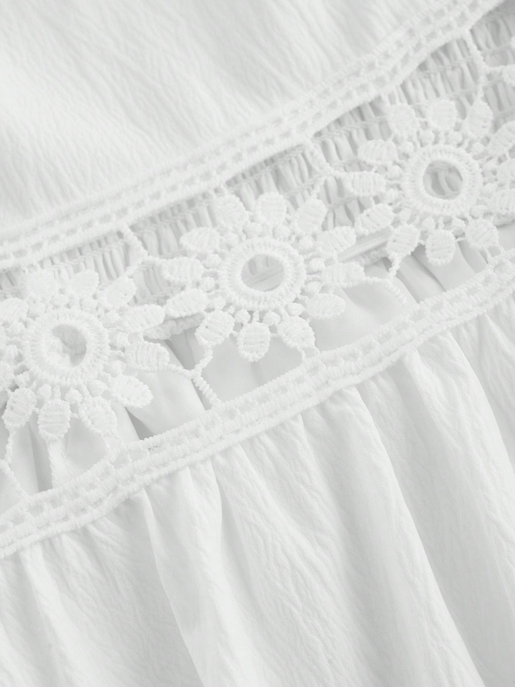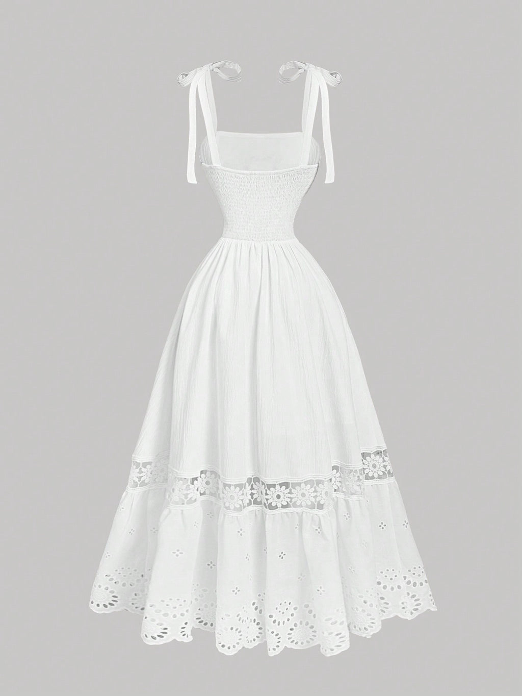 MIU White Hollow Embroidered Tie Bow Ruffle Hem Maxi Skirt, Boho Style, Western Vibe, Holiday, Picnic, Beach,Valentines Clothes,Vacation Outfits Woman,Summer Outfits For Women,Beach Outfits For Woman,Mardi Gras,Valentines Dress,Rave Outfits Festival