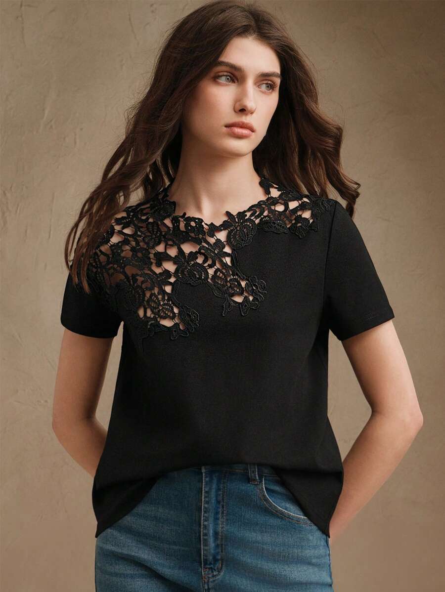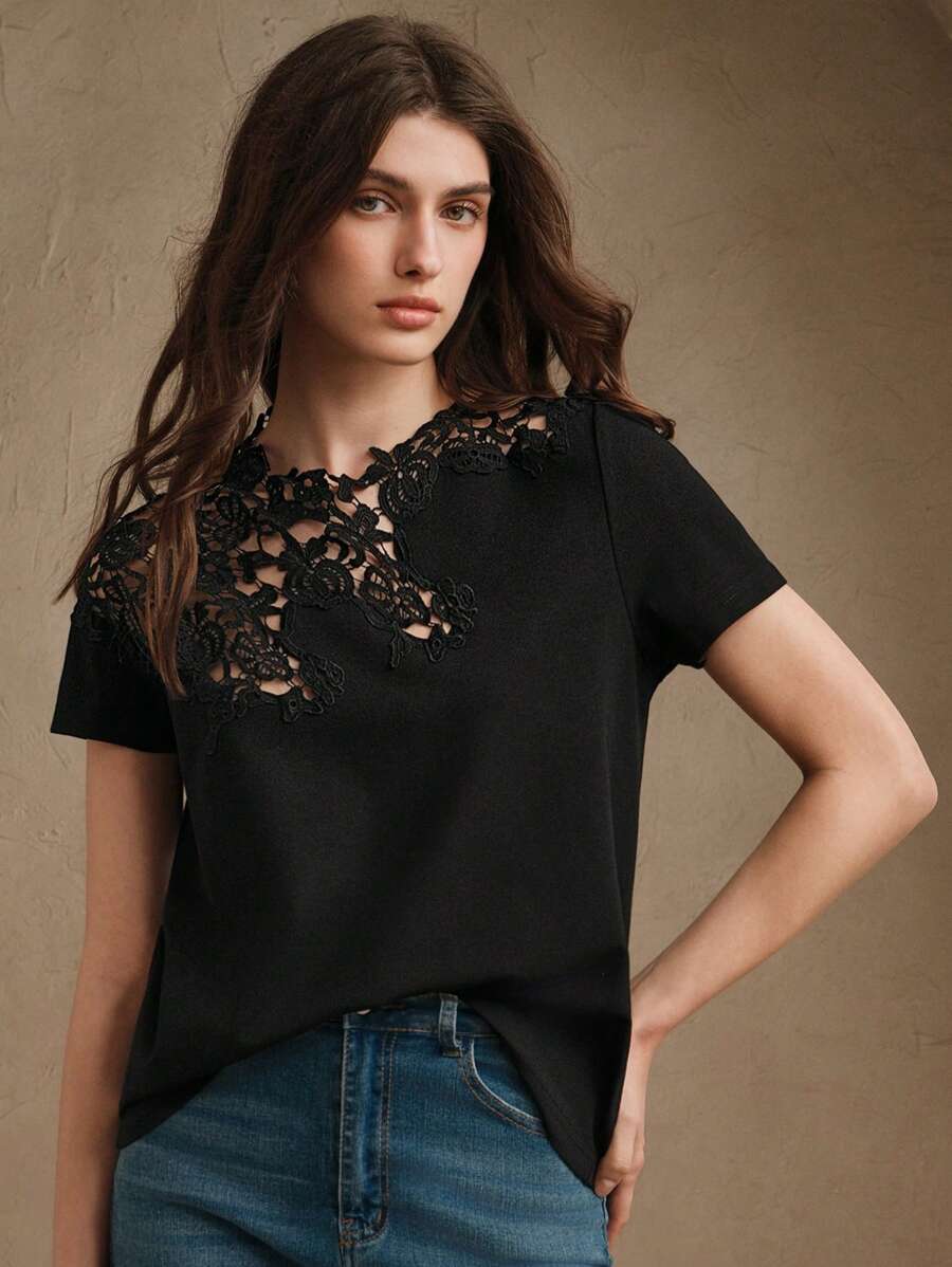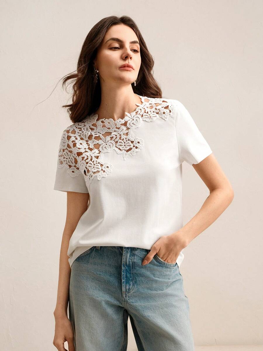 MIU White T-Shirt With Lace Crochet Patchwork Hollow Out Design, Short Sleeve Summer Beach Vacation Fashion Blouse, Valentine's Day, New Year's Outfit