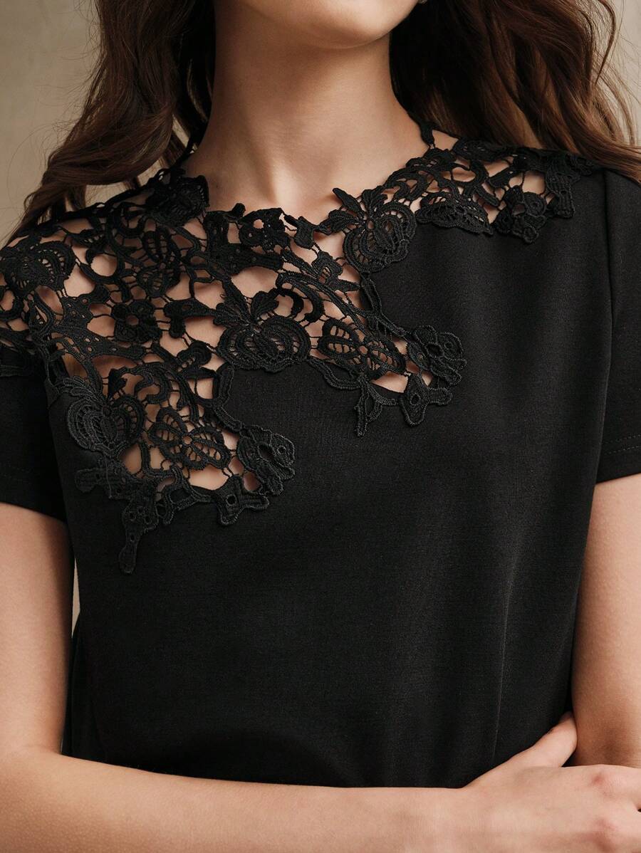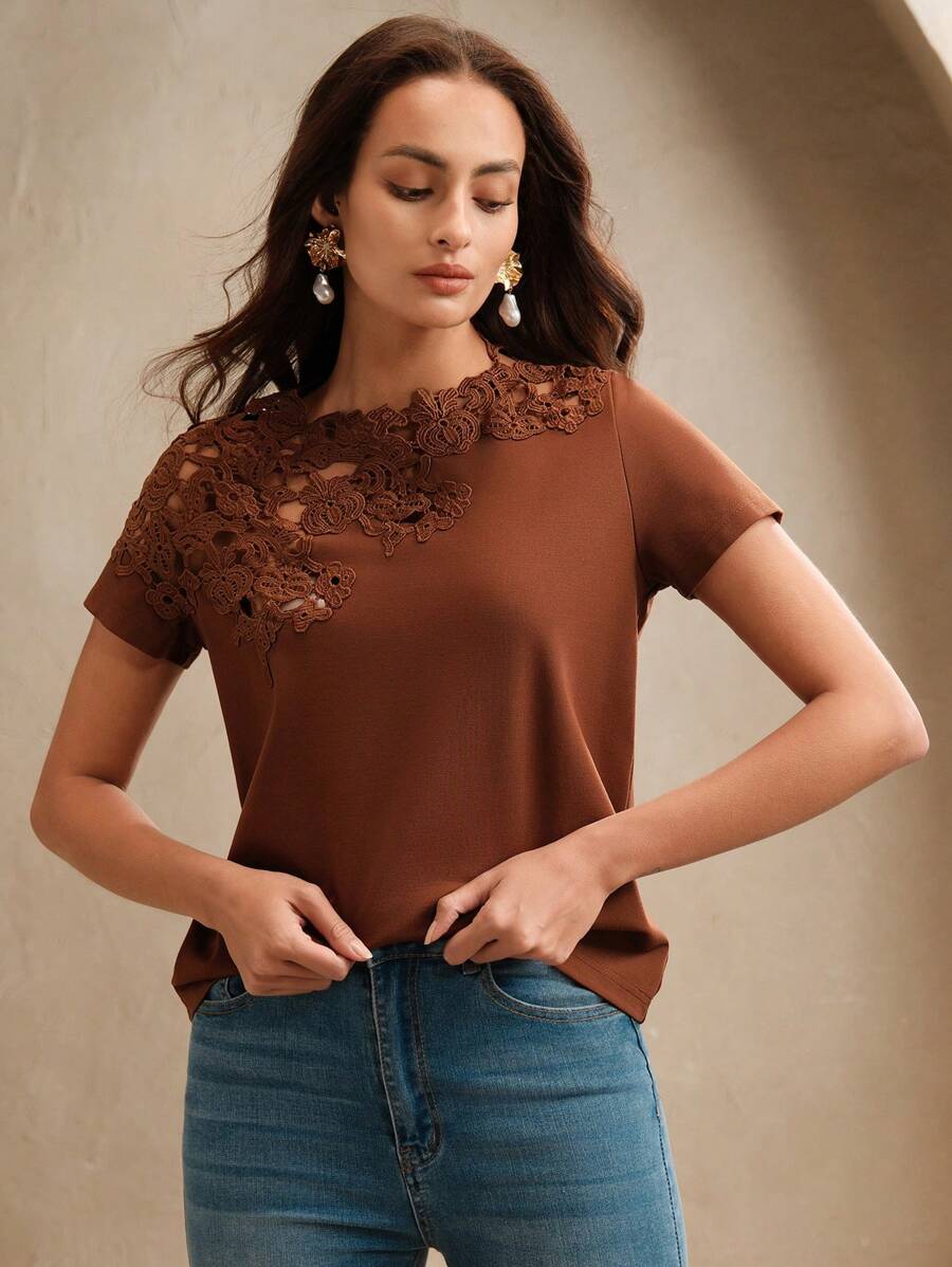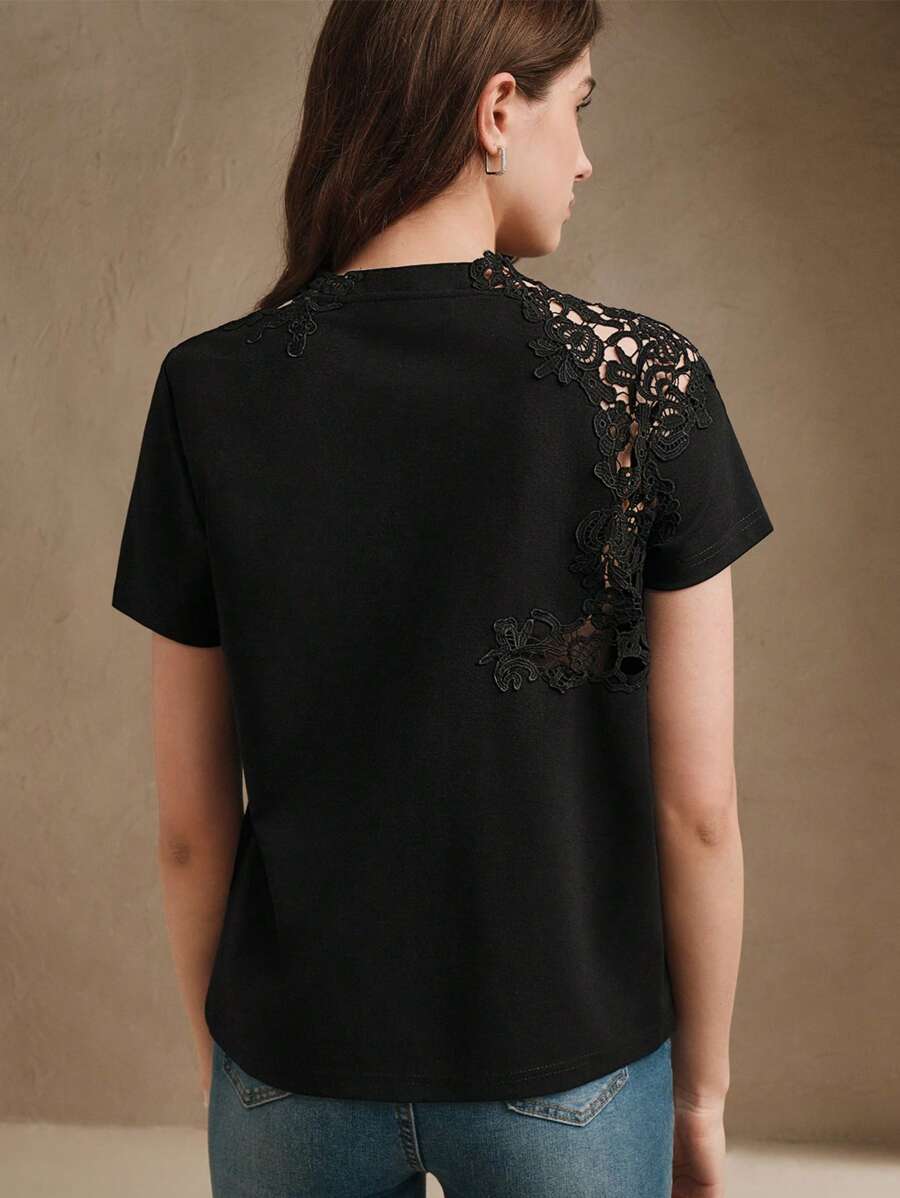 MIU White T-Shirt With Lace Crochet Patchwork Hollow Out Design, Short Sleeve Summer Beach Vacation Fashion Blouse, Valentine's Day, New Year's Outfit