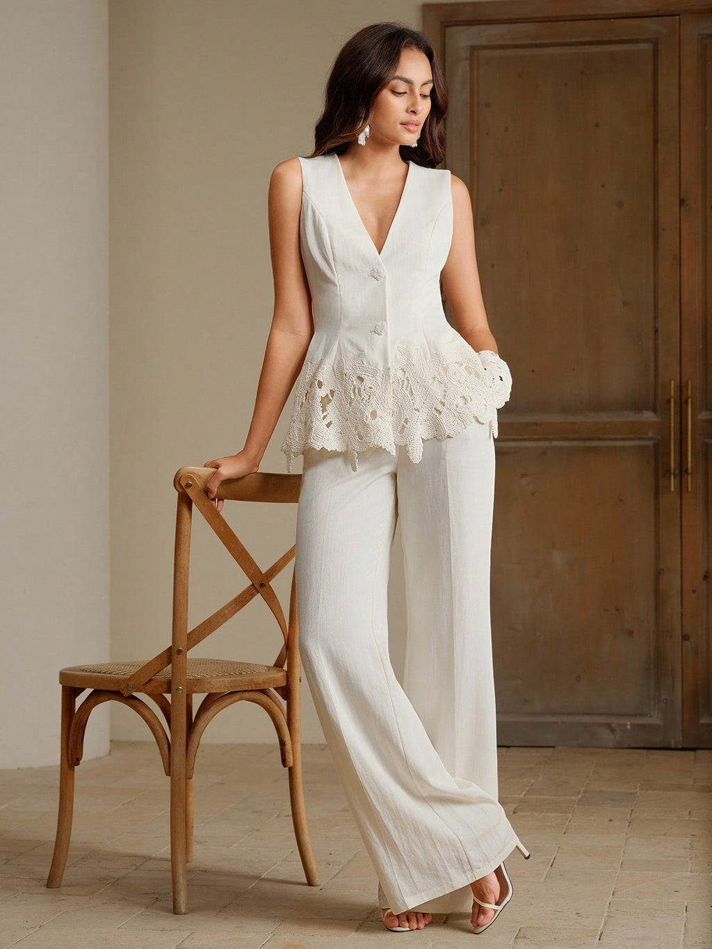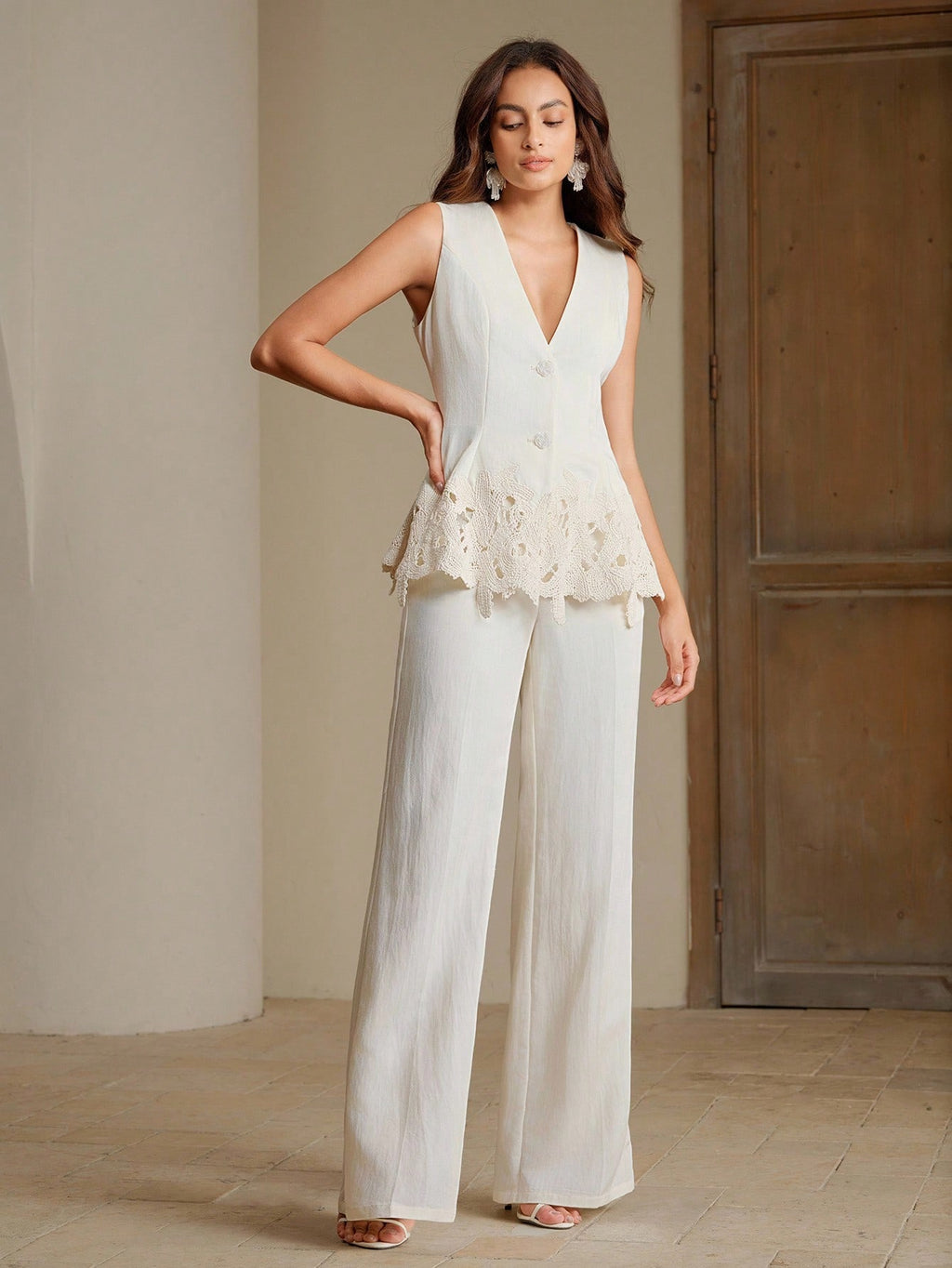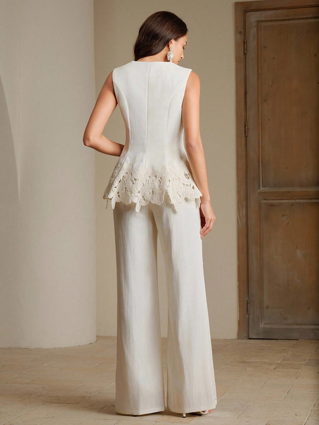MIU White Women's Elegant Embroidered Sleeveless Top And Trouser Professional Suit Set
