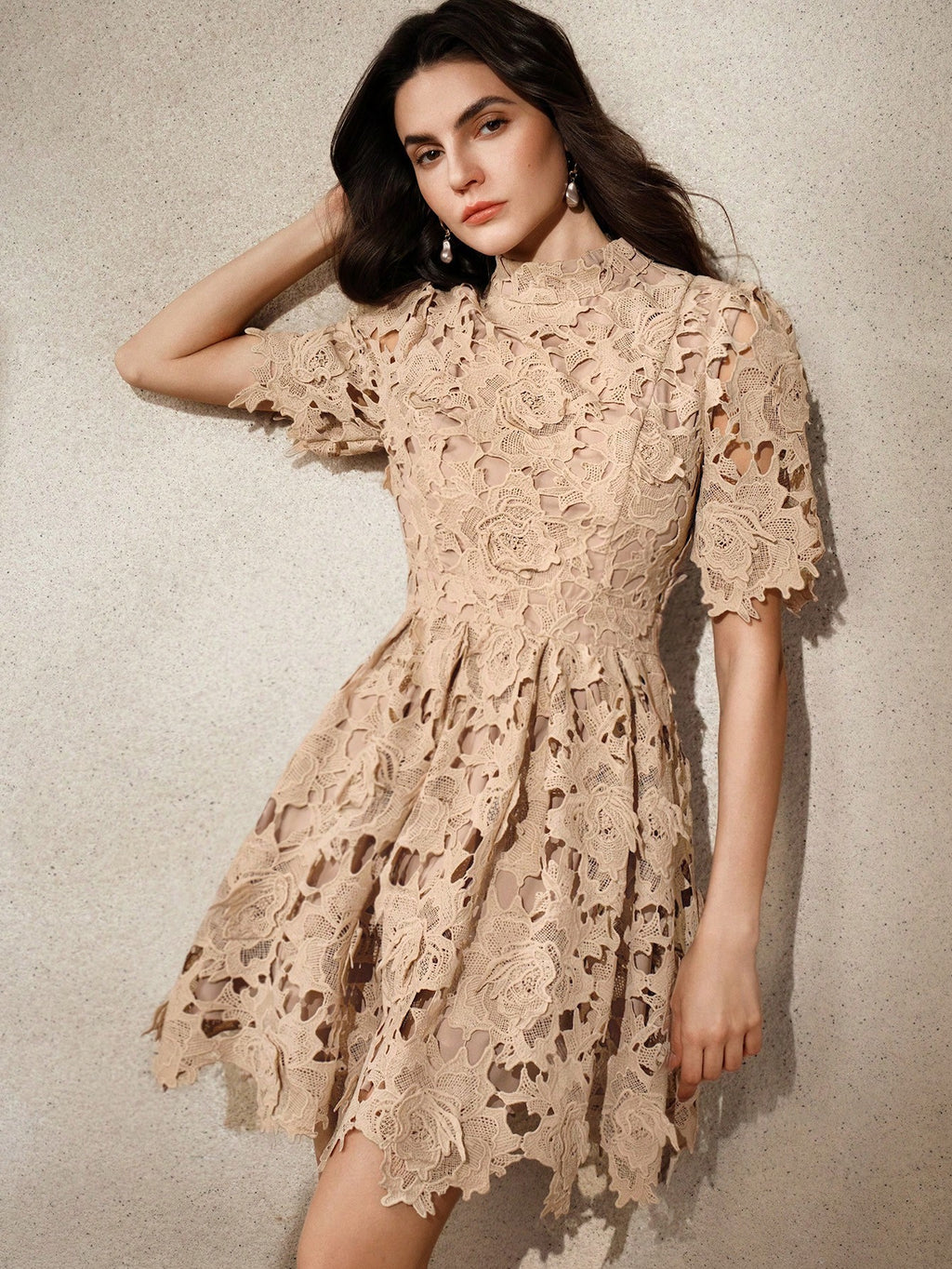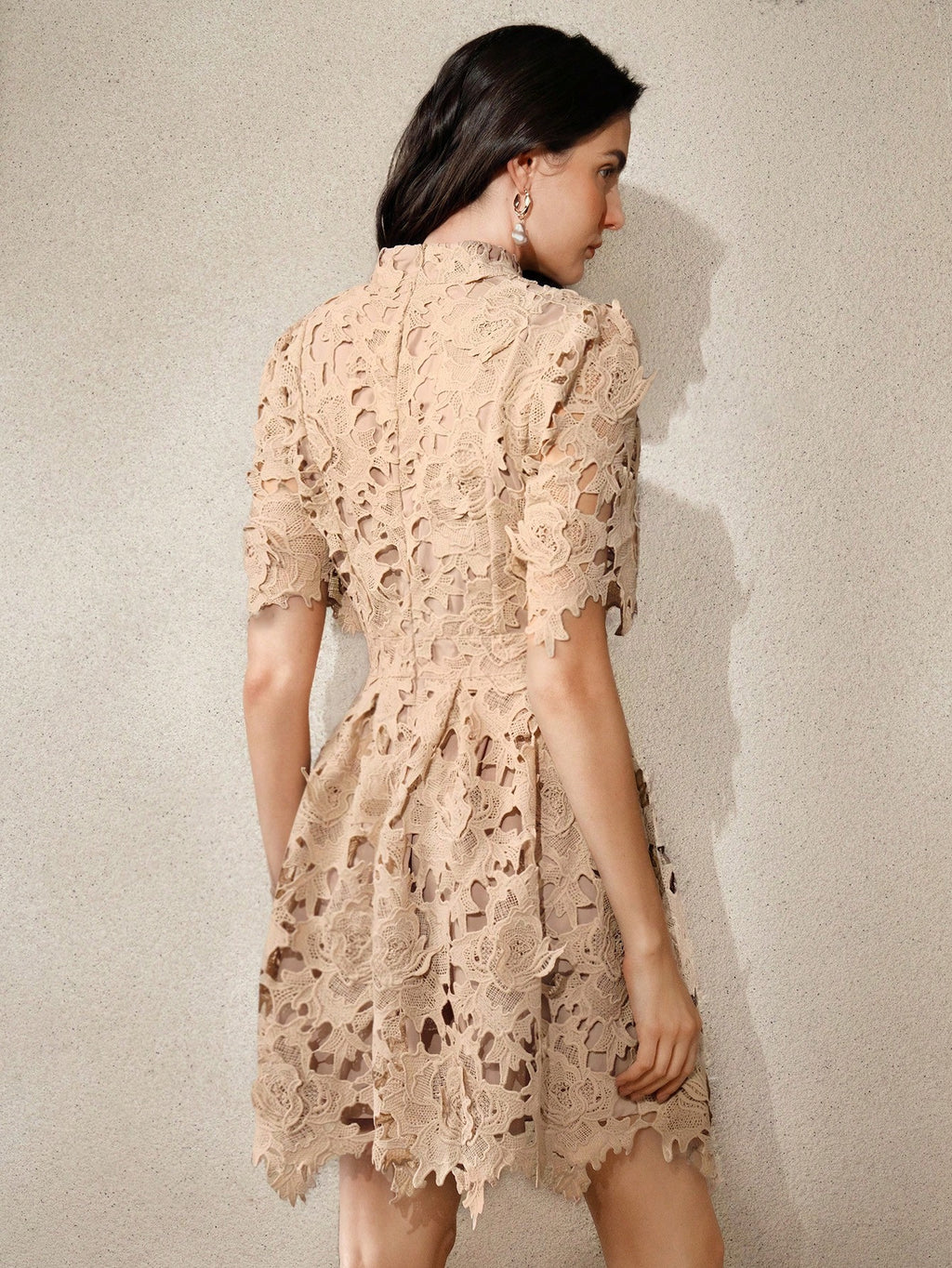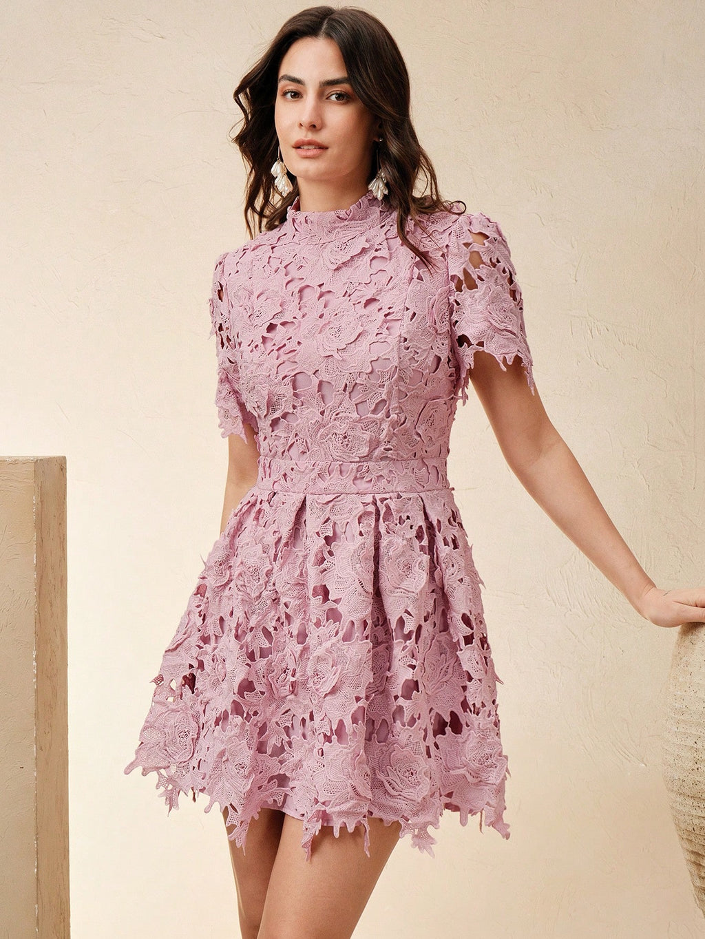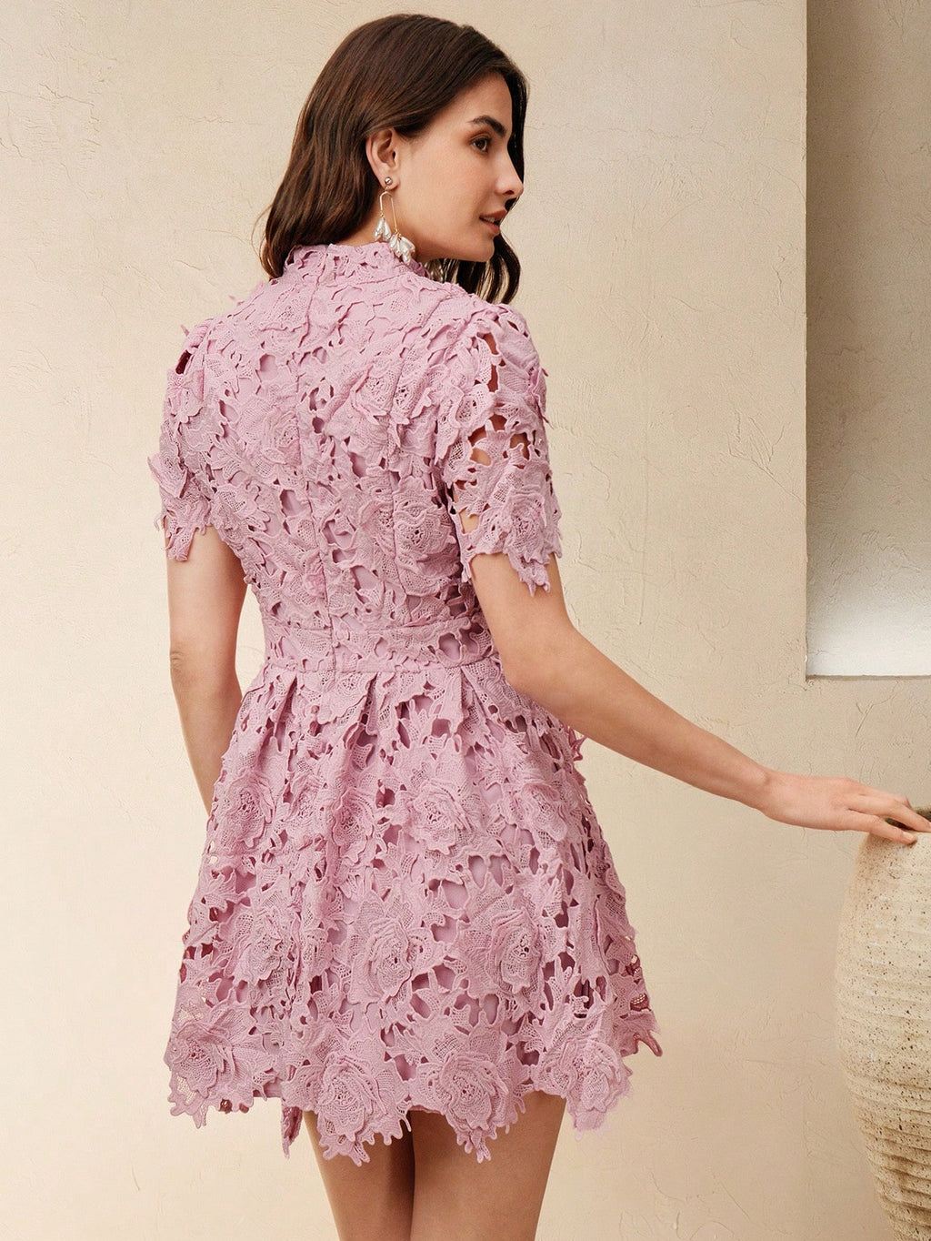 MIU Women 3D Flowers Collar Short Sleeve Waist Cinched Elegant Dress, Spring/Summer