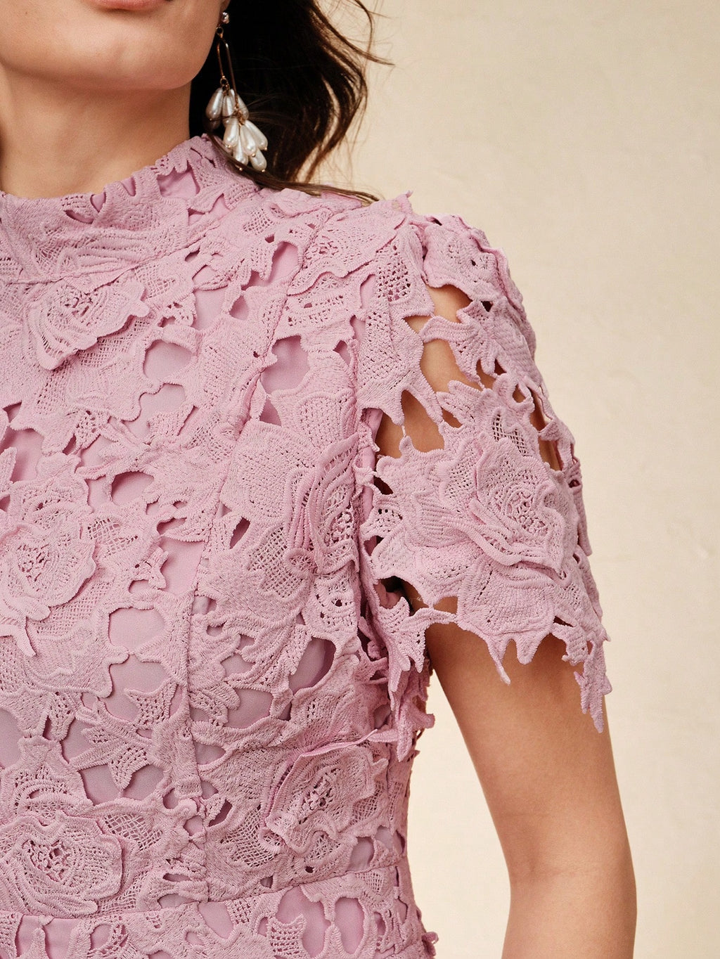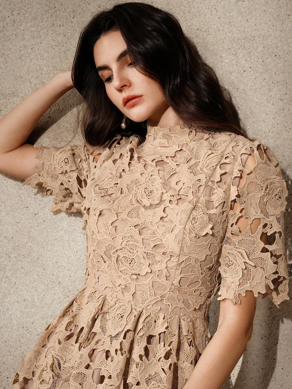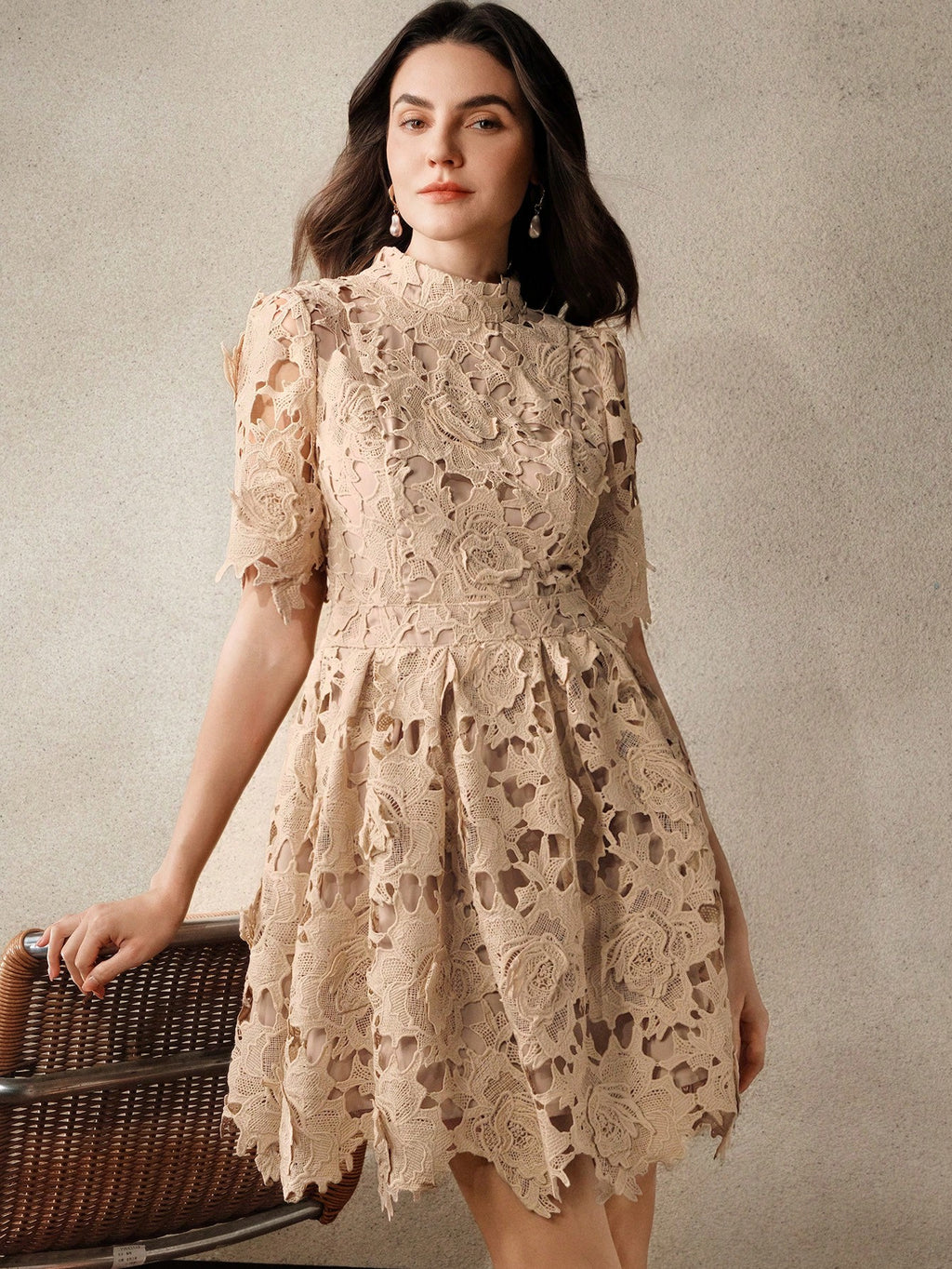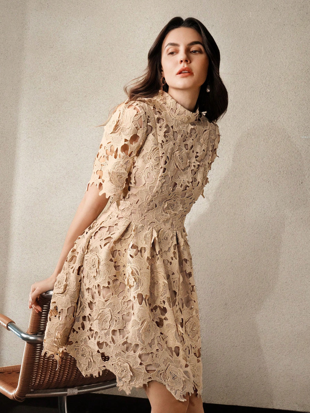 MIU Women 3D Flowers Collar Short Sleeve Waist Cinched Elegant Dress, Spring/Summer