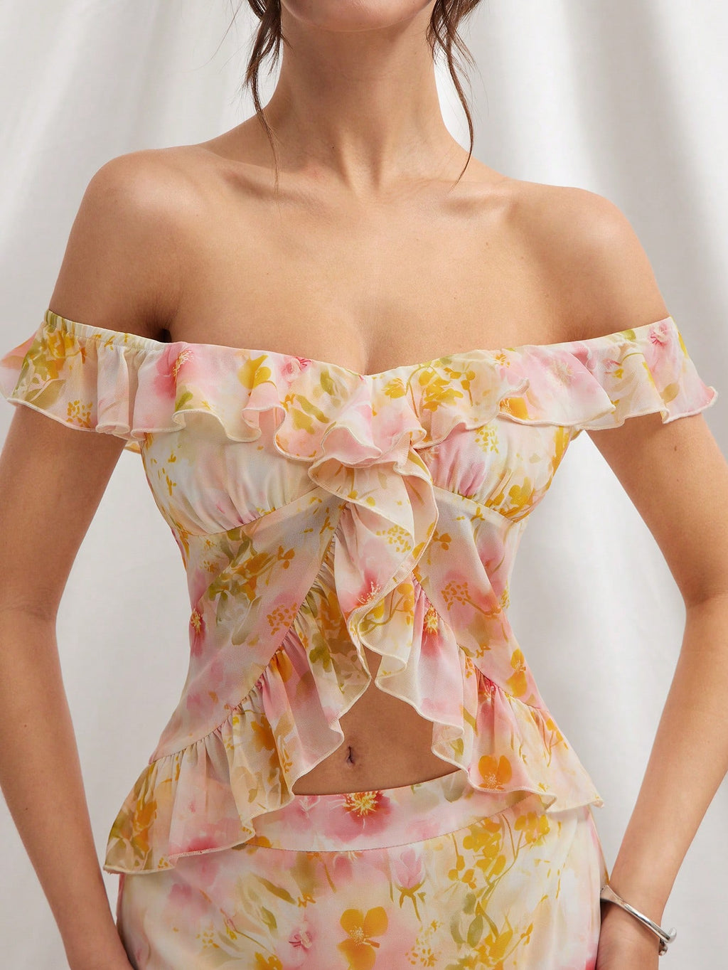 MIU Women Chiffon Floral Printed Off Should Ruffle Top Wedding Elegant Summer