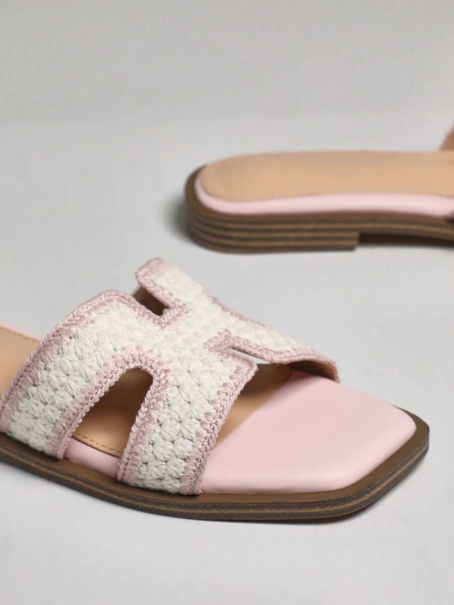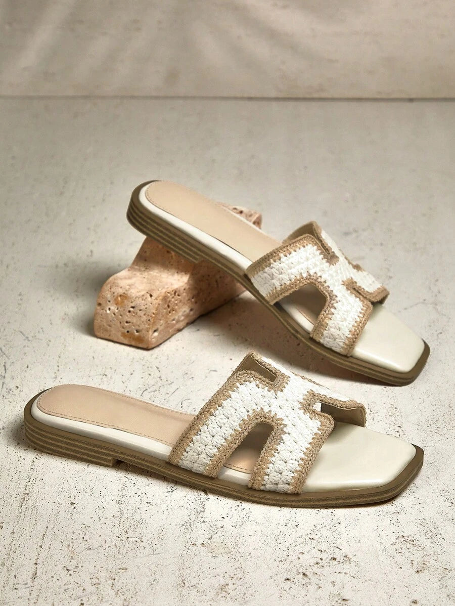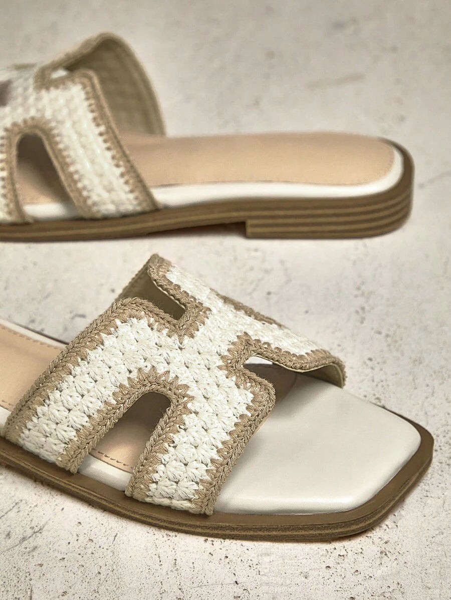 MIU Women Crochet-Trimmed H-Strap Cutouts Beige Taupe Flat Slides– Slip-On Boho Beach Sandals|Pillow Midsole