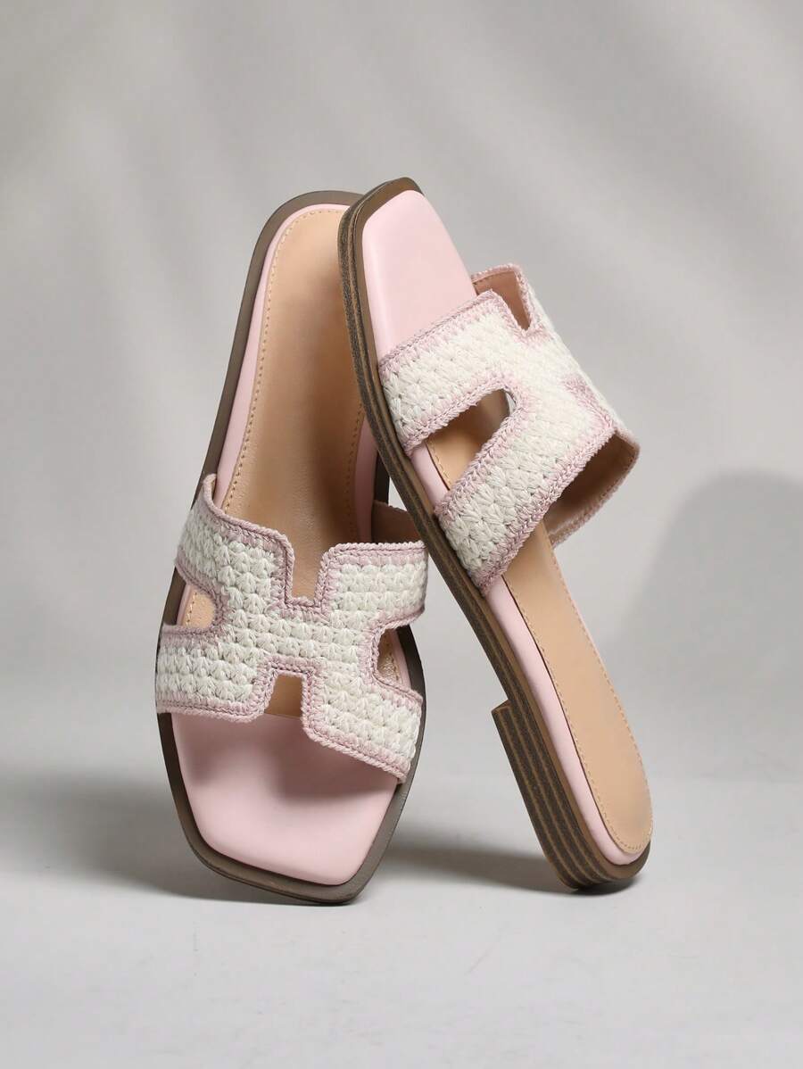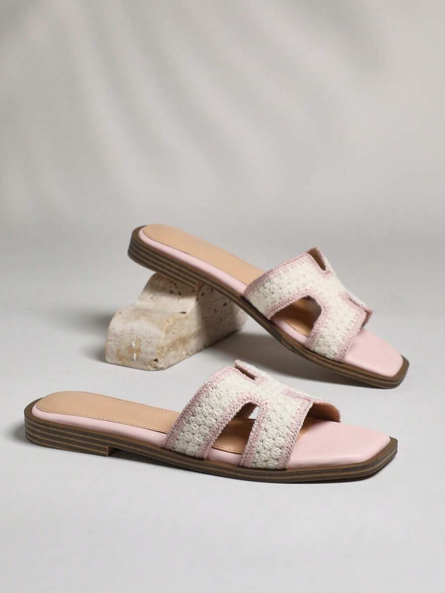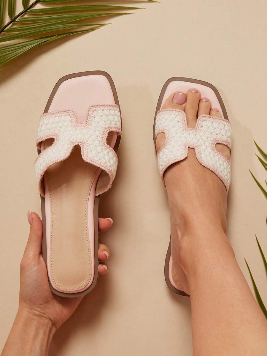 MIU Women Crochet-Trimmed H-Strap Cutouts Beige Taupe Flat Slides– Slip-On Boho Beach Sandals|Pillow Midsole