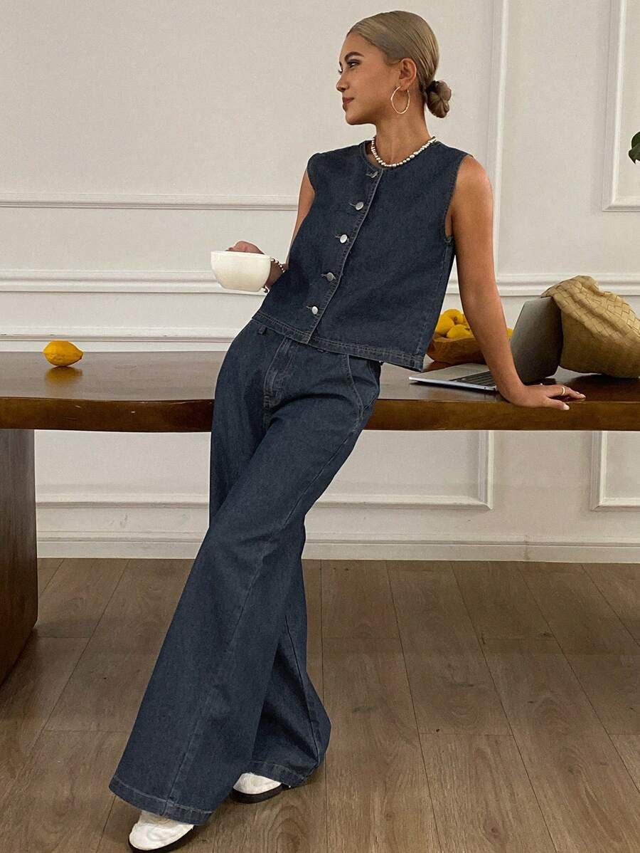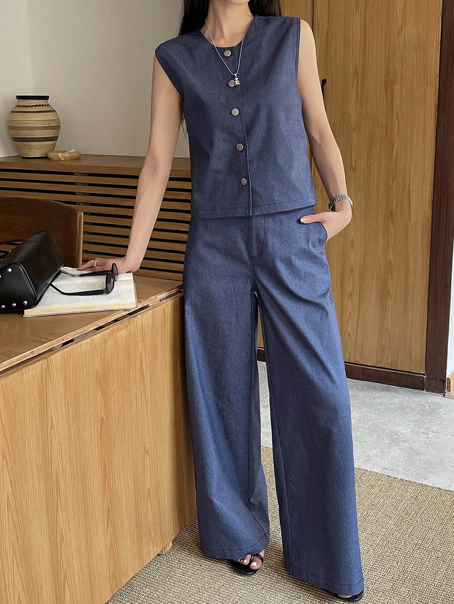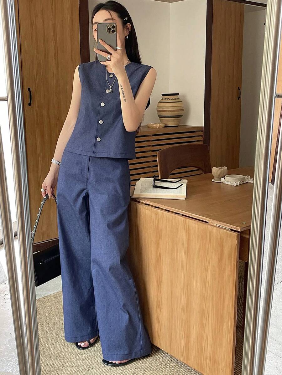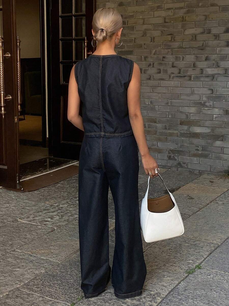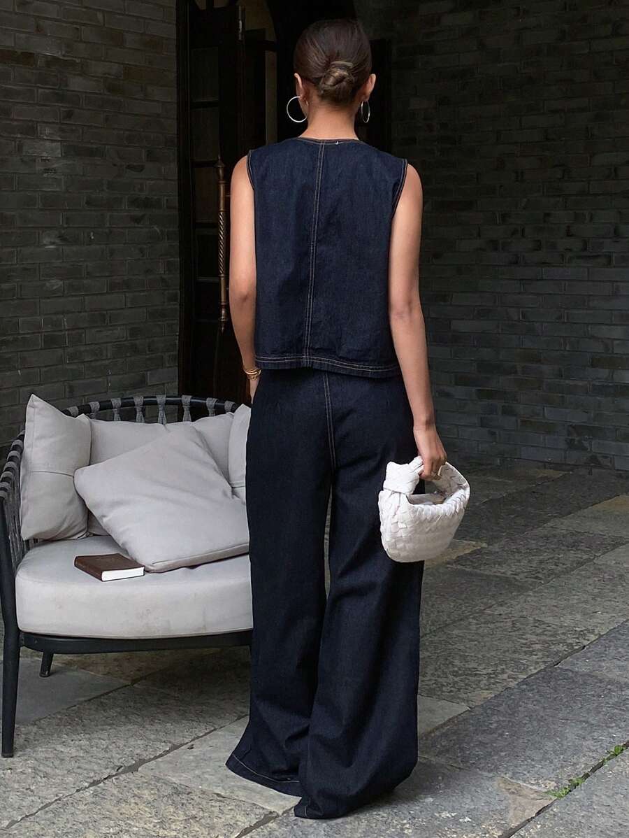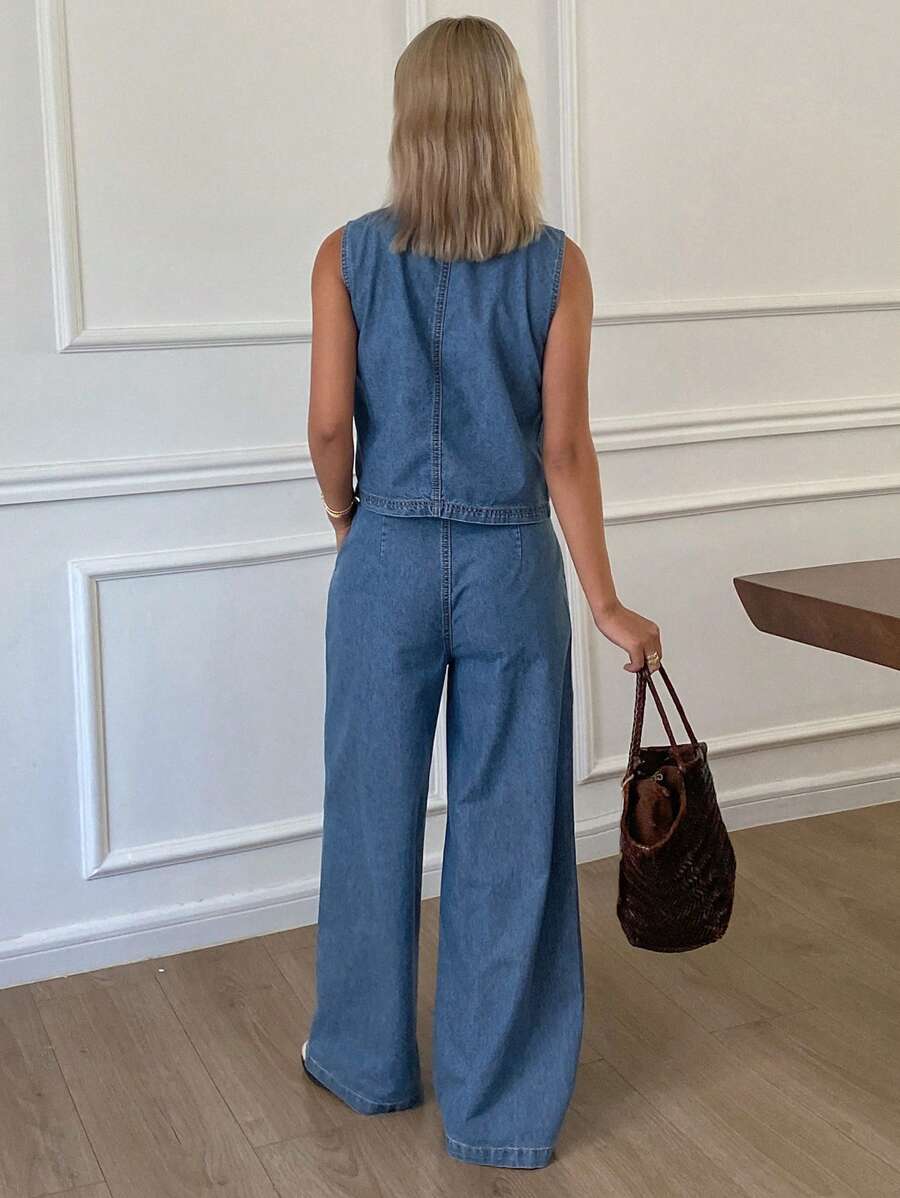 MIU Women Denim Vest And Pocket Decorated Wide Leg Denim Pants Set