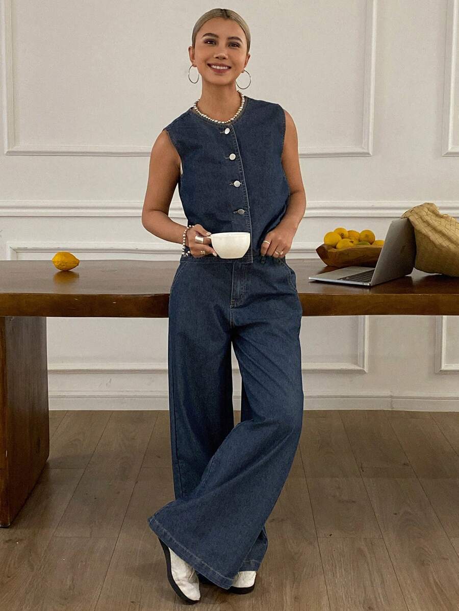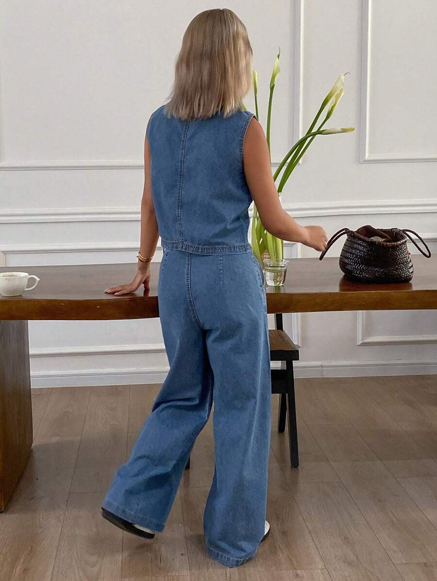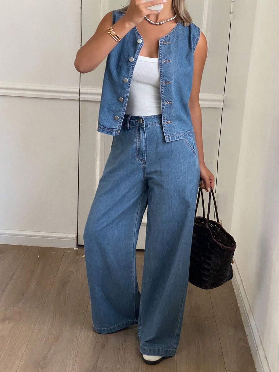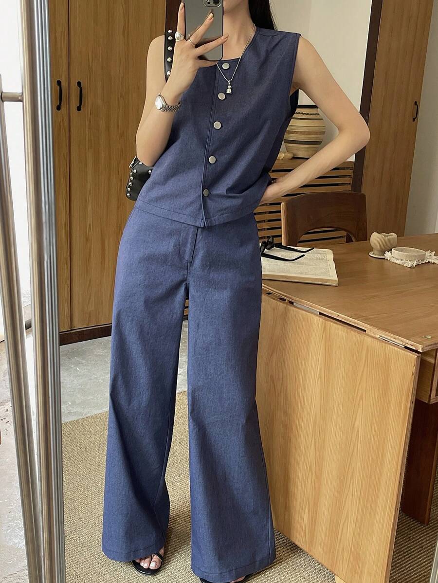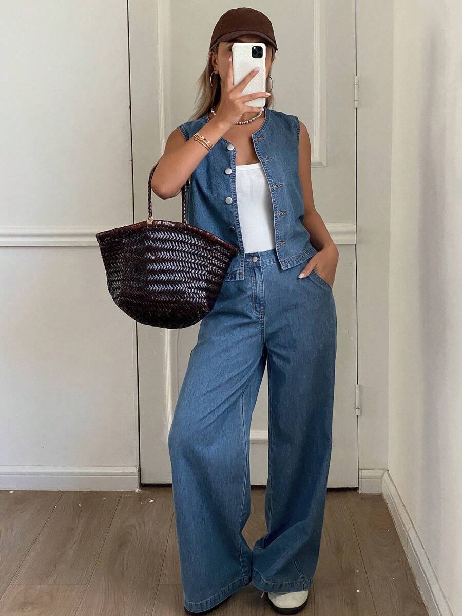 MIU Women Denim Vest And Pocket Decorated Wide Leg Denim Pants Set