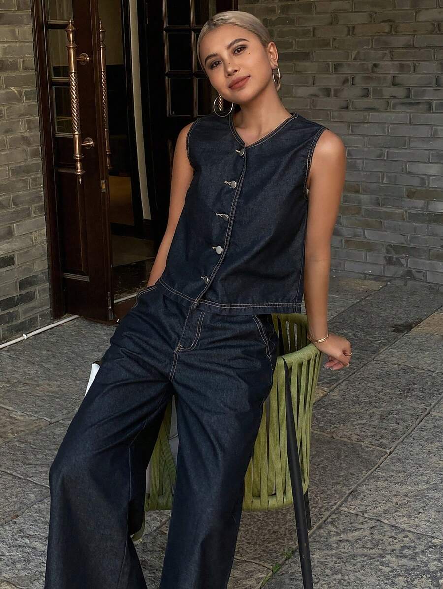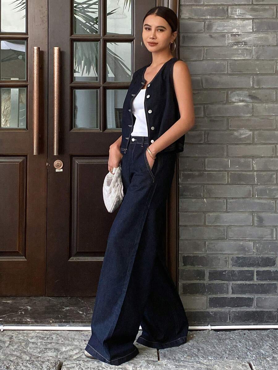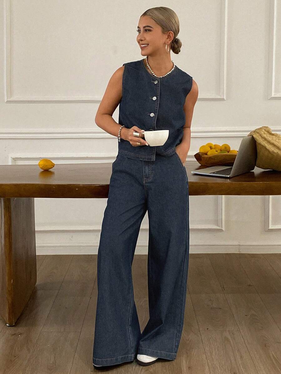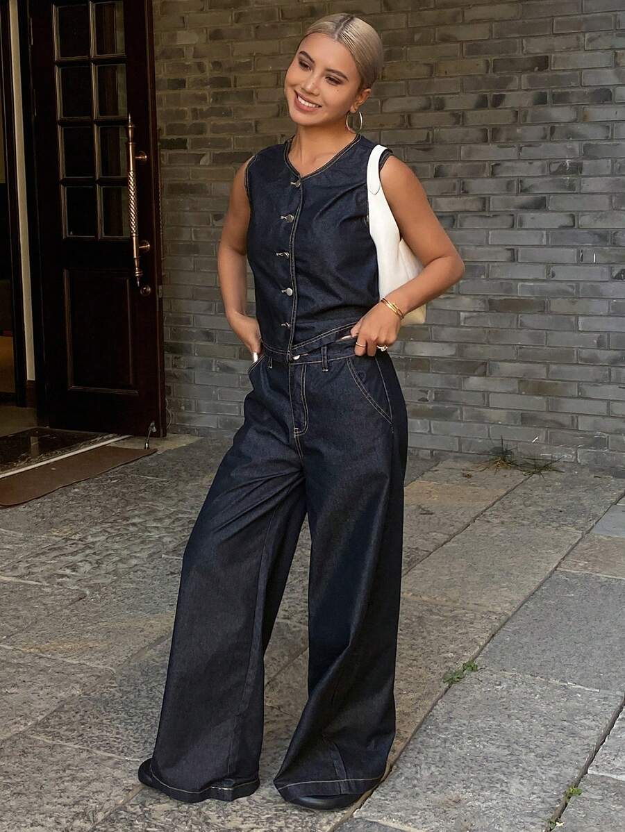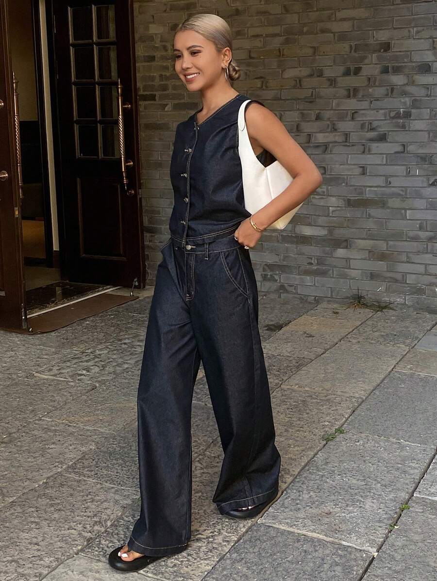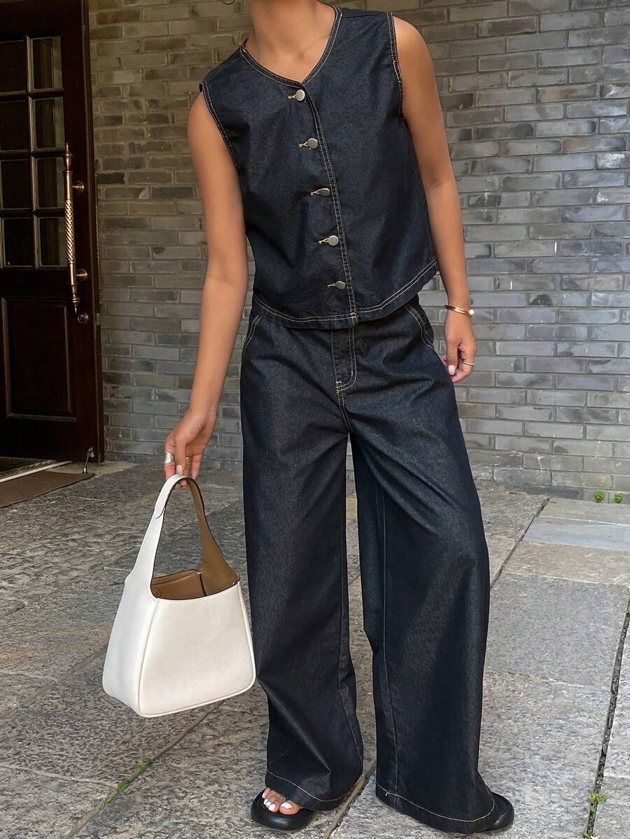 MIU Women Denim Vest And Pocket Decorated Wide Leg Denim Pants Set