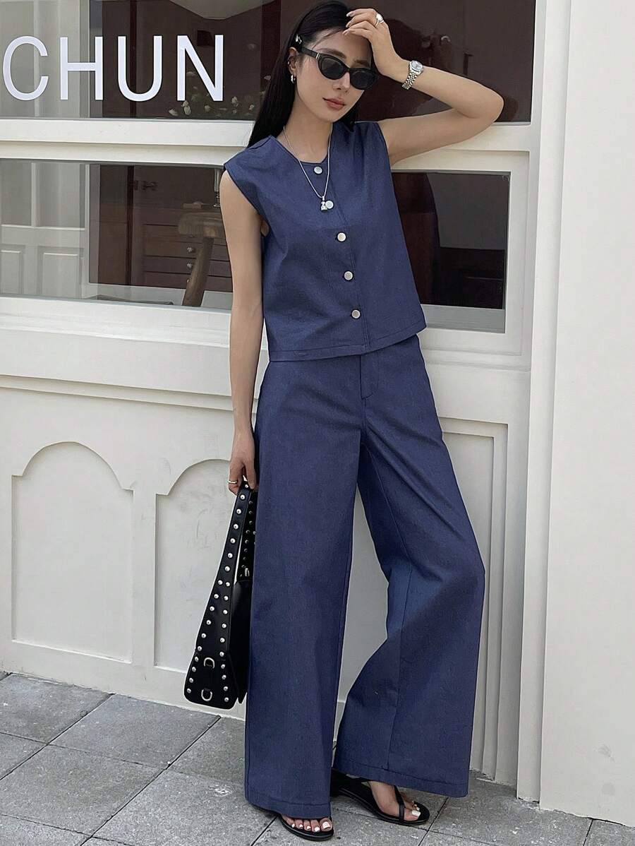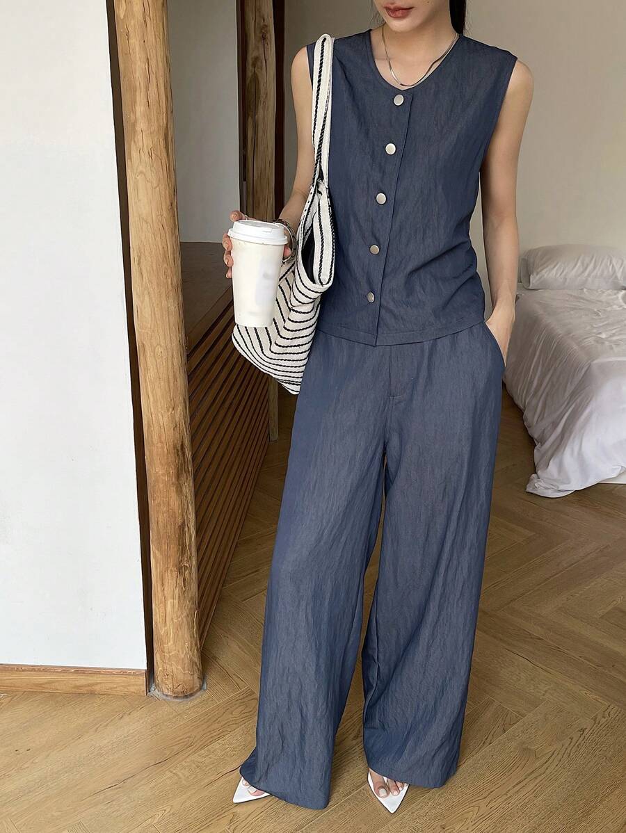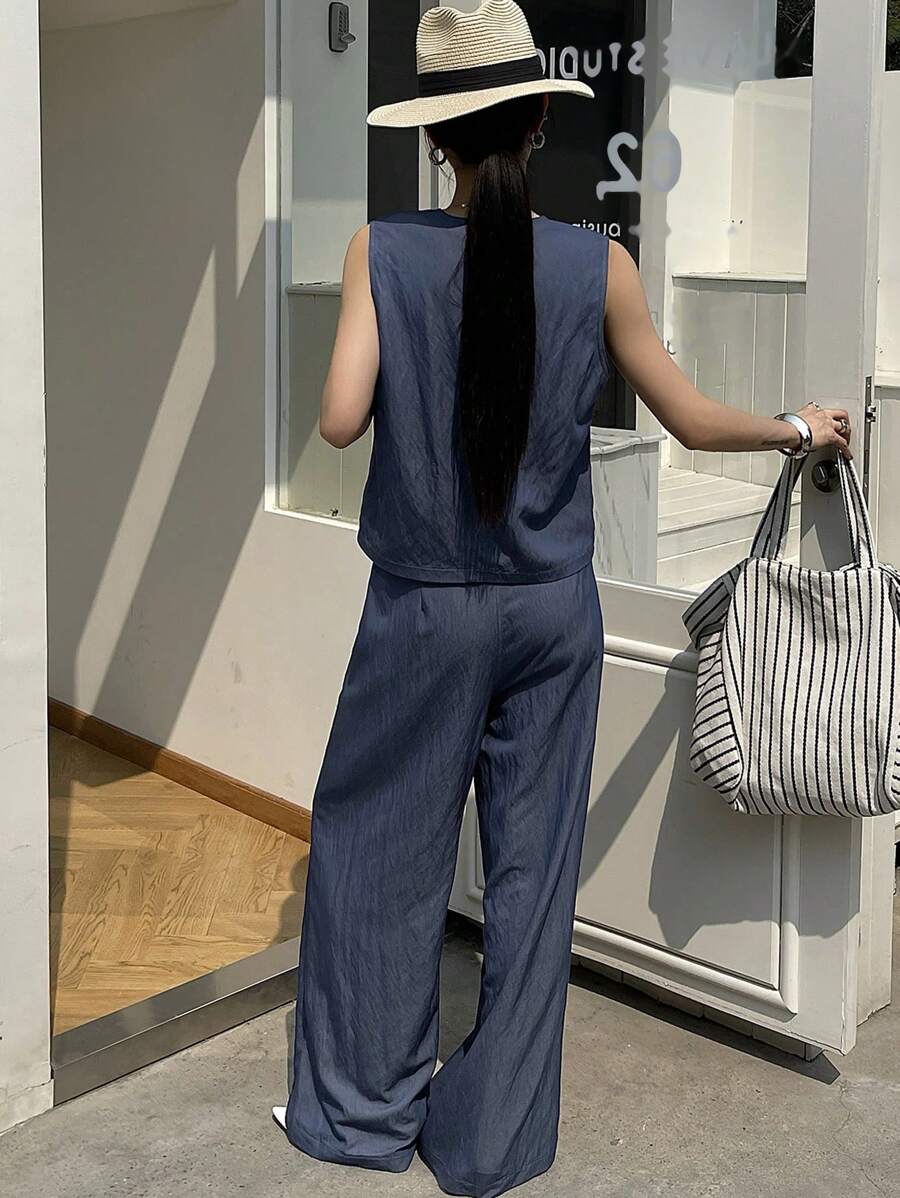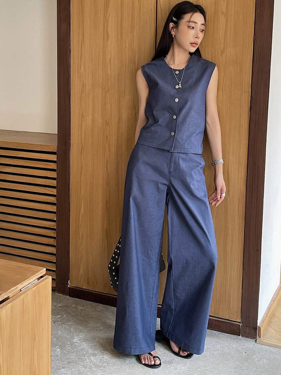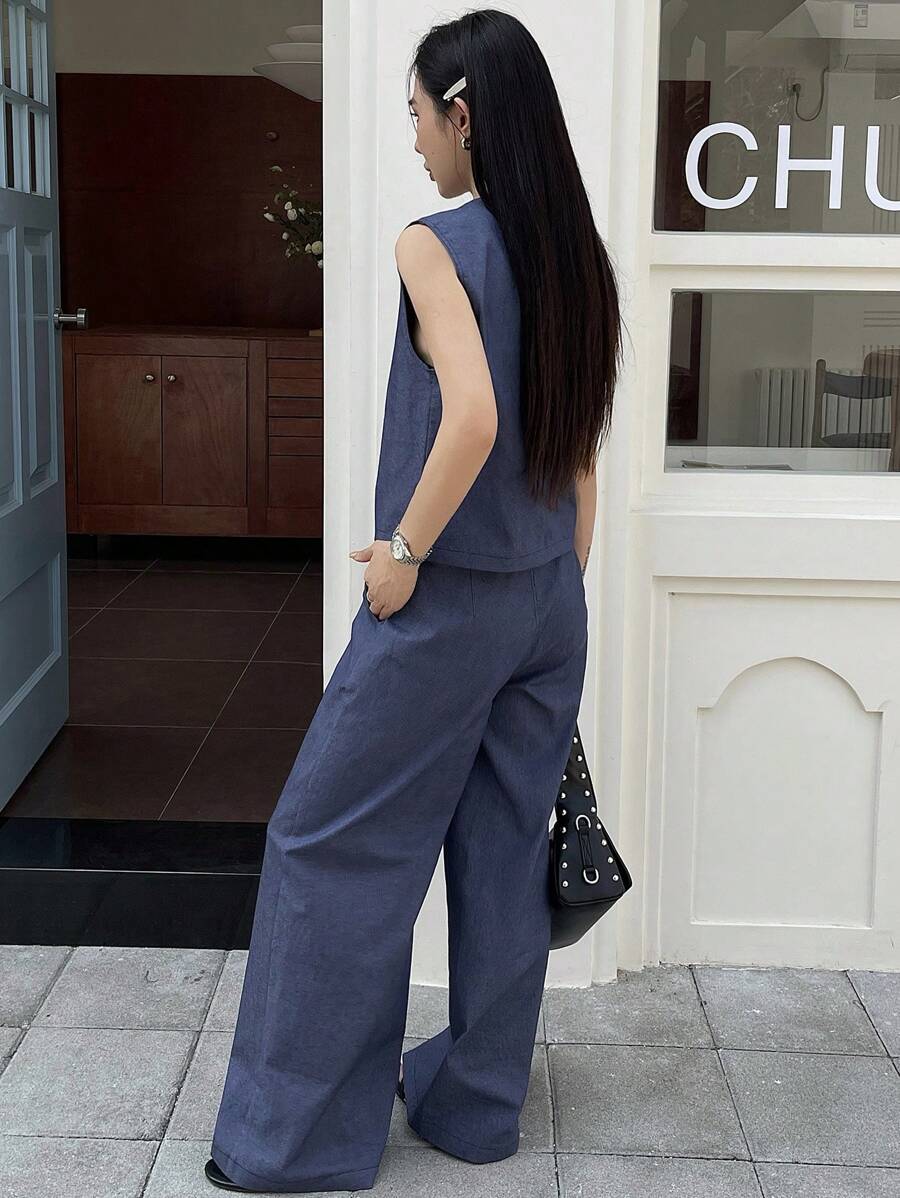 MIU Women Denim Vest And Pocket Decorated Wide Leg Denim Pants Set
