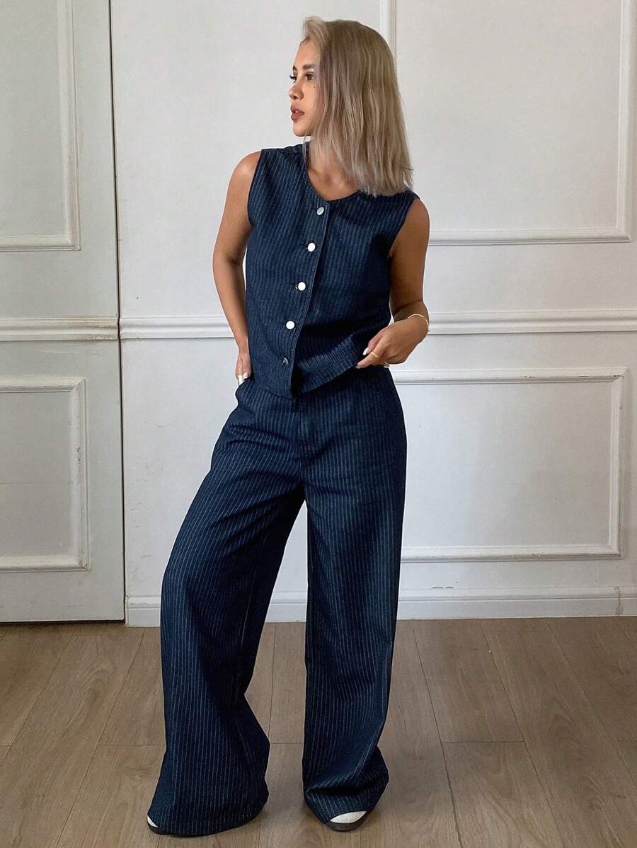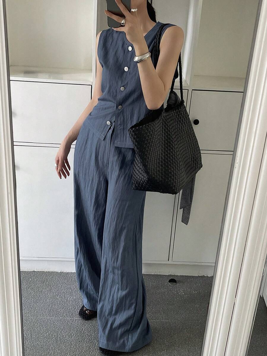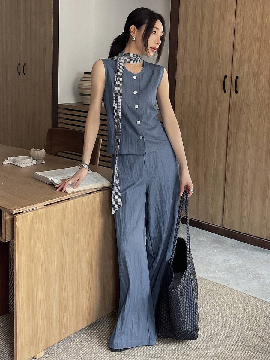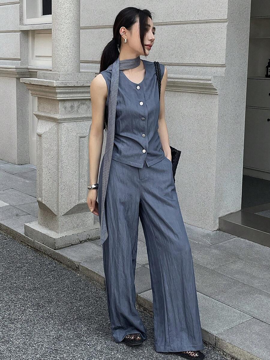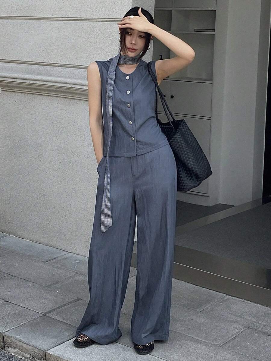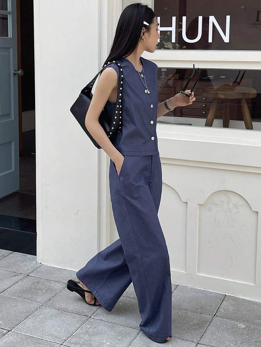 MIU Women Denim Vest And Pocket Decorated Wide Leg Denim Pants Set