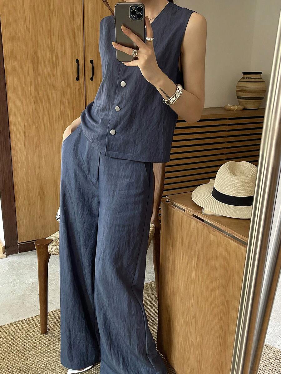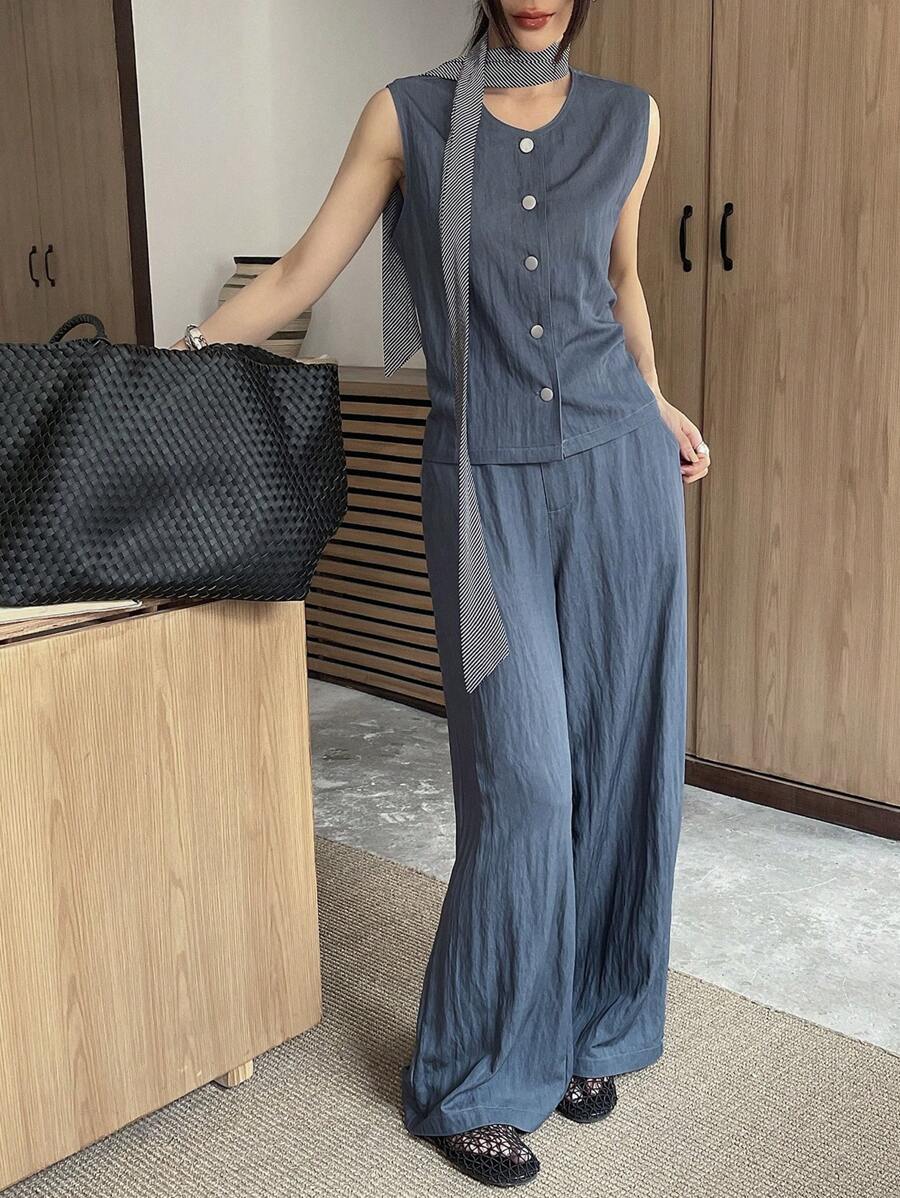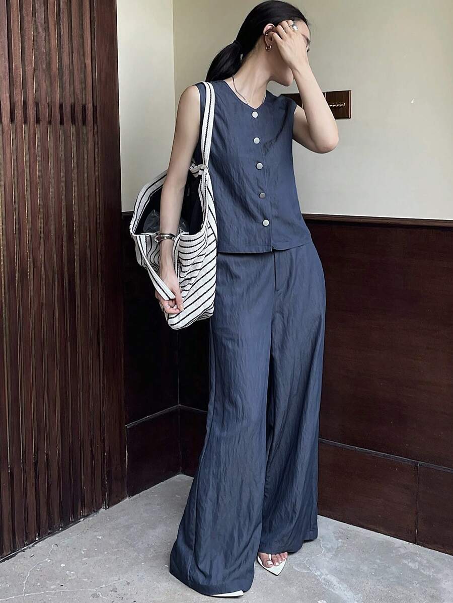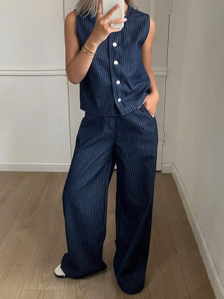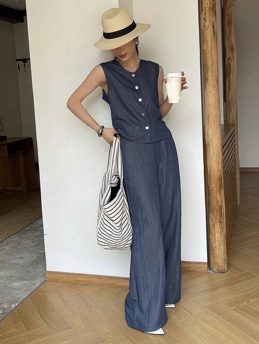 MIU Women Denim Vest And Pocket Decorated Wide Leg Denim Pants Set