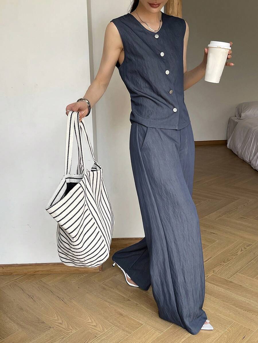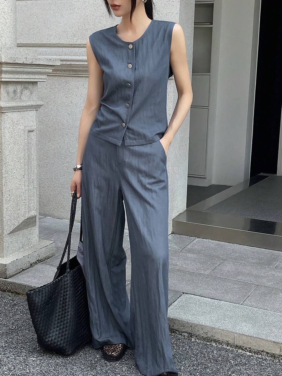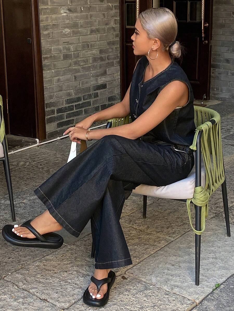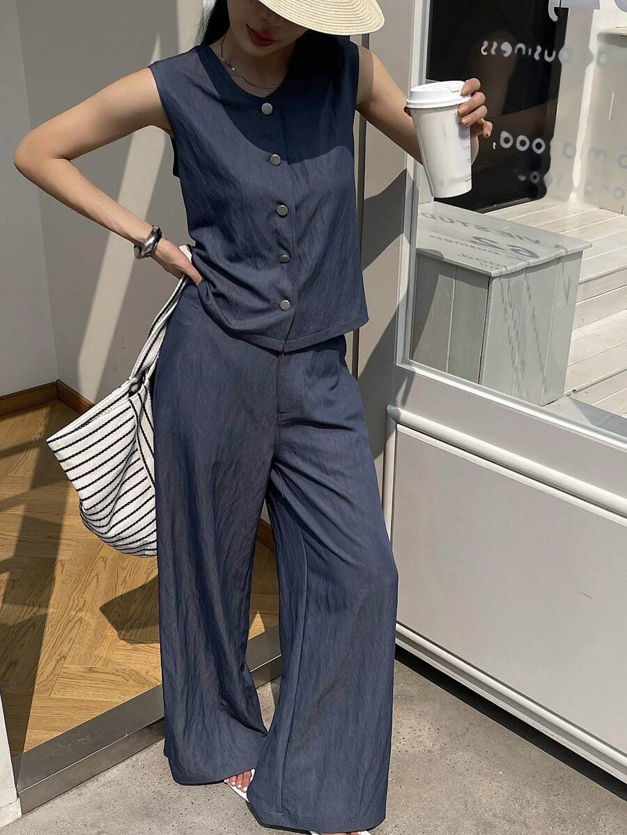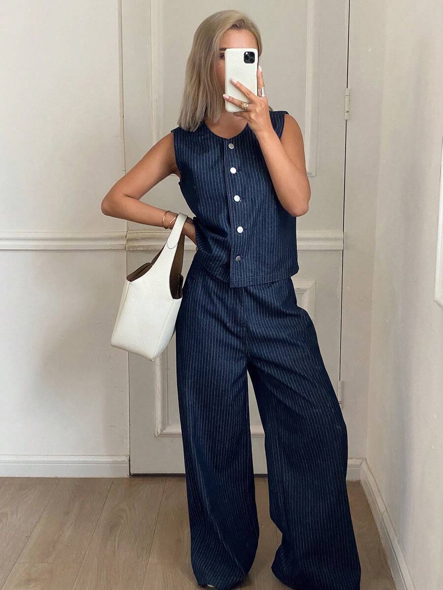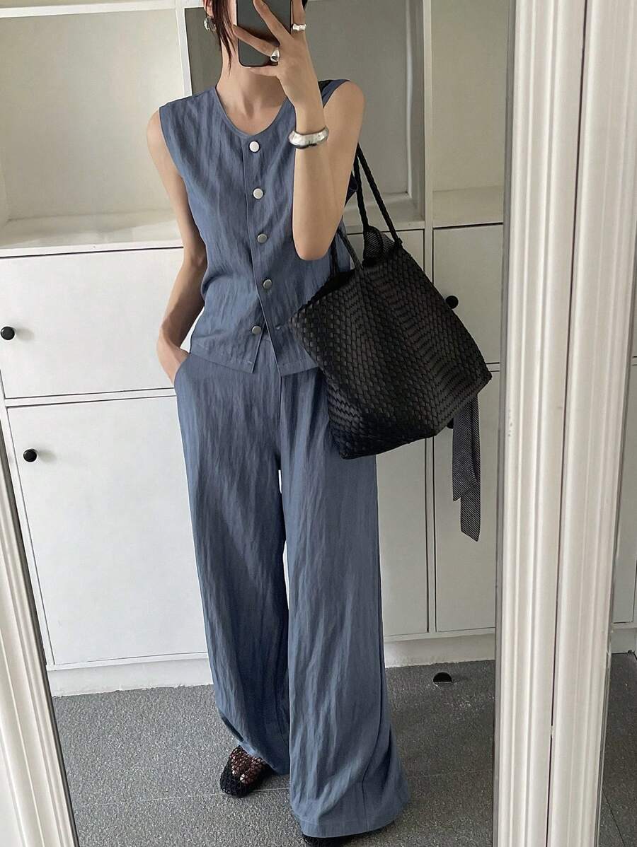 MIU Women Denim Vest And Pocket Decorated Wide Leg Denim Pants Set