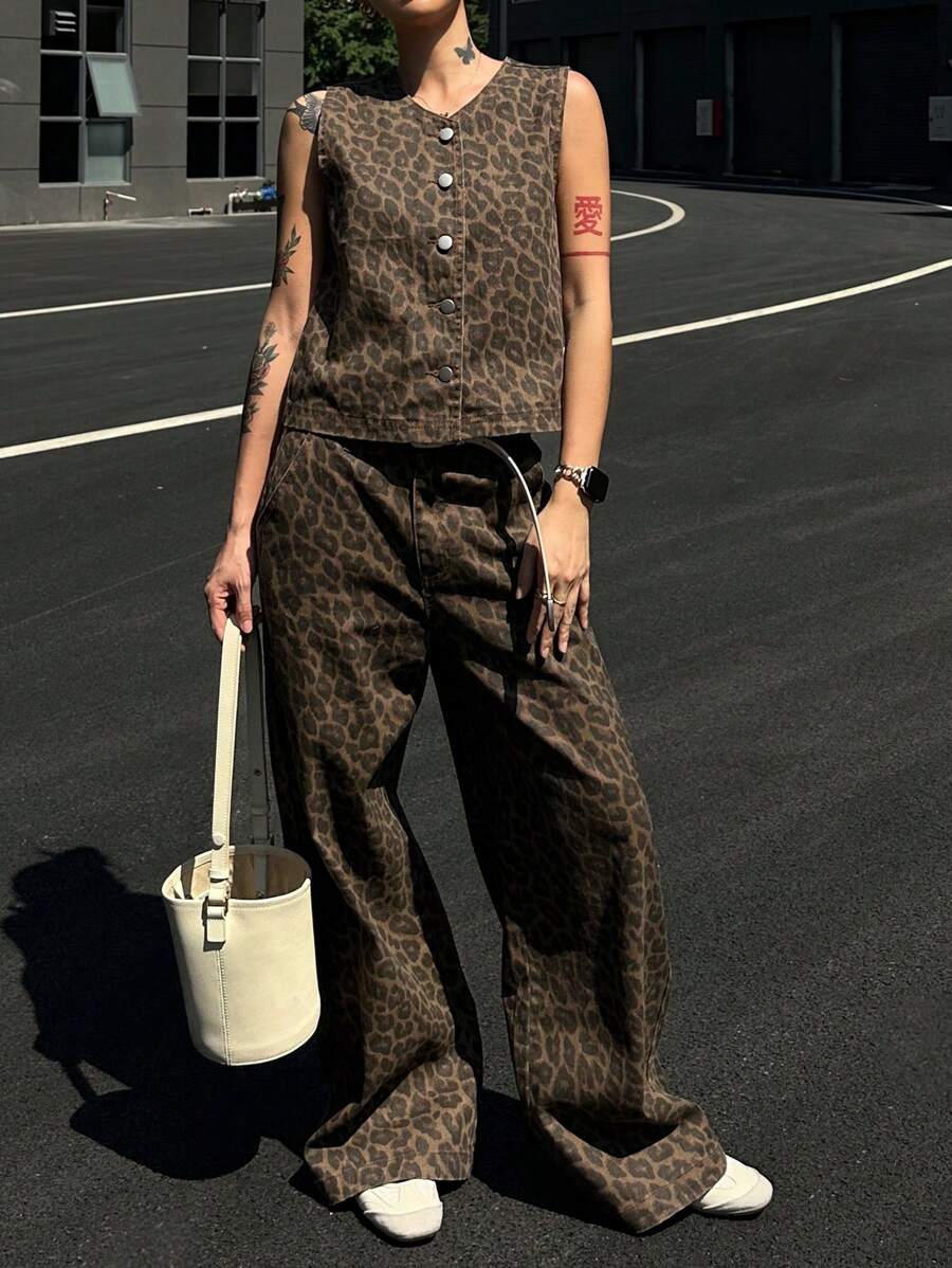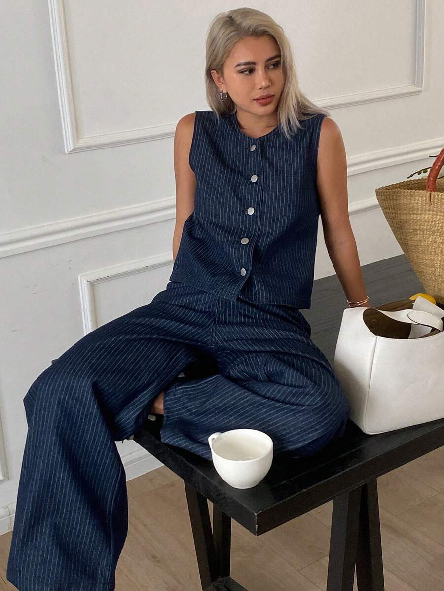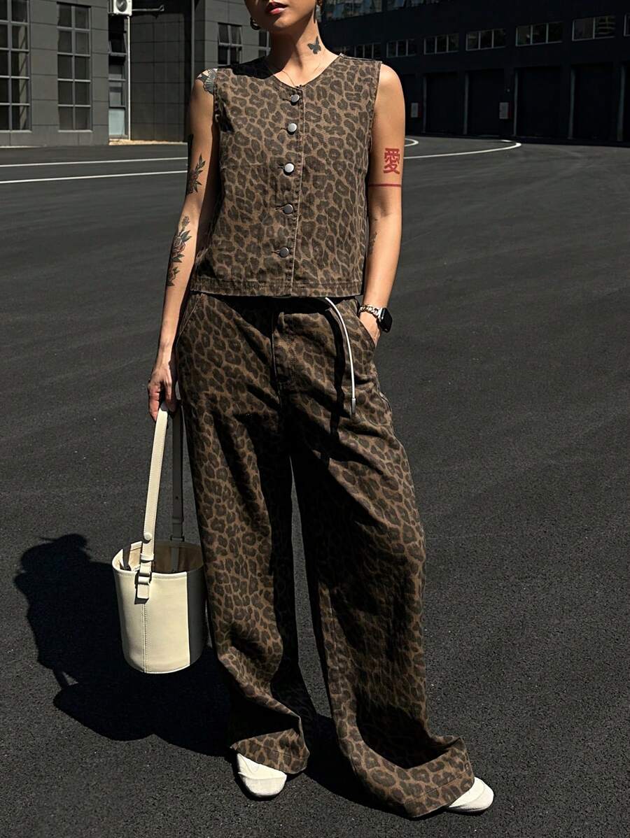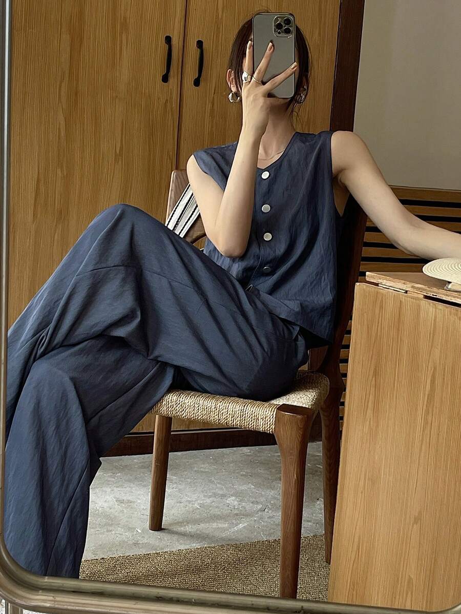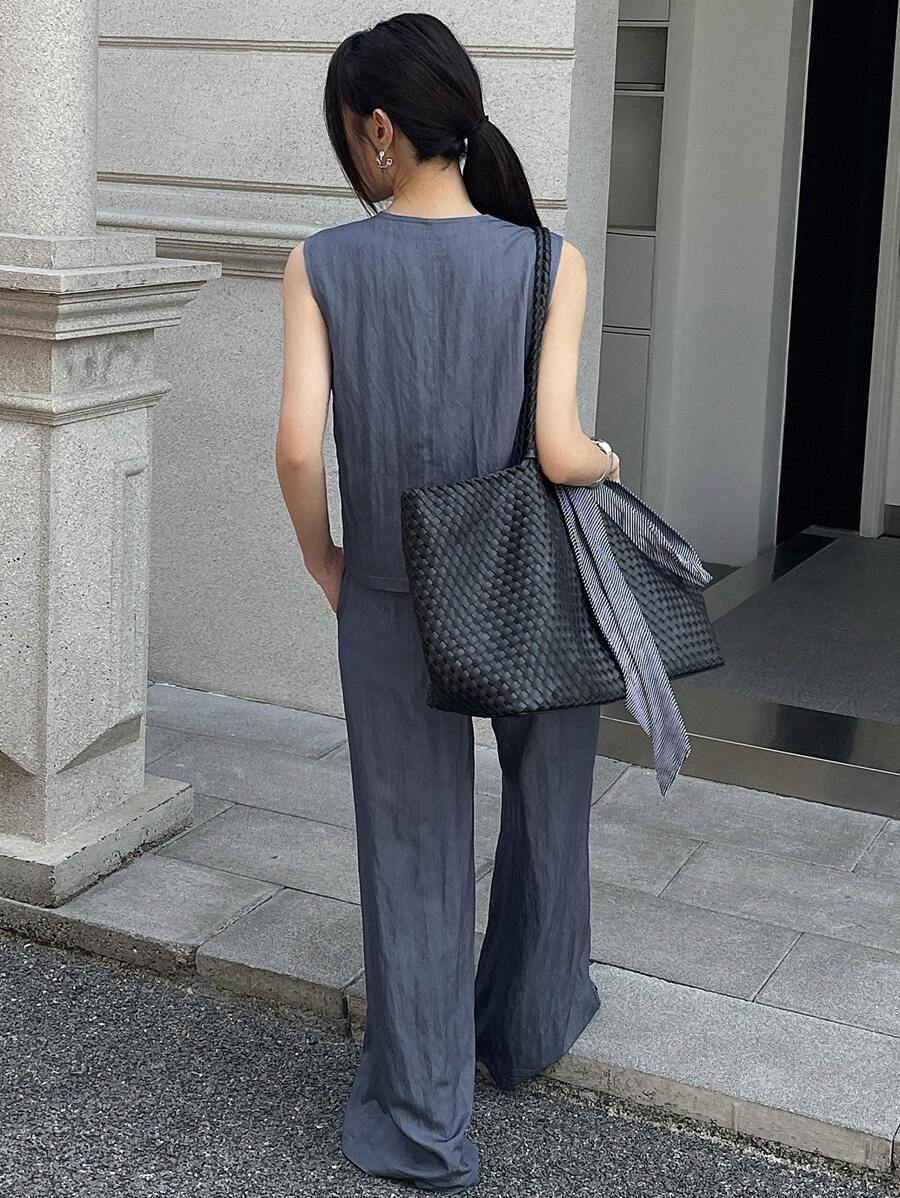 MIU Women Denim Vest And Pocket Decorated Wide Leg Denim Pants Set