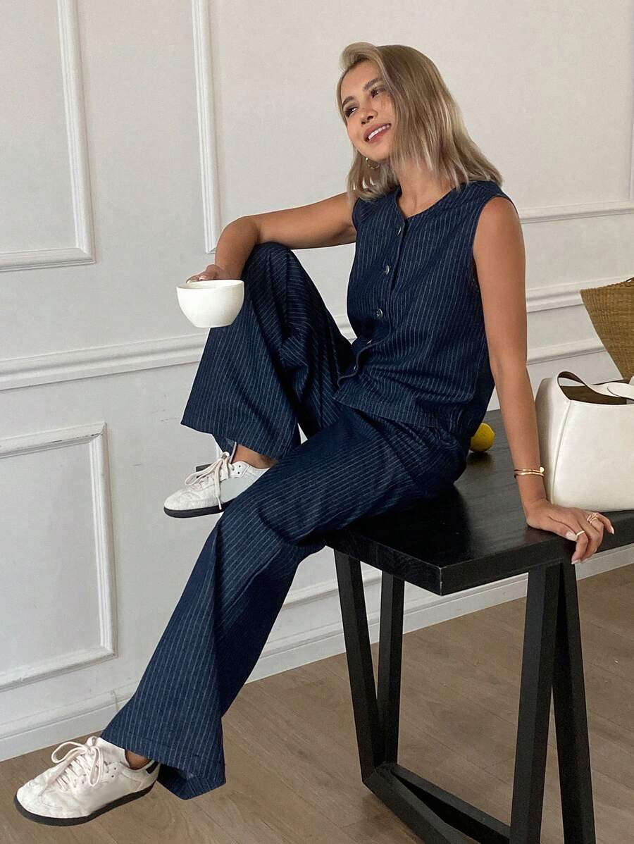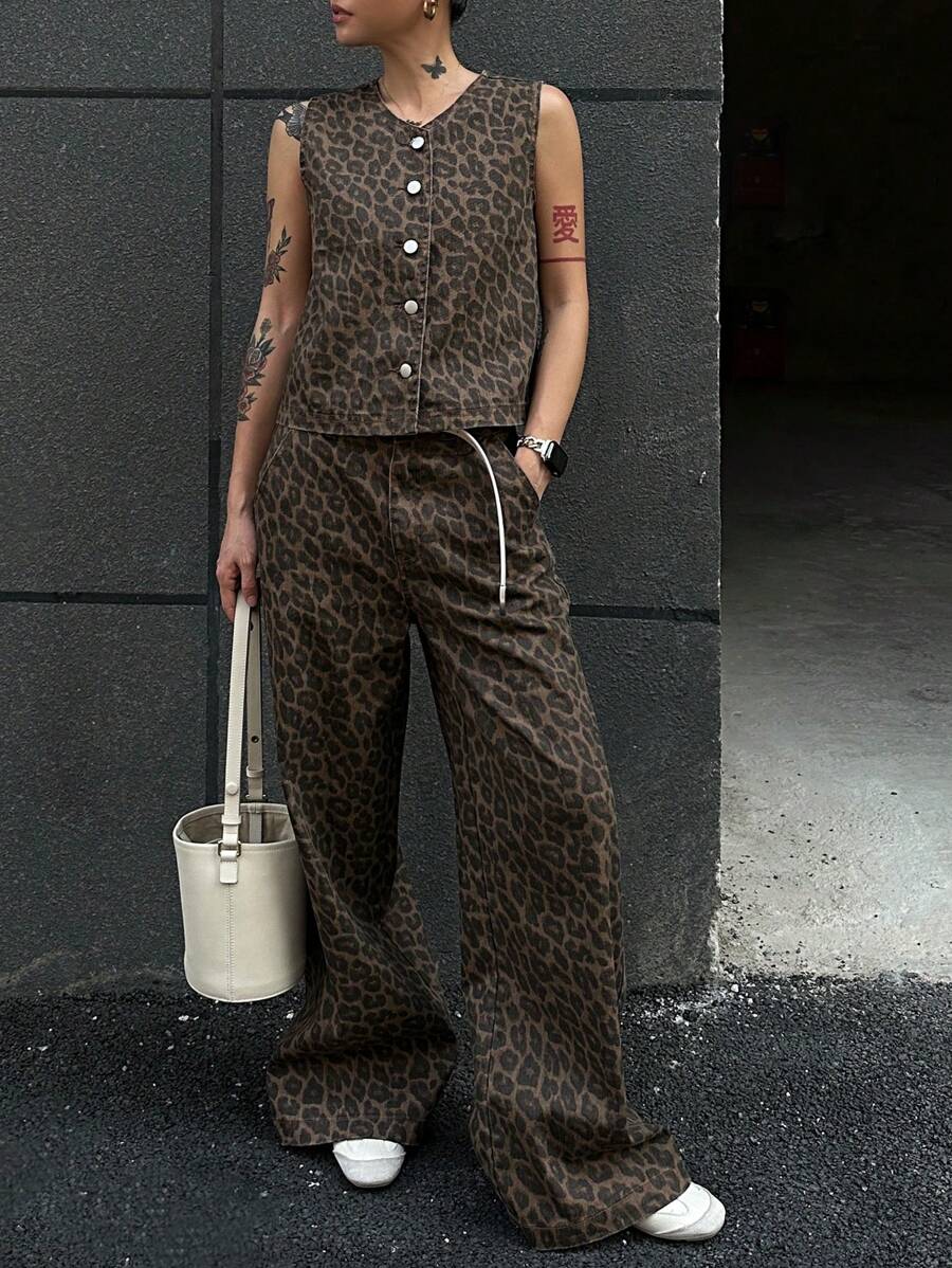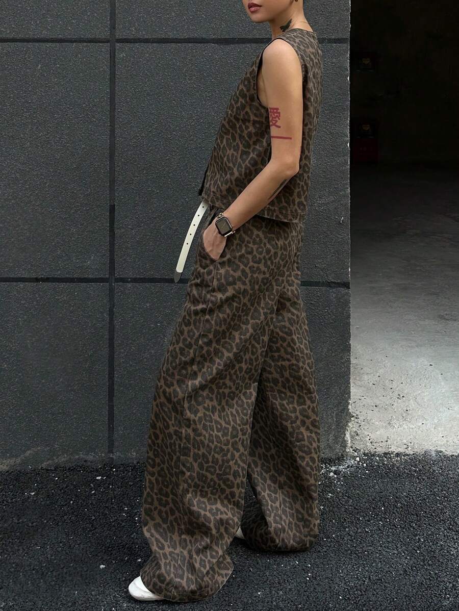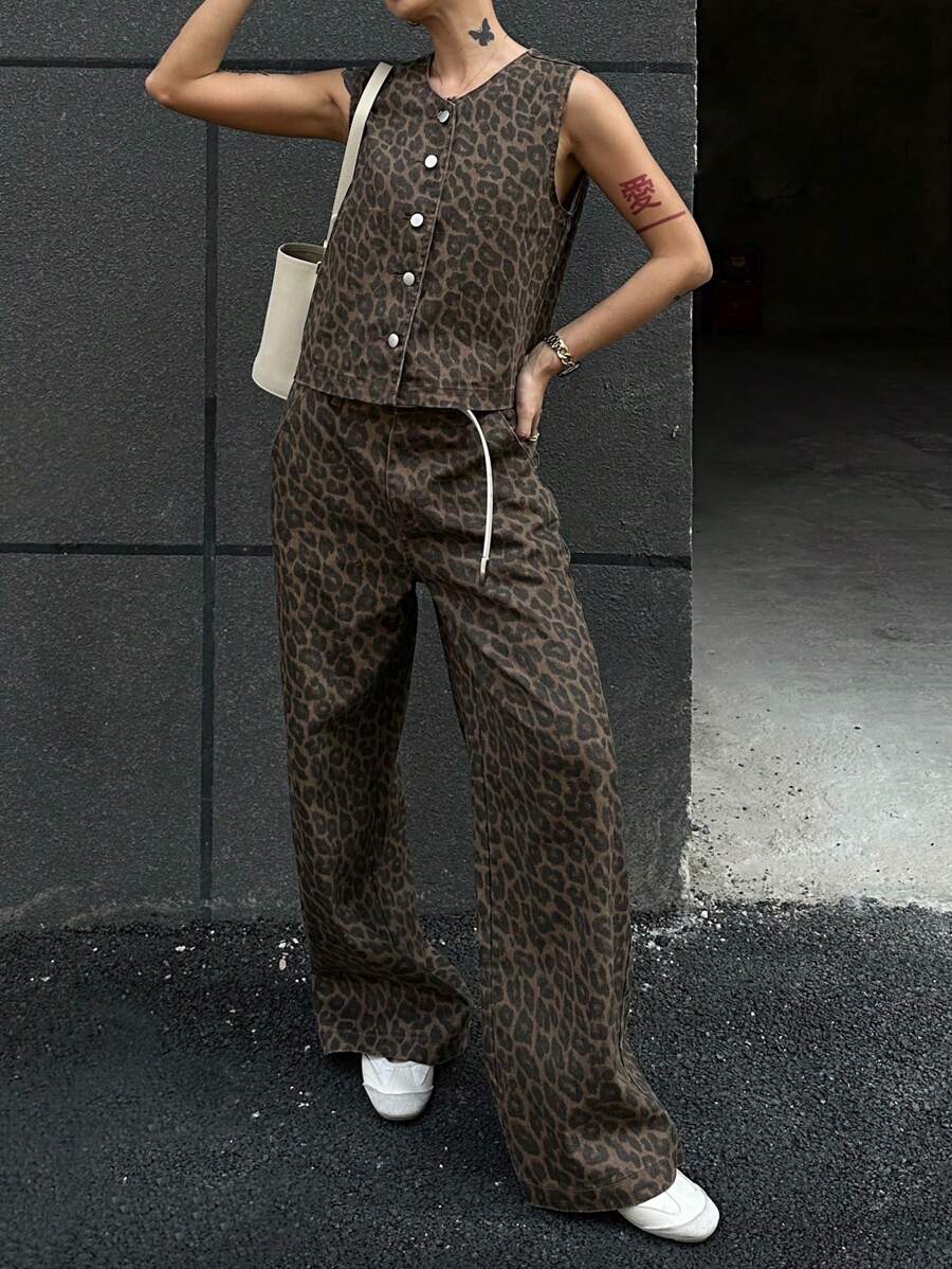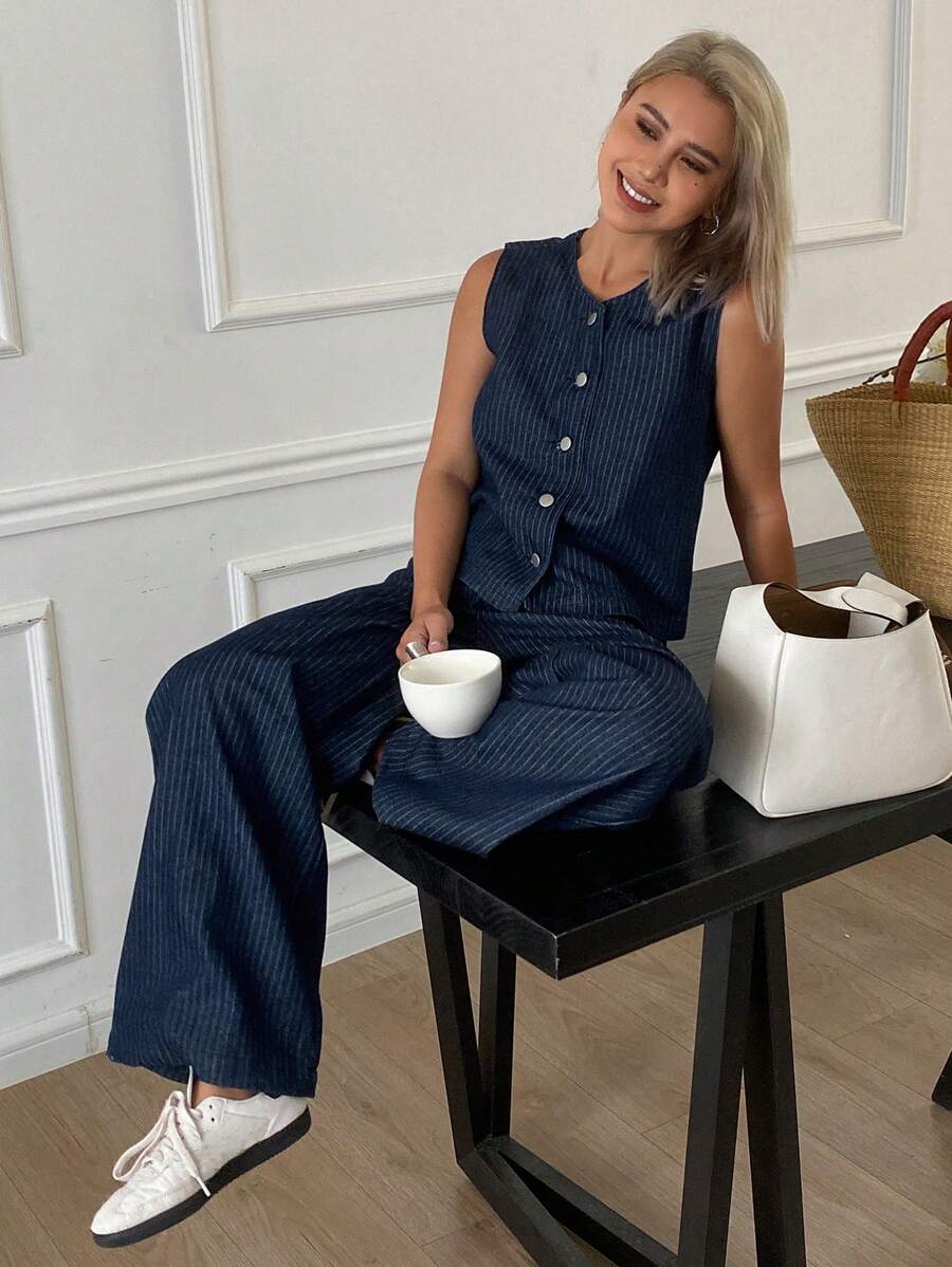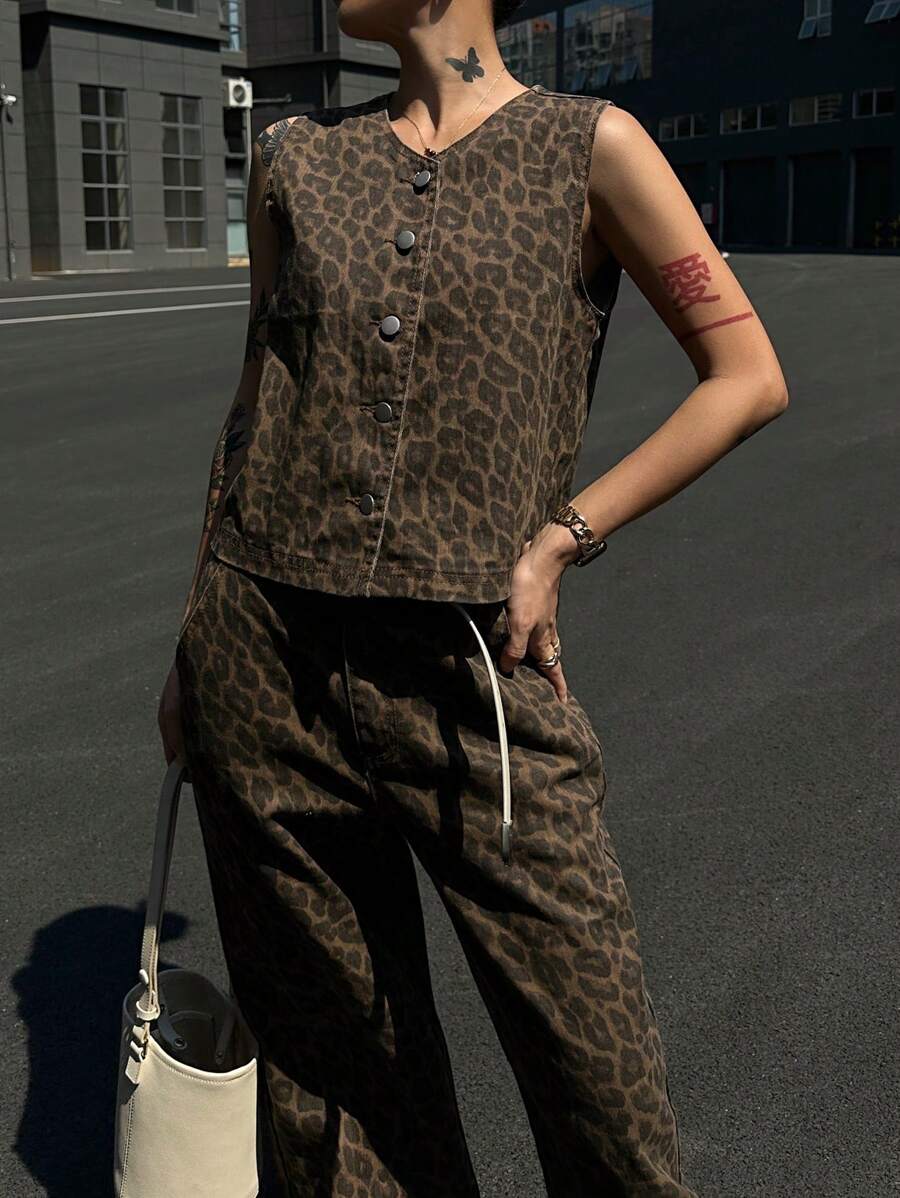 MIU Women Denim Vest And Pocket Decorated Wide Leg Denim Pants Set