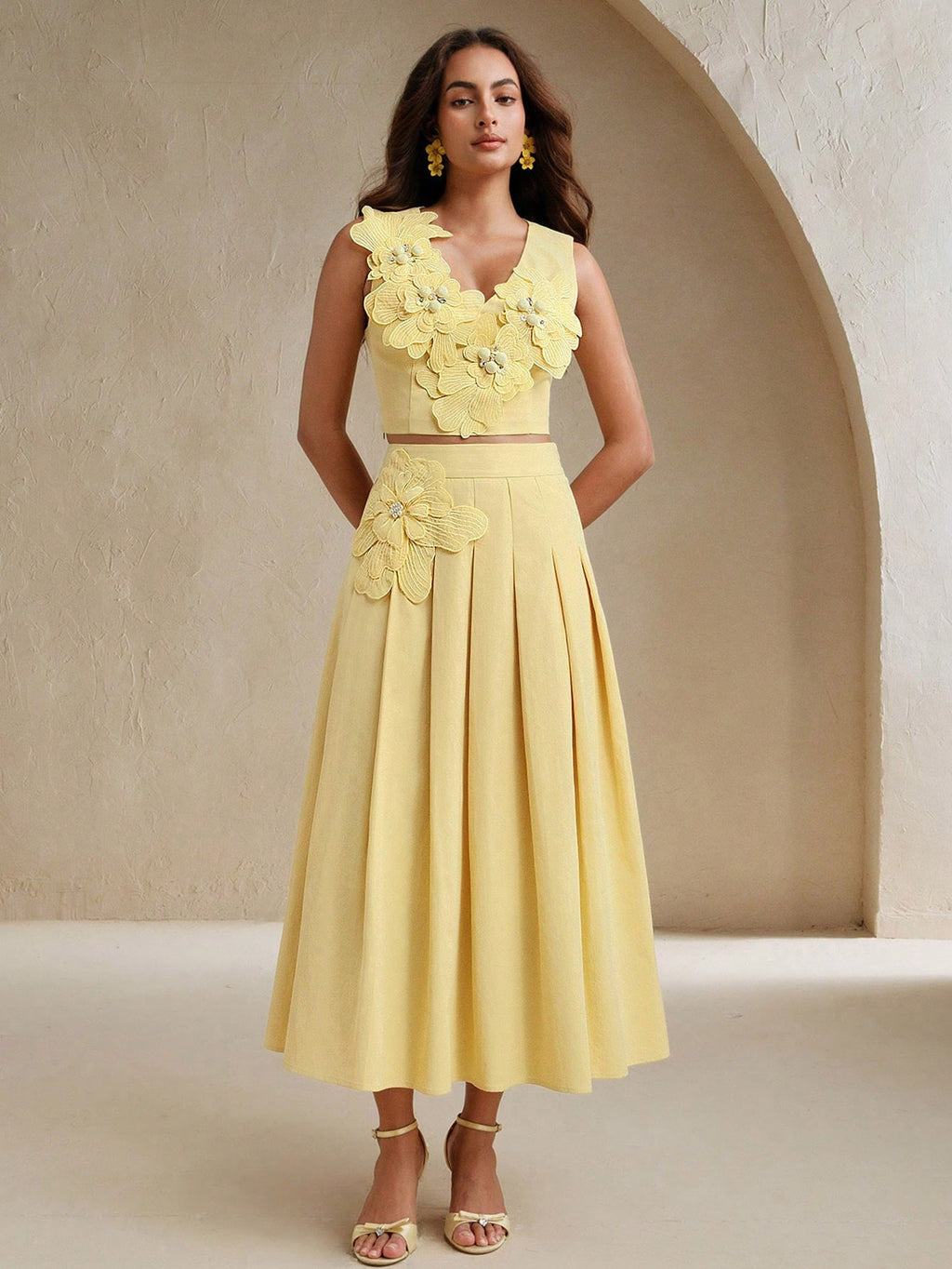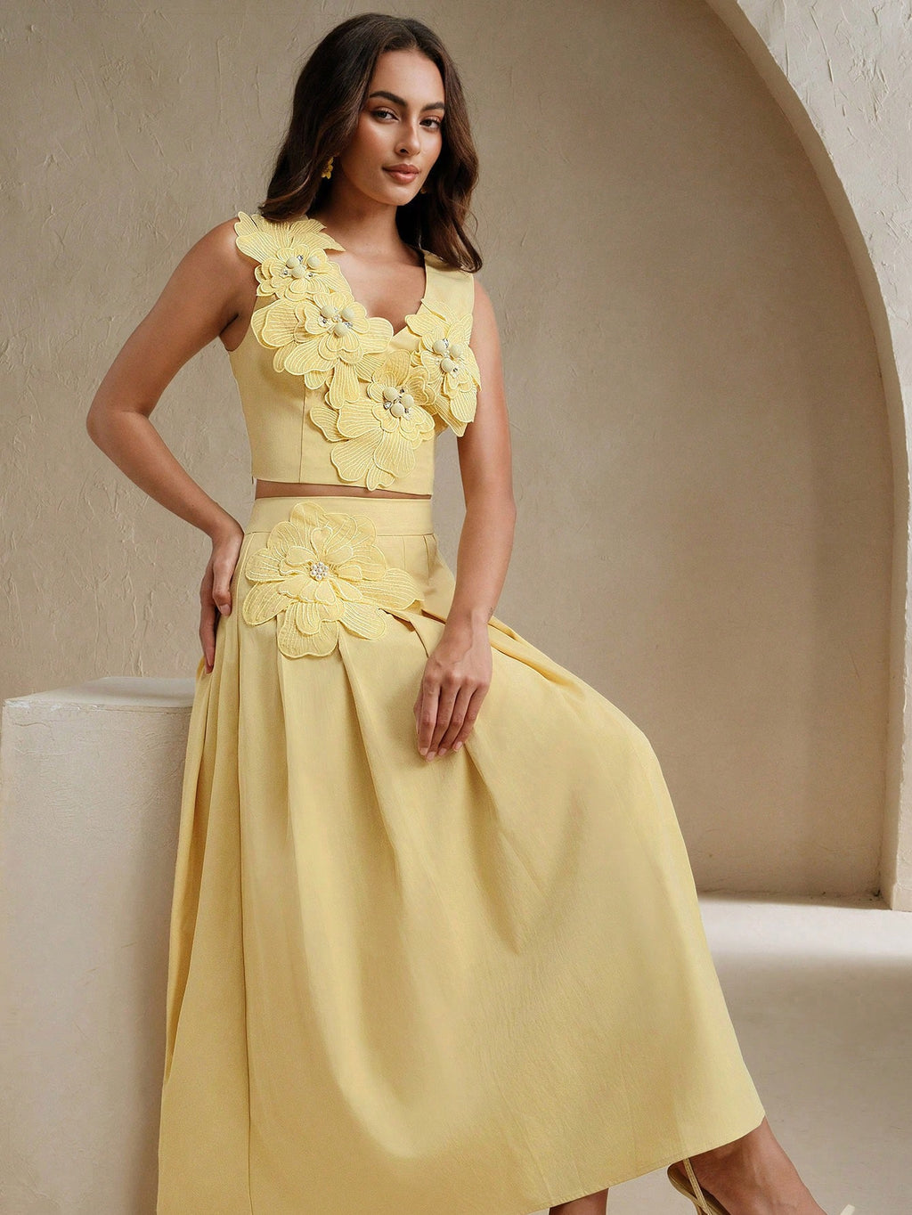 MIU Women Elegant 3D Flower Decor Camisole Top And Skirt 2 Pieces Set, Summer