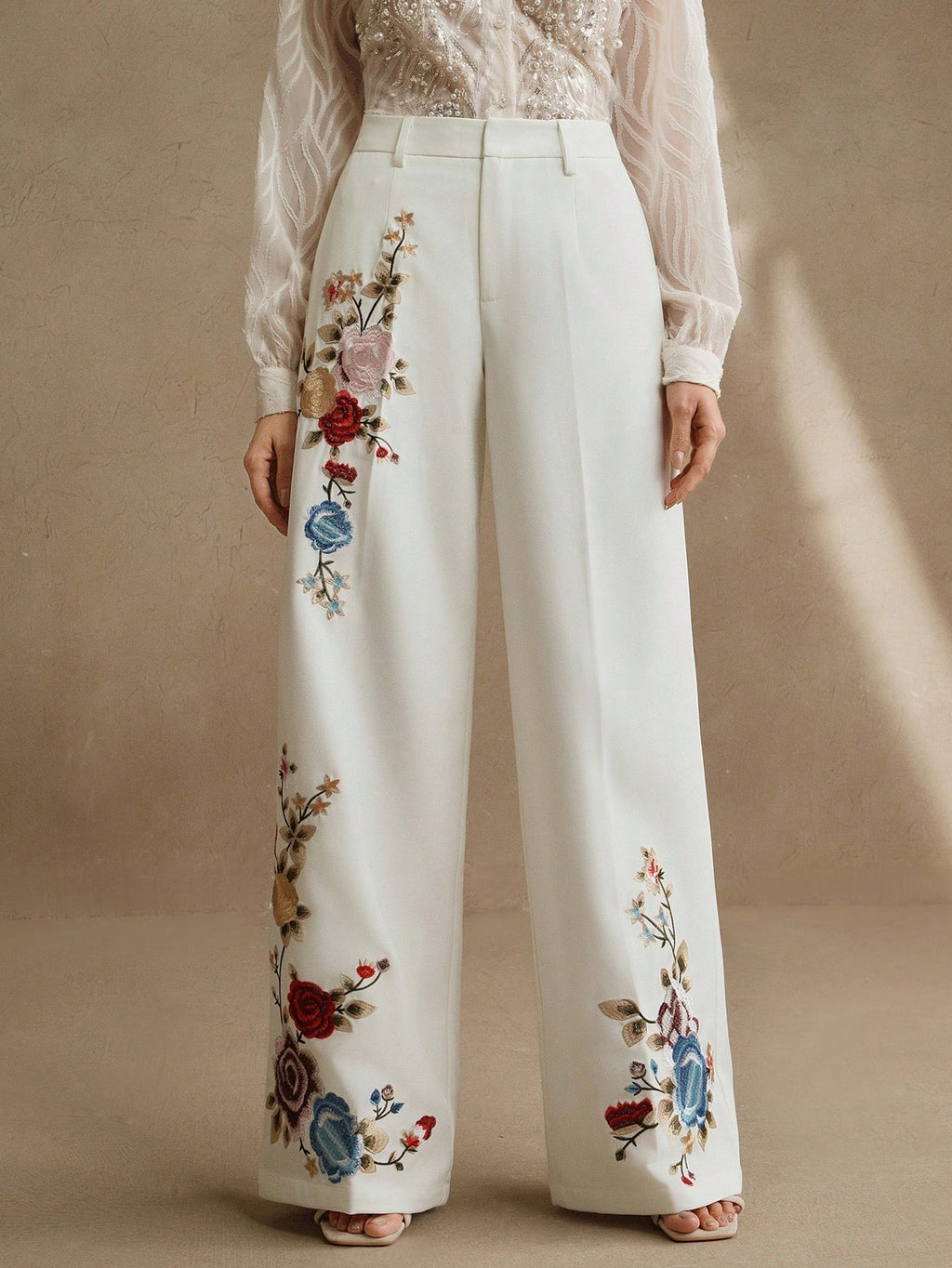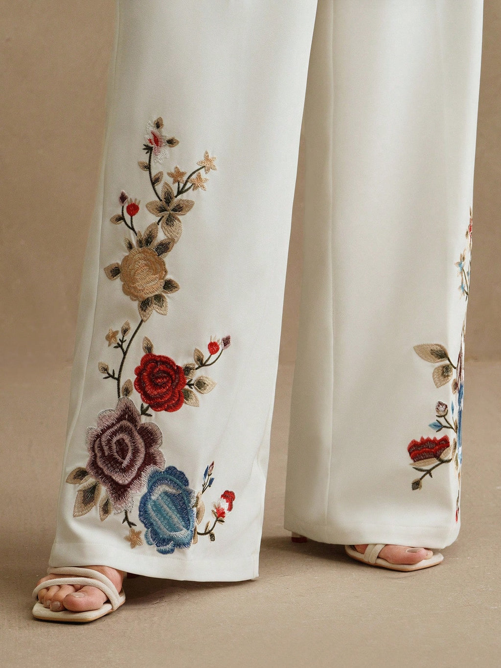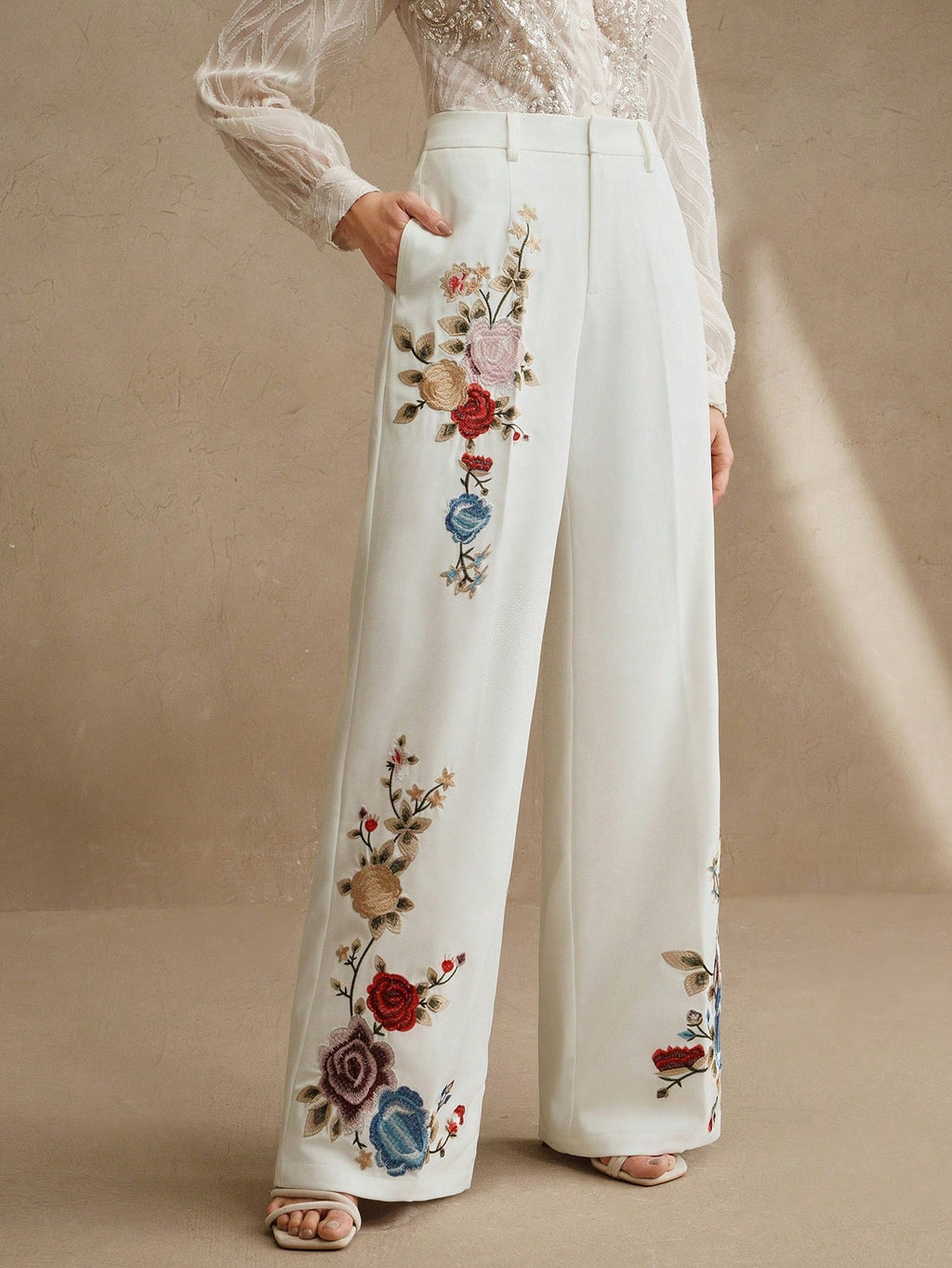 MIU Women Elegant Floral Embroidered Simple Versatile Dress Pants, Suitable For Spring, Summer, Festival, Graduation, Holiday, Casual And Classy Outfits