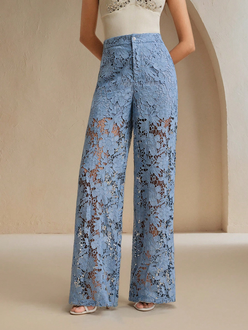 MIU Women Elegant Floral Lace Cutout Straight Leg Pants