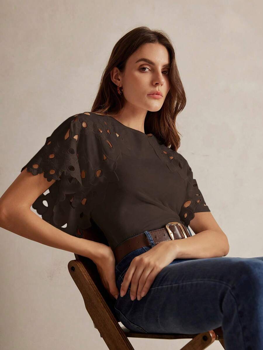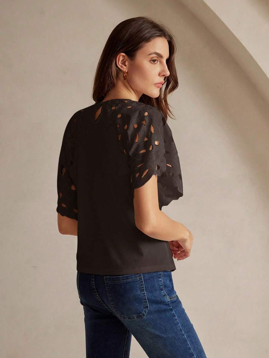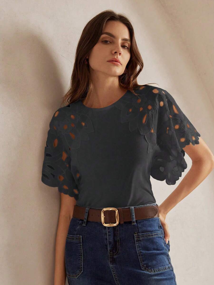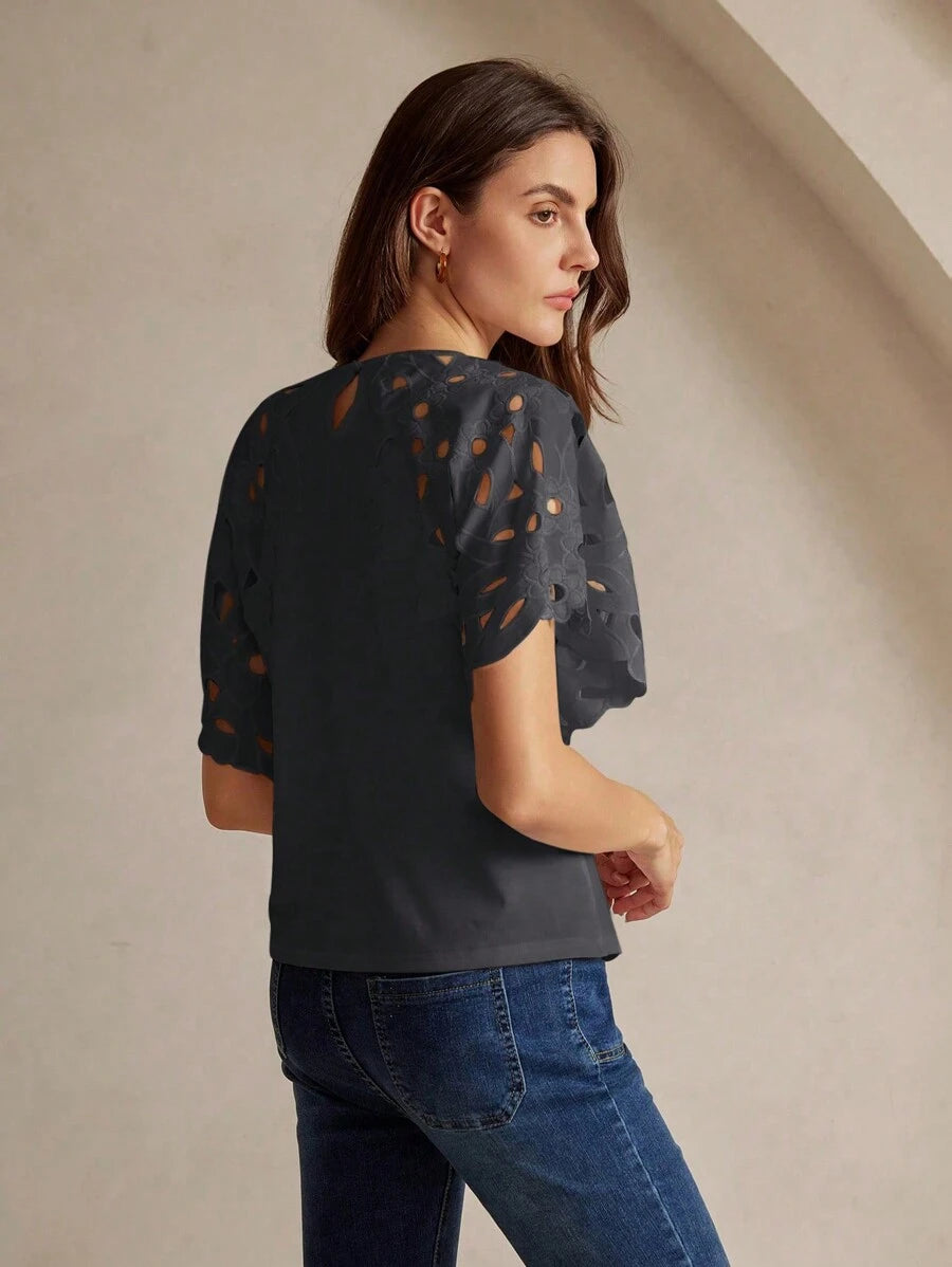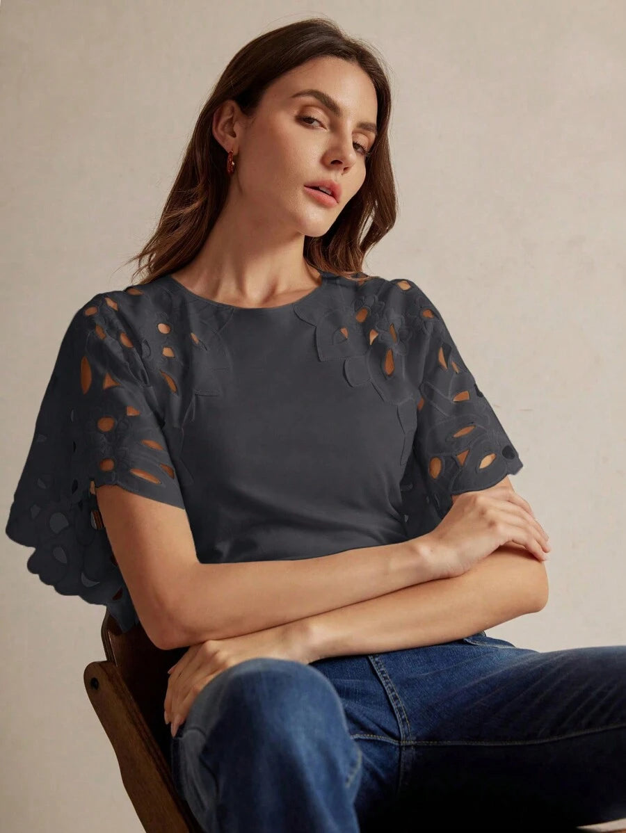 MIU Women Elegant Solid Color Hollow-Out Short Sleeve Fashion T-Shirt